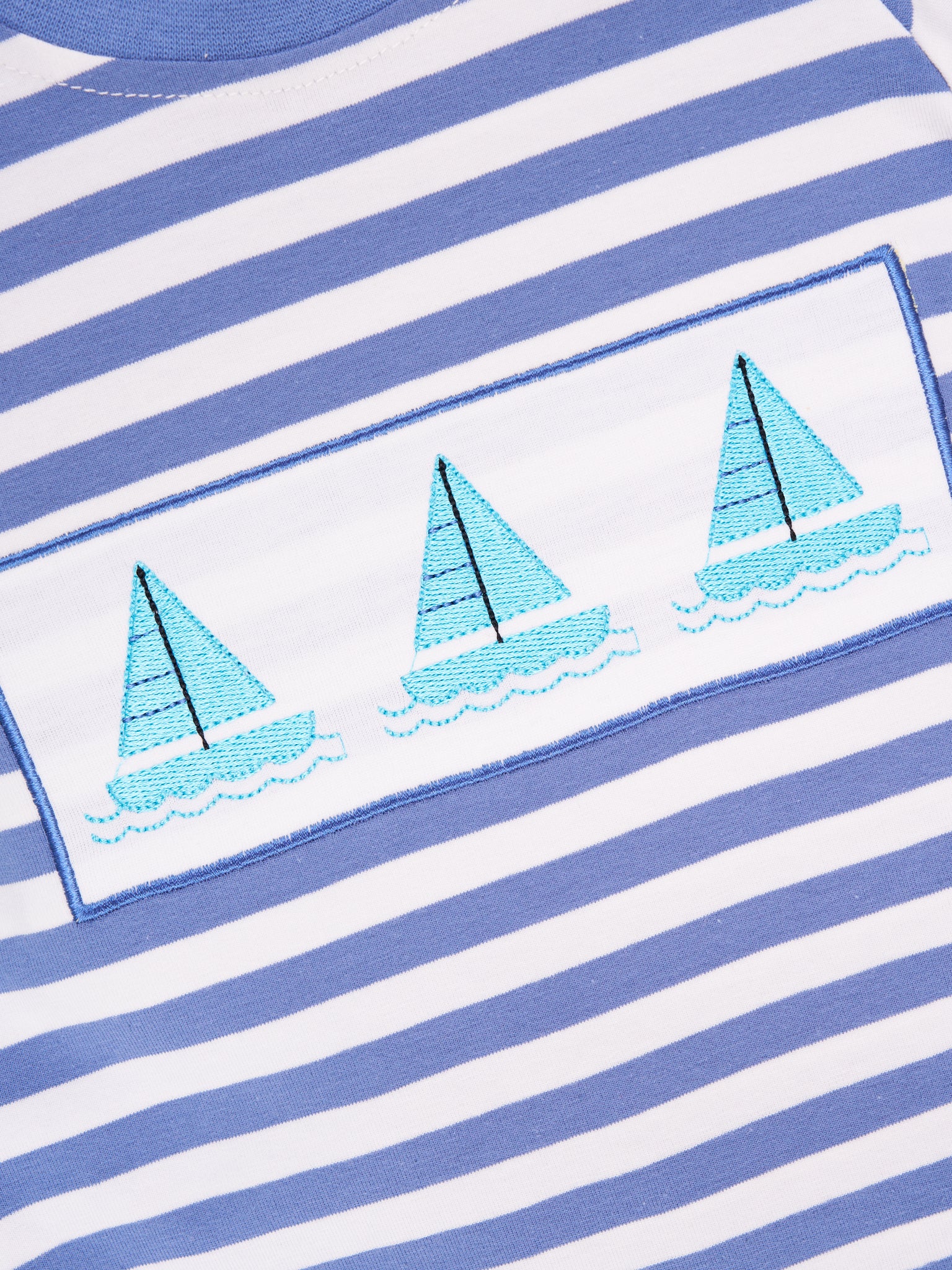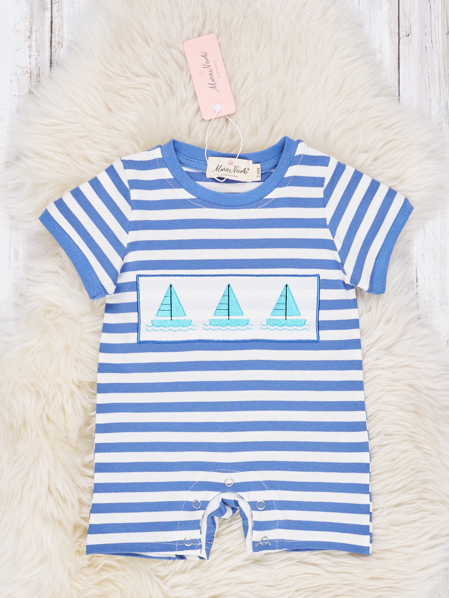 Ahoy there! Sail through your day with this cute n' quirky brother set! Featuring a smocked stripe romper with embroidered sailboats, it's perfect for adventurous kiddos and stylish parents alike!
