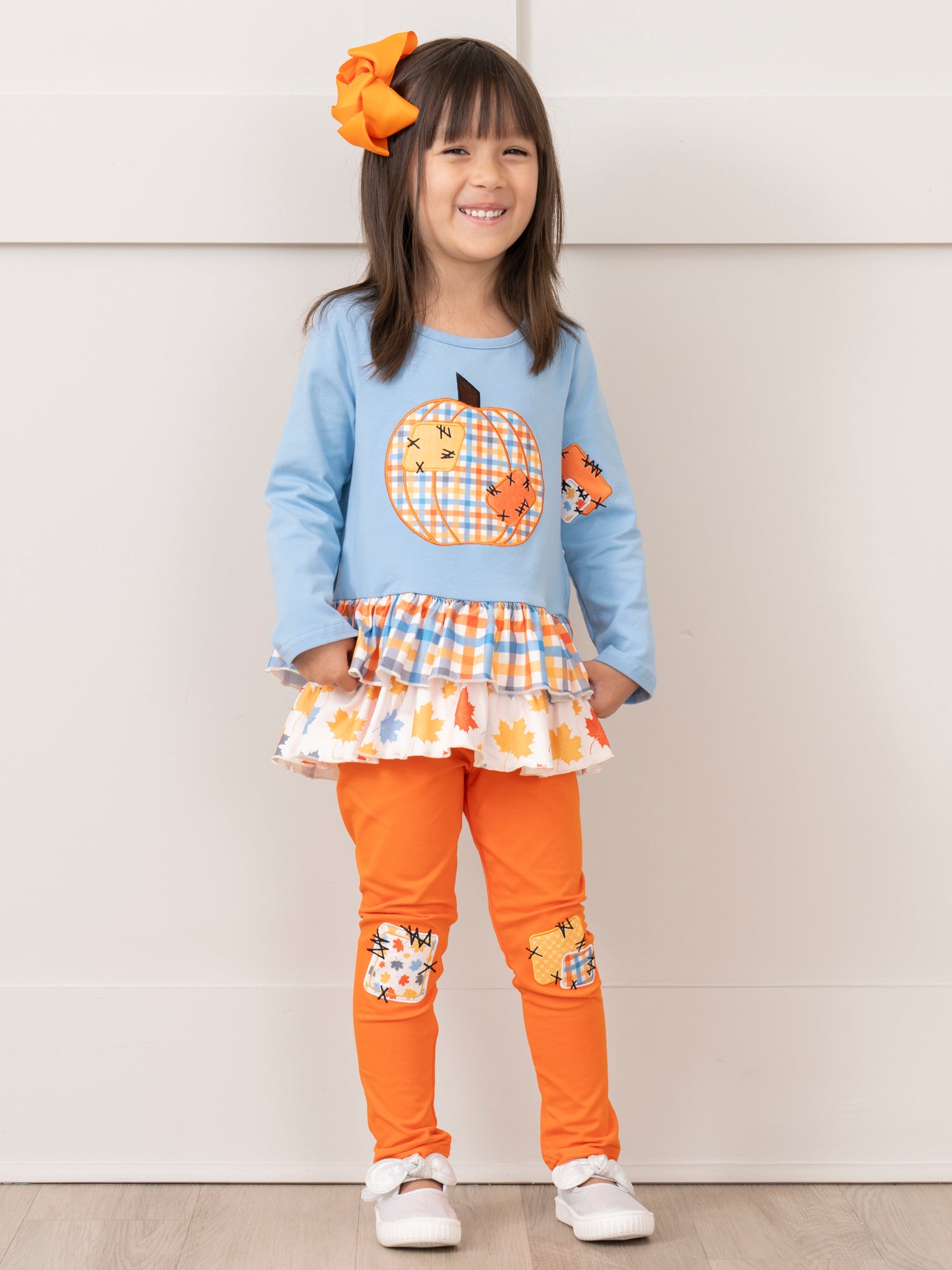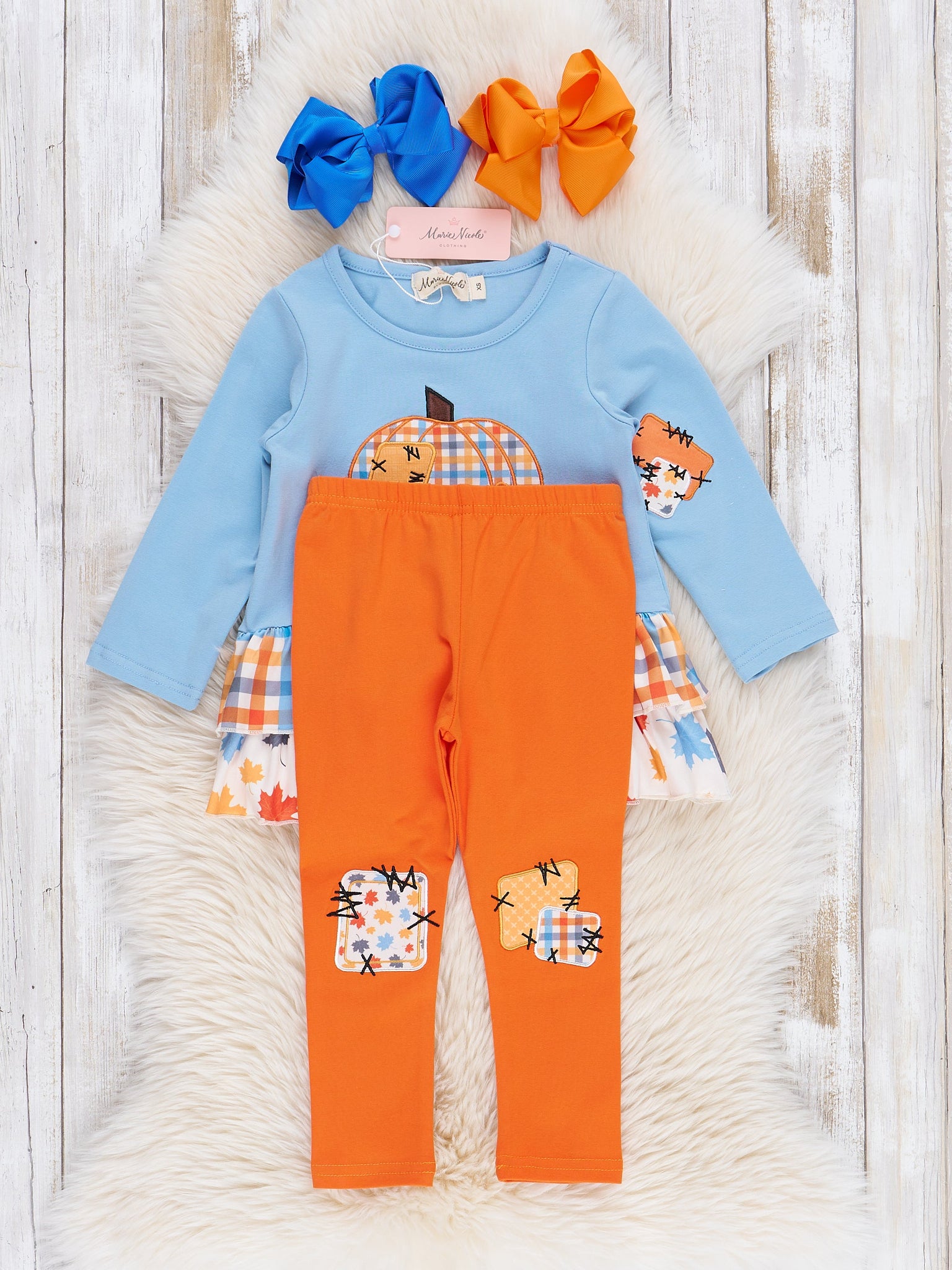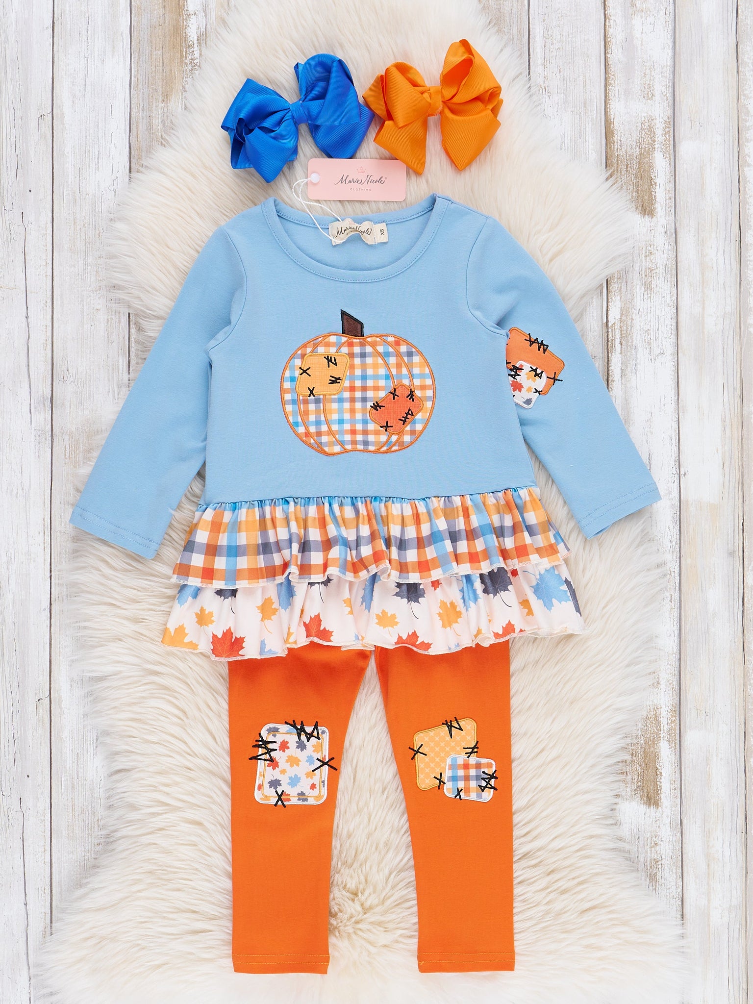 Soft Blue & Orange Gingham Patch Ruffle Outfit