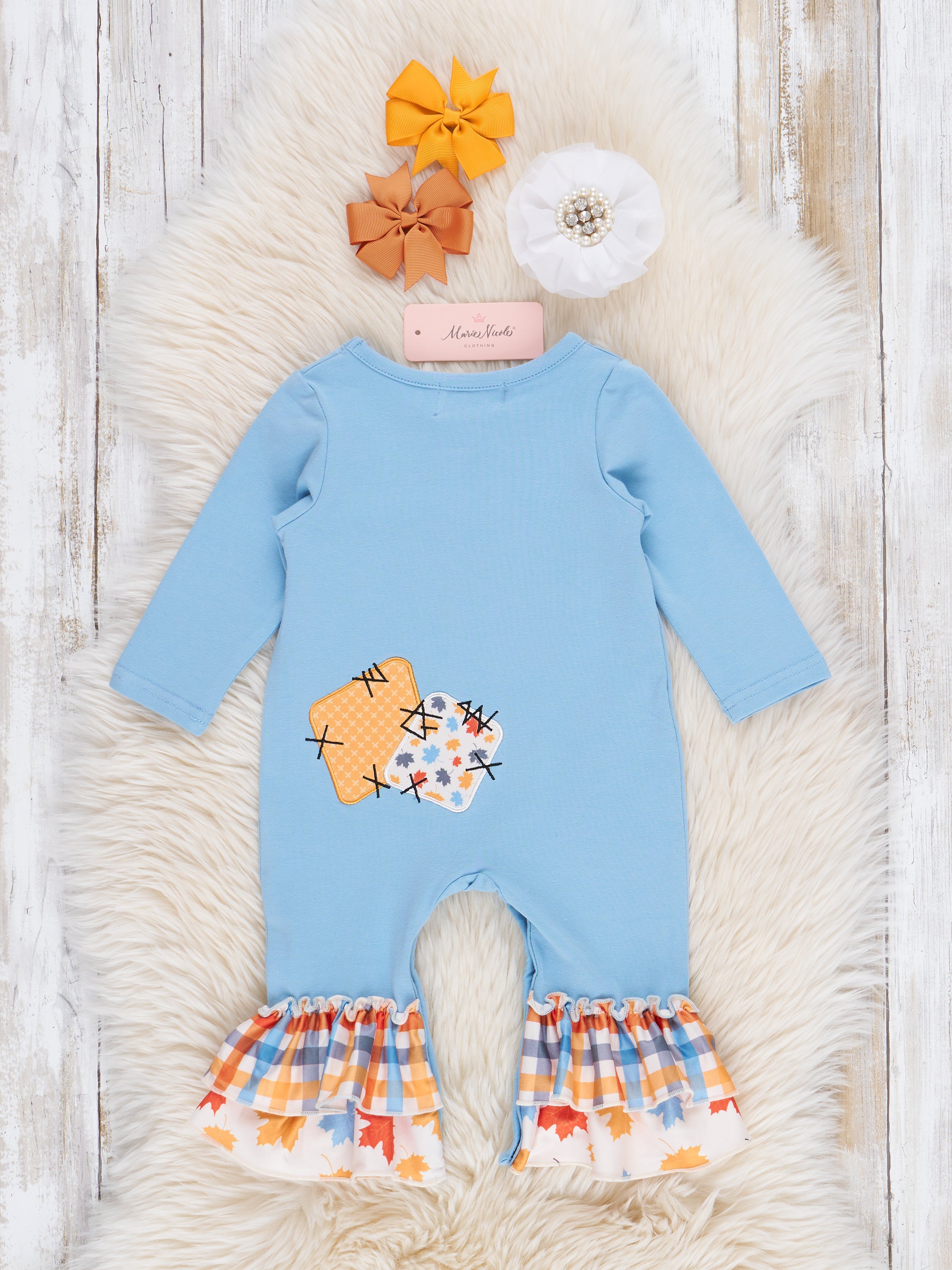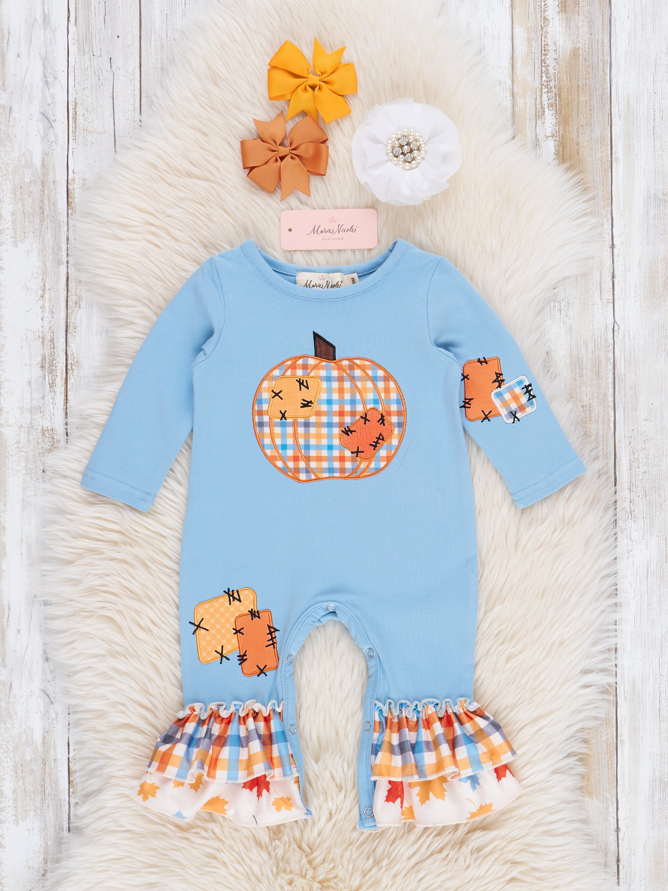 Soft Blue & Orange Gingham Patch Ruffle Romper