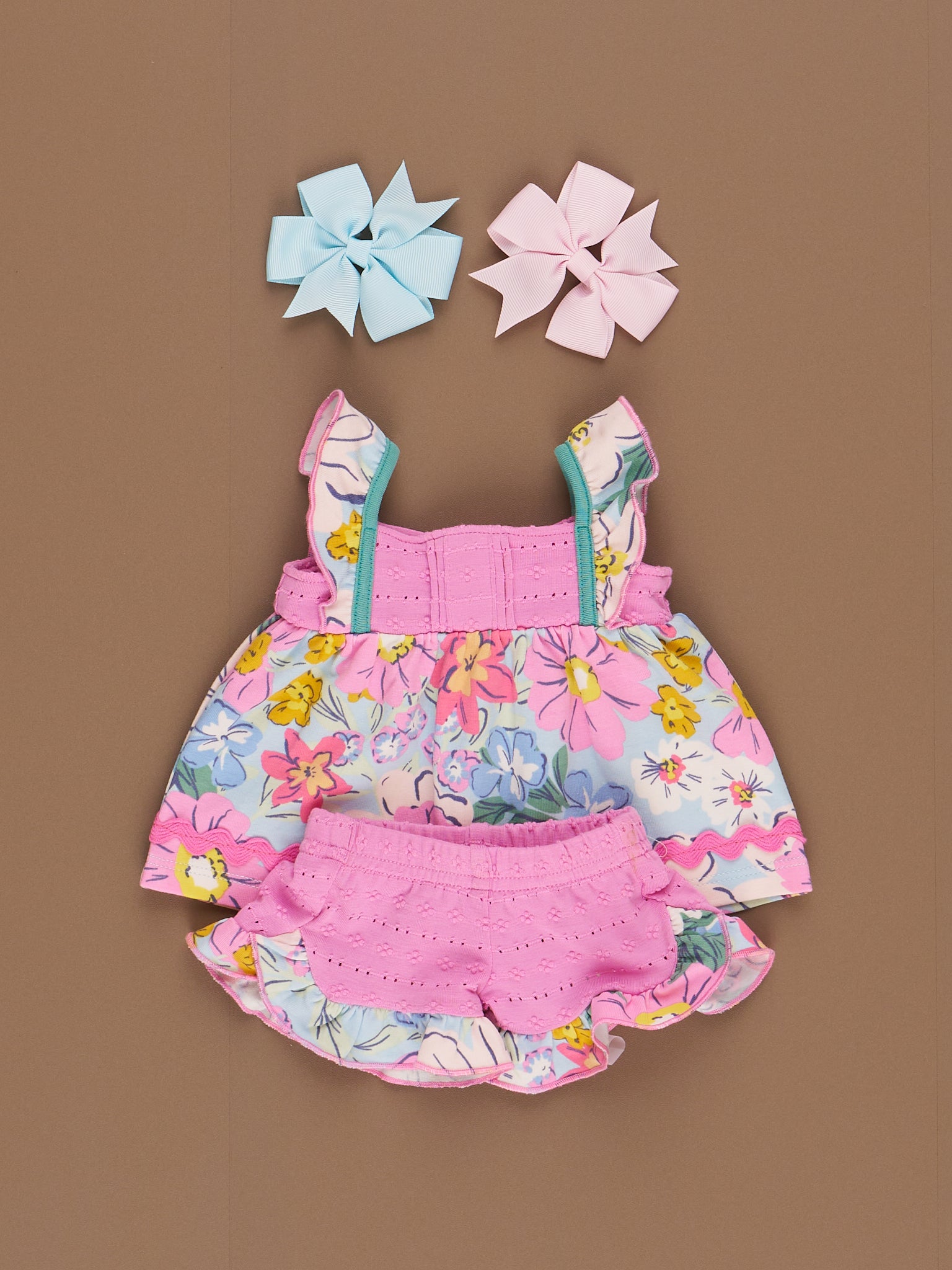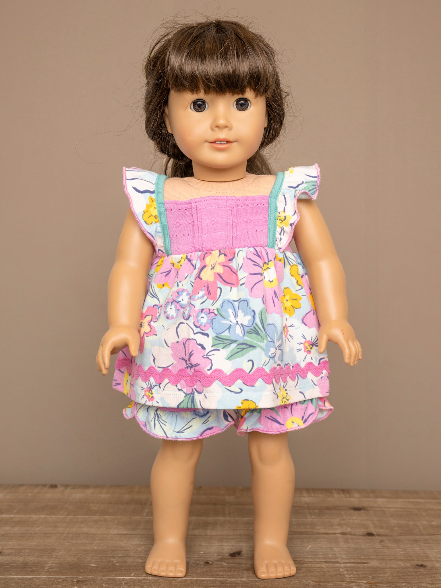 This sweet doll outfit matches our Southern Garden Girls' Ruffle Outfit and features a prairie style top with adorable ruffle details and floral print. The matching ruffle hem shorts complete the set with our Southern Garden print.