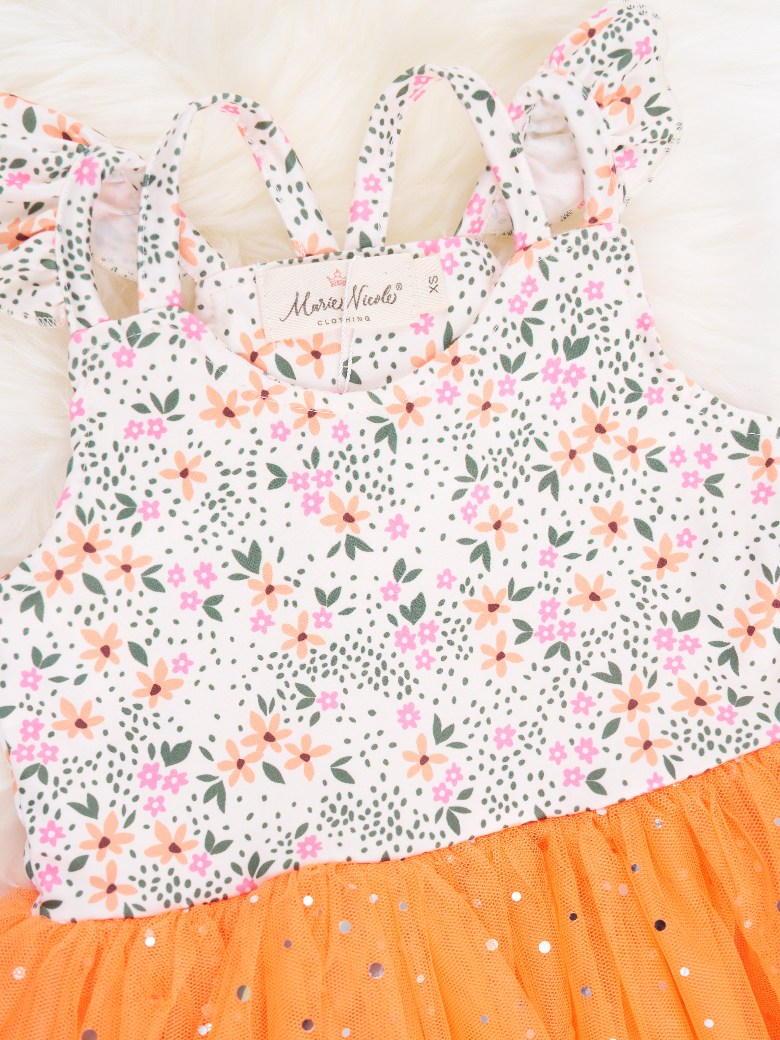 This Ditsy Floral Sparkly Tulle Dress is a delightful look for any little girl! The bright orange tulle skirt, fluttery sleeves, and dainty floral pattern are perfect for twirling and dancing. Sparkling with personality, this dress is fully lined for extra comfort. A real showstopper!
