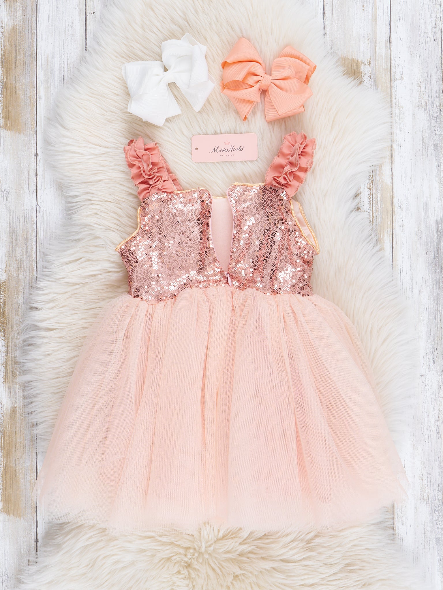 Watch your girls sparkle in this adorable tulle dress featuring a sequin top with ruffle sleeve detail, a fully lined glitter tulle skirt & a functioning zipper at the nape of the neck.