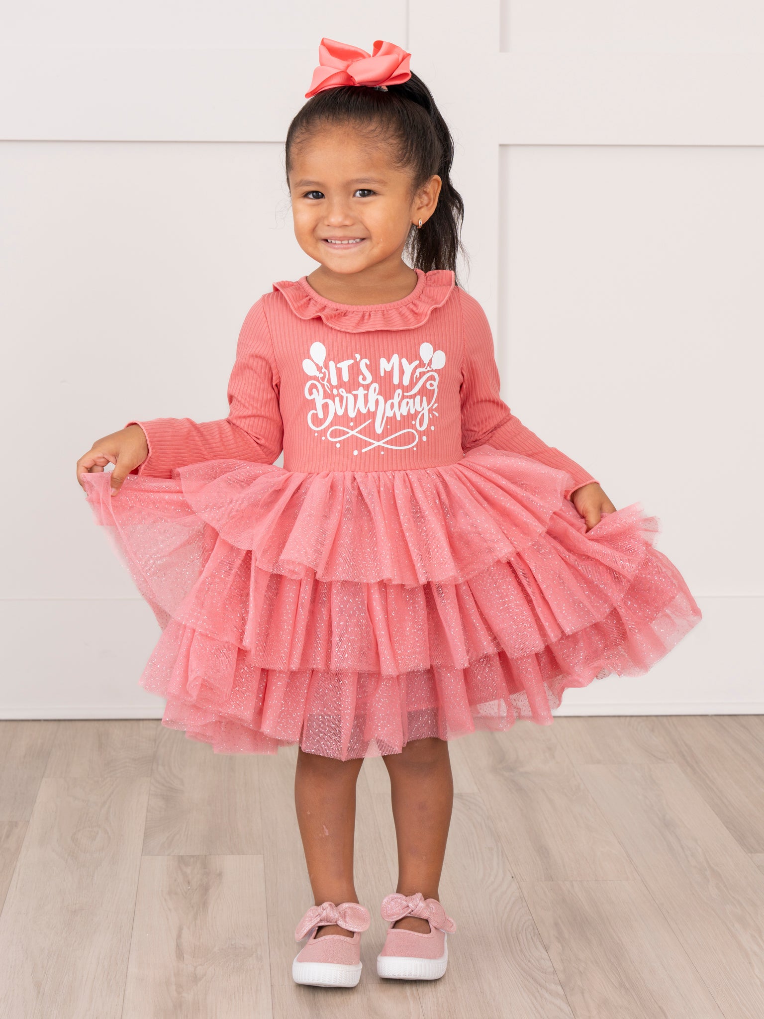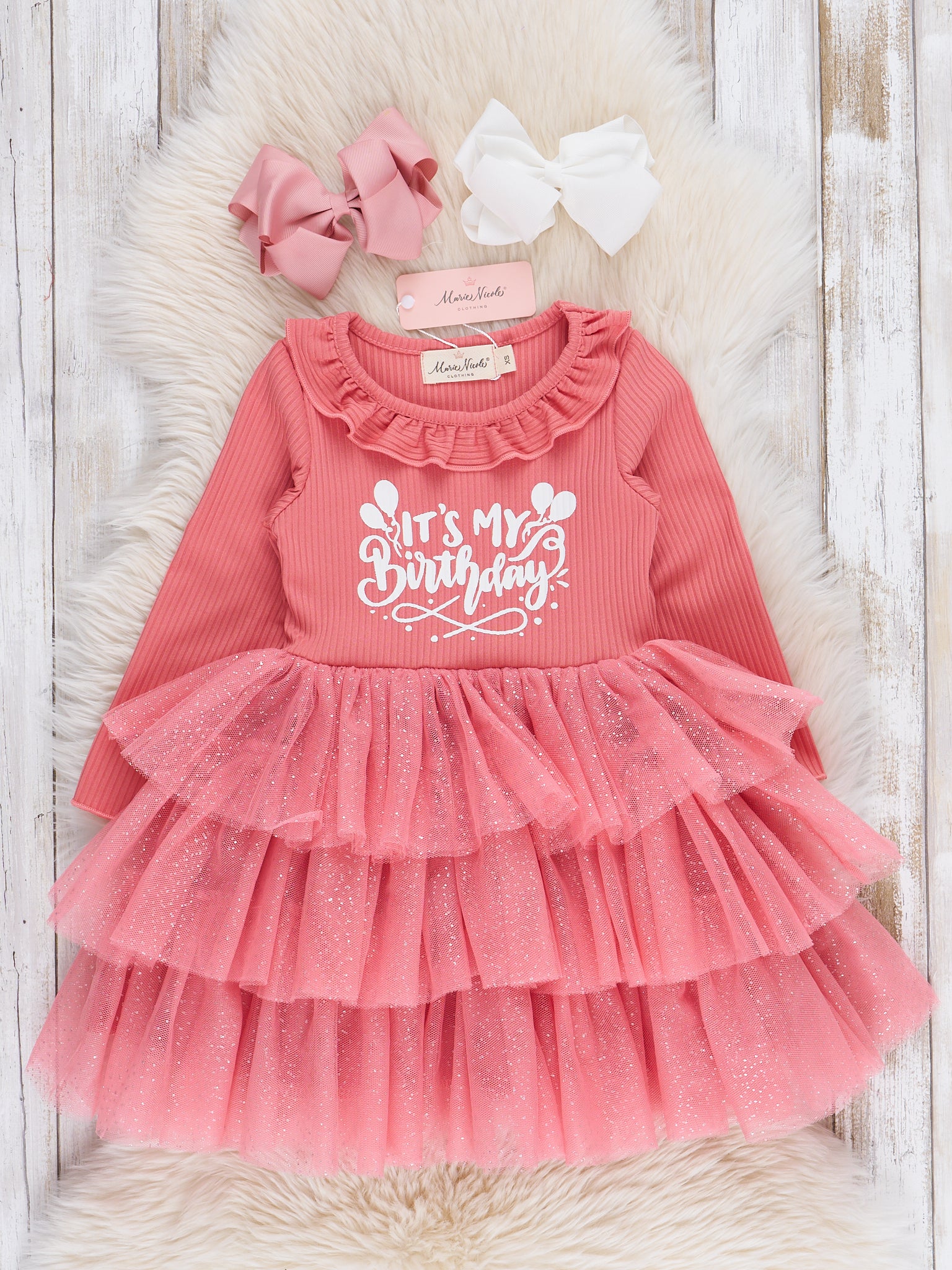 Celebrate in style with our Blush Tiered Tulle Birthday Dress! Perfect for a birthday princess, this girls dress features a ribbed bodice and a tiered tulle skirt for twirl-worthy fun. With the playful phrase "It's My Birthday" on the front, this dress is sure to make her feel extra special on her special day.