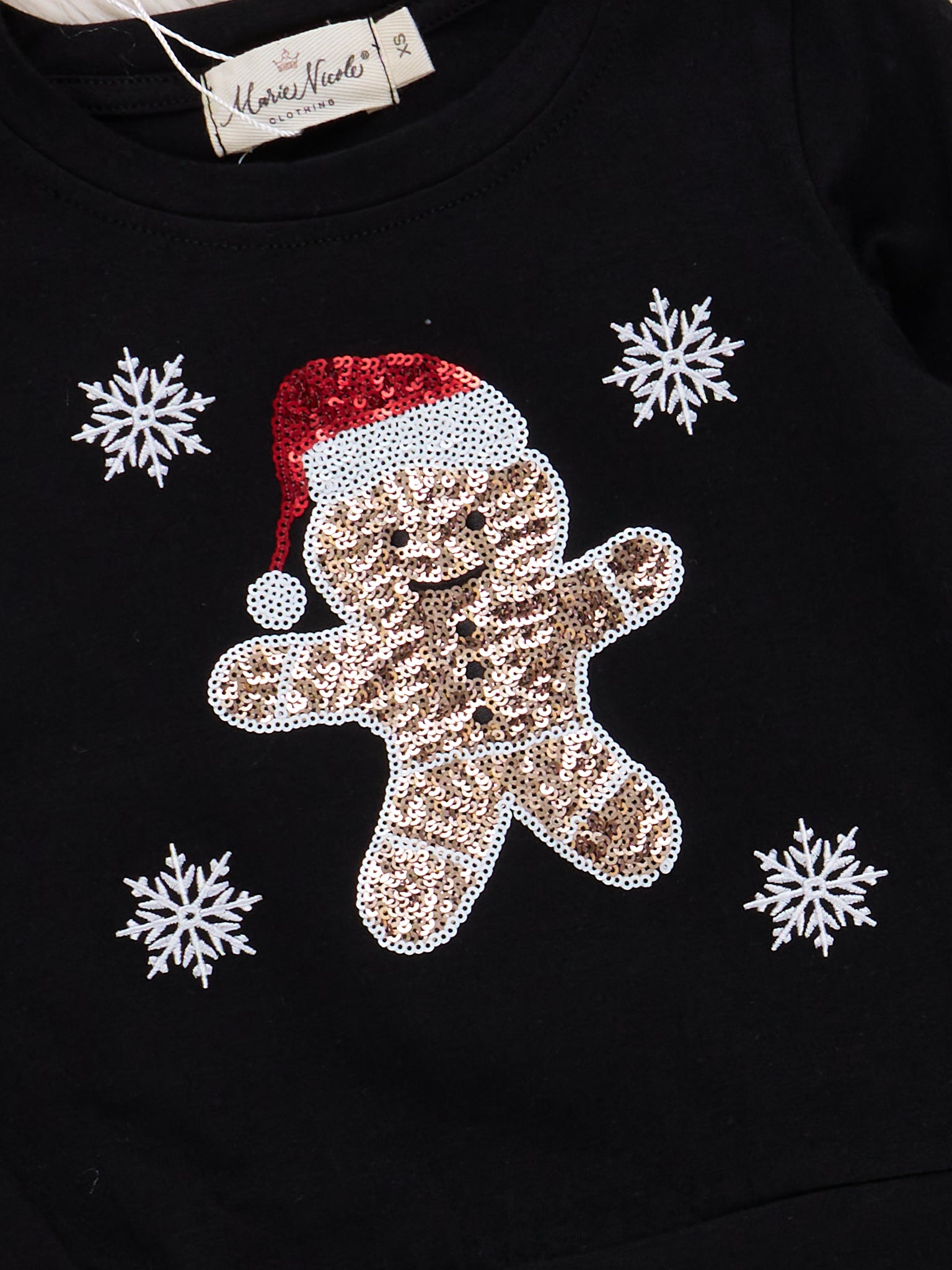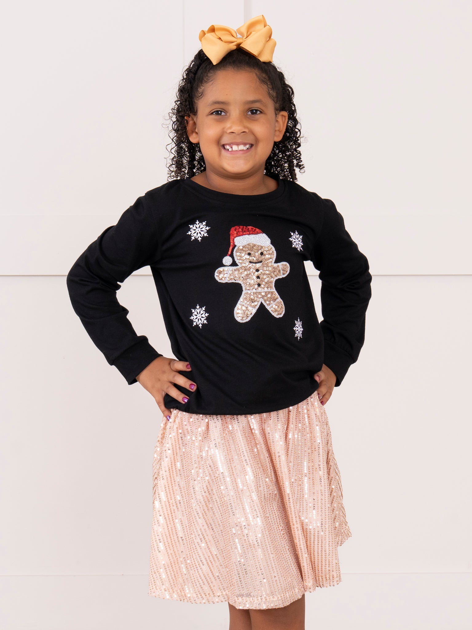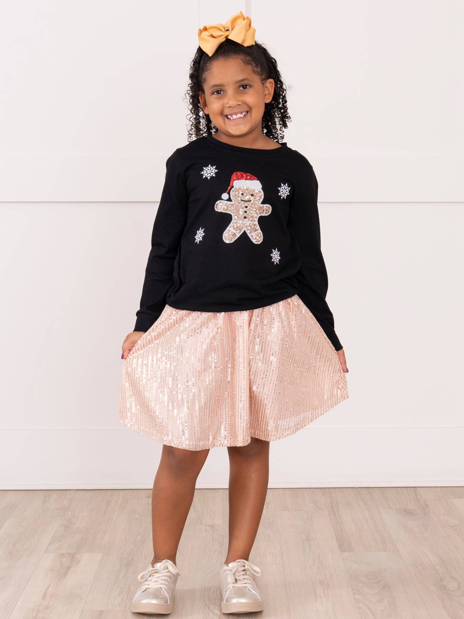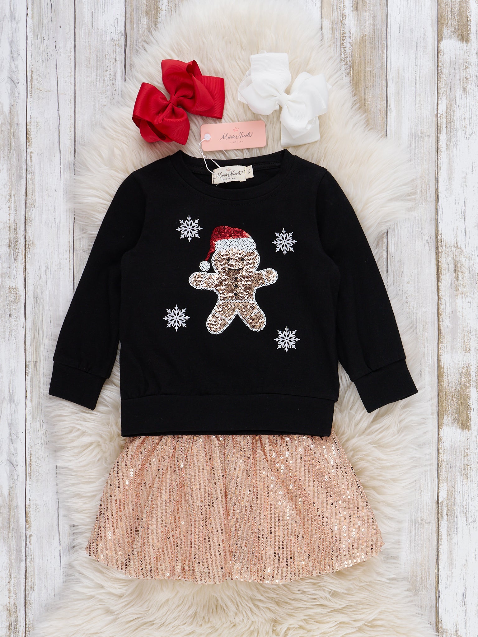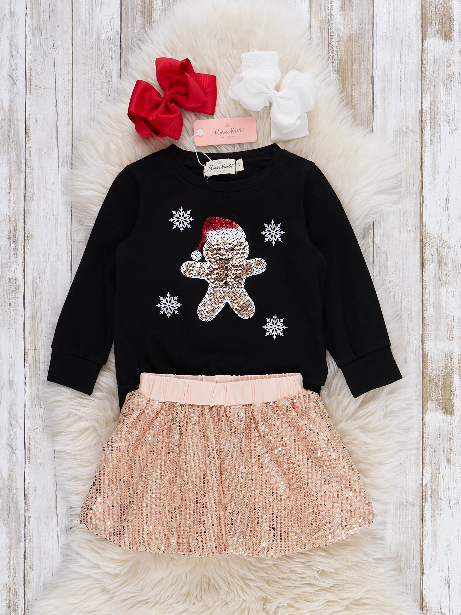 The Gingerbread Sparkle Outfit by Marie Nicole Clothing features a festive long-sleeve top with an adorable gingerbread character and shimmering sequin details, paired with a sparkling sequin skirt. This cheerful holiday set is designed to dazzle at Christmas parties, family photos, and special seasonal celebrations, blending playful charm and festive glam.
