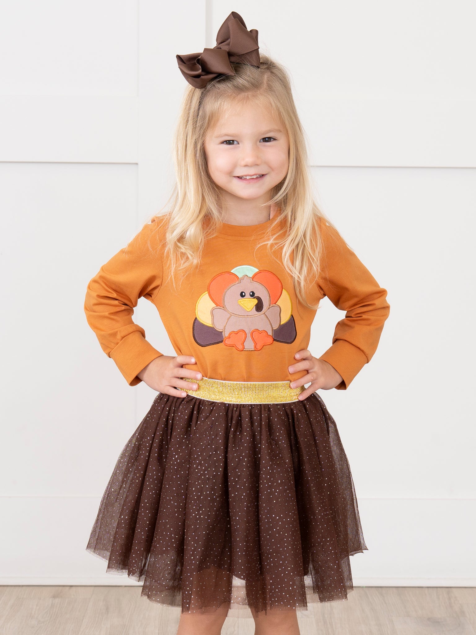 This playful outfit is perfect for your little turkey! Featuring an embroidered turkey and deep brown tulle skirt, it's a stylish choice for any occasion. Plus, it's part of our sibling set collection for a fun matching look. Gobble it up before it's gone!