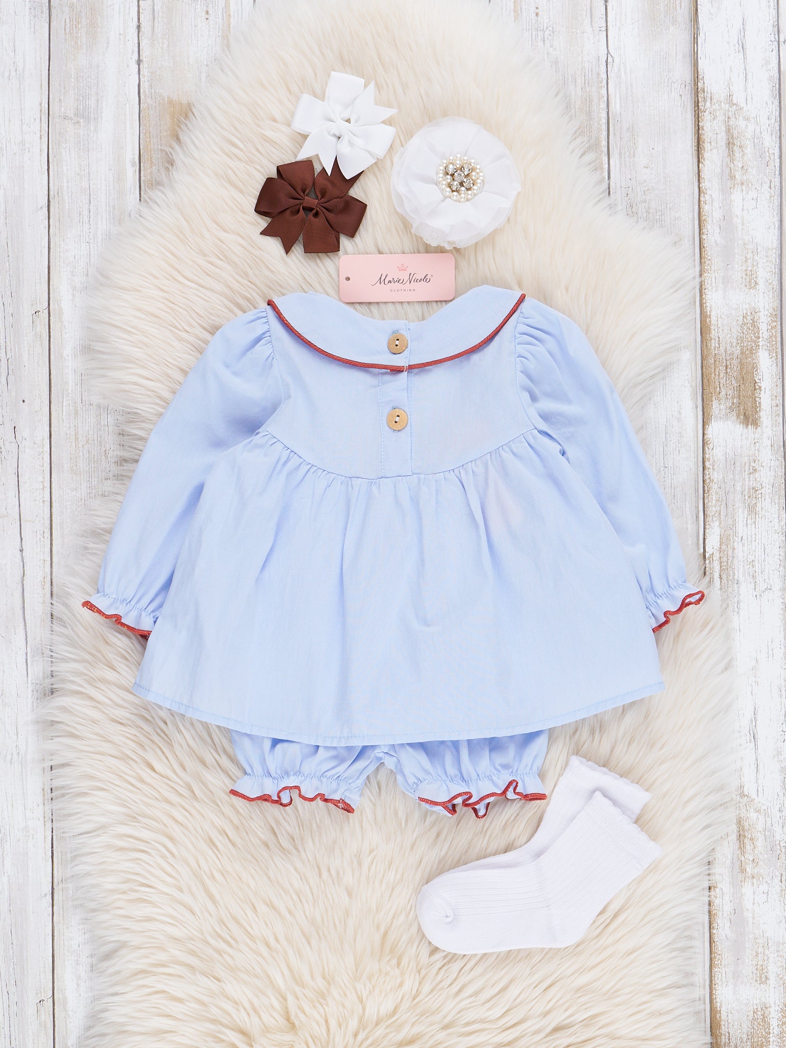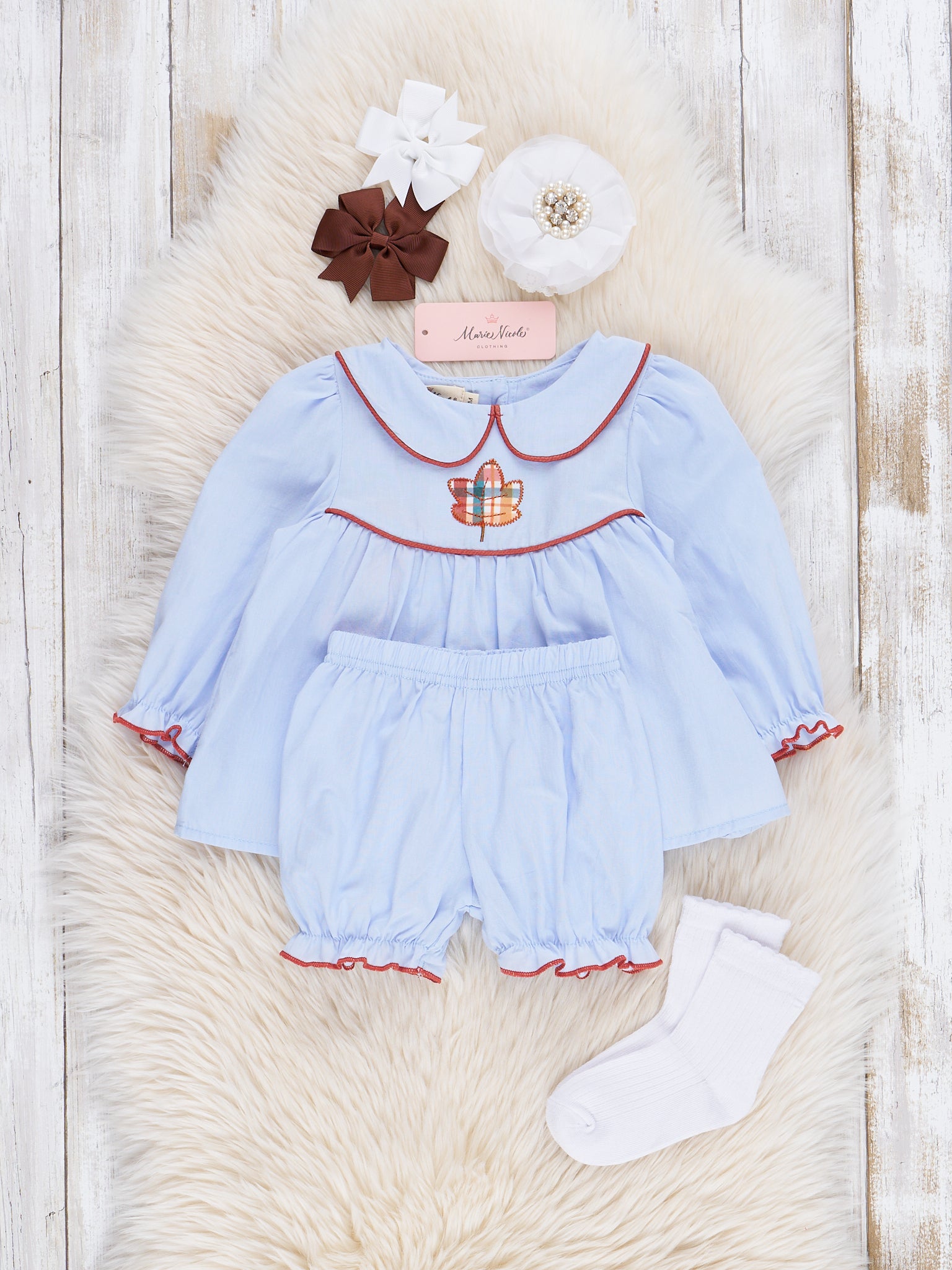 Your little will fall in leaf with this adorable Chambray Embroidered Leaf Bloomers Outfit. Made of 100% cotton blue chambray fabric, it features a charming peter pan collar and cute embroidered plaid leaf design. Perfect for sisters to twirl around in together!