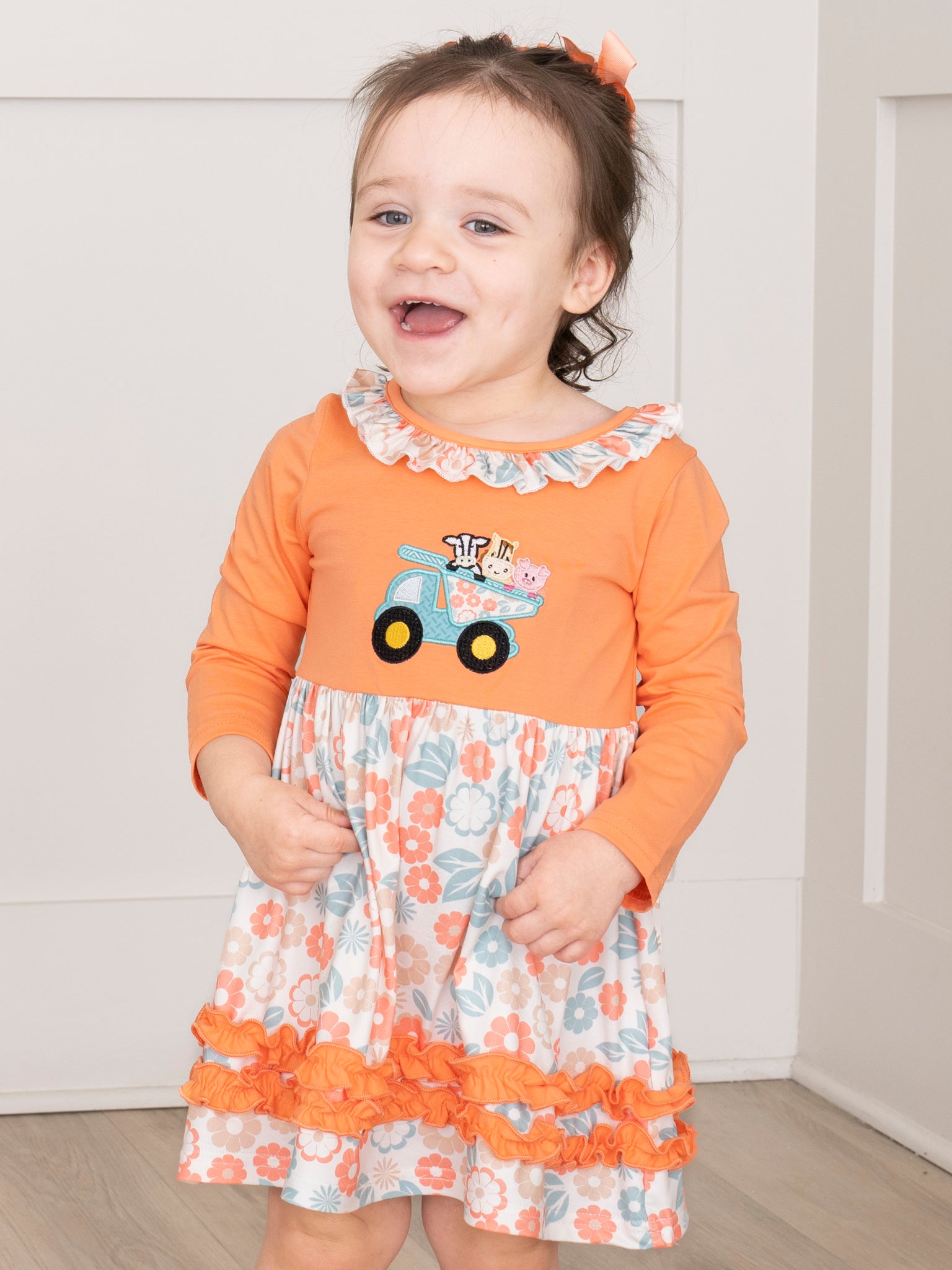 The Embroidered Farm Animal Dump Truck Dress is a playful and charming choice for little ones who love farm fun and big trucks. Featuring adorable farm animal embroidery alongside a cheerful dump truck design, this dress from Marie Nicole Clothing blends whimsical details with comfortable, breathable fabric. Perfect for playdates, family outings, or any day she wants to bring a little farmyard adventure wherever she goes.