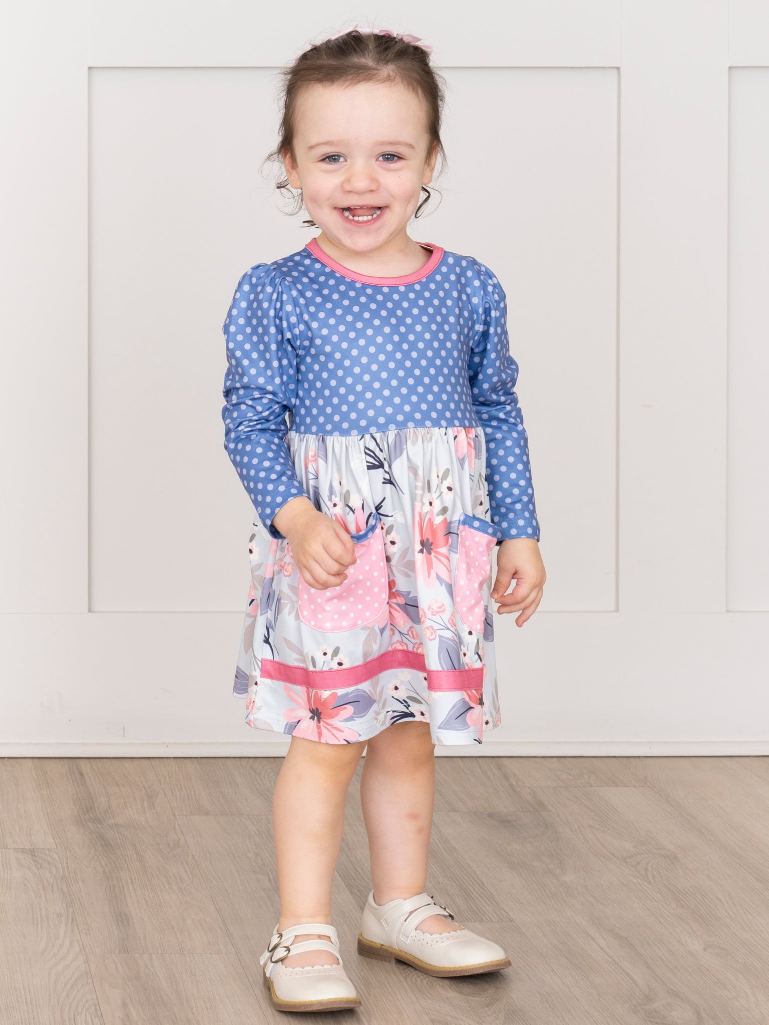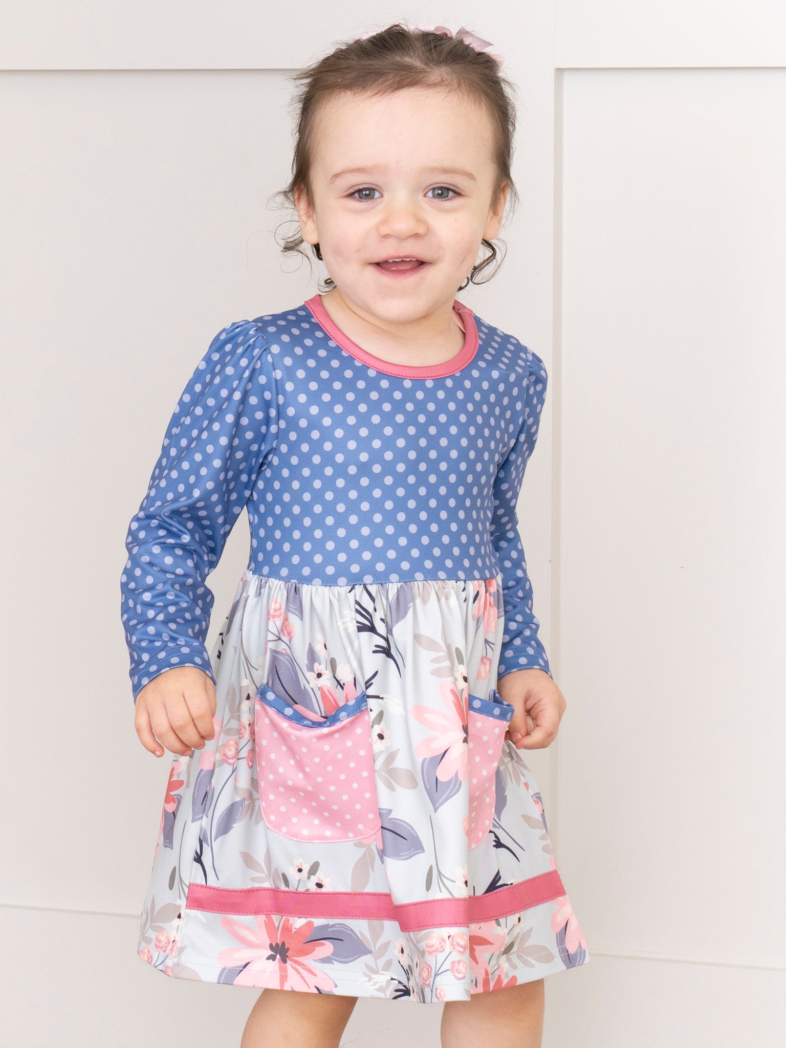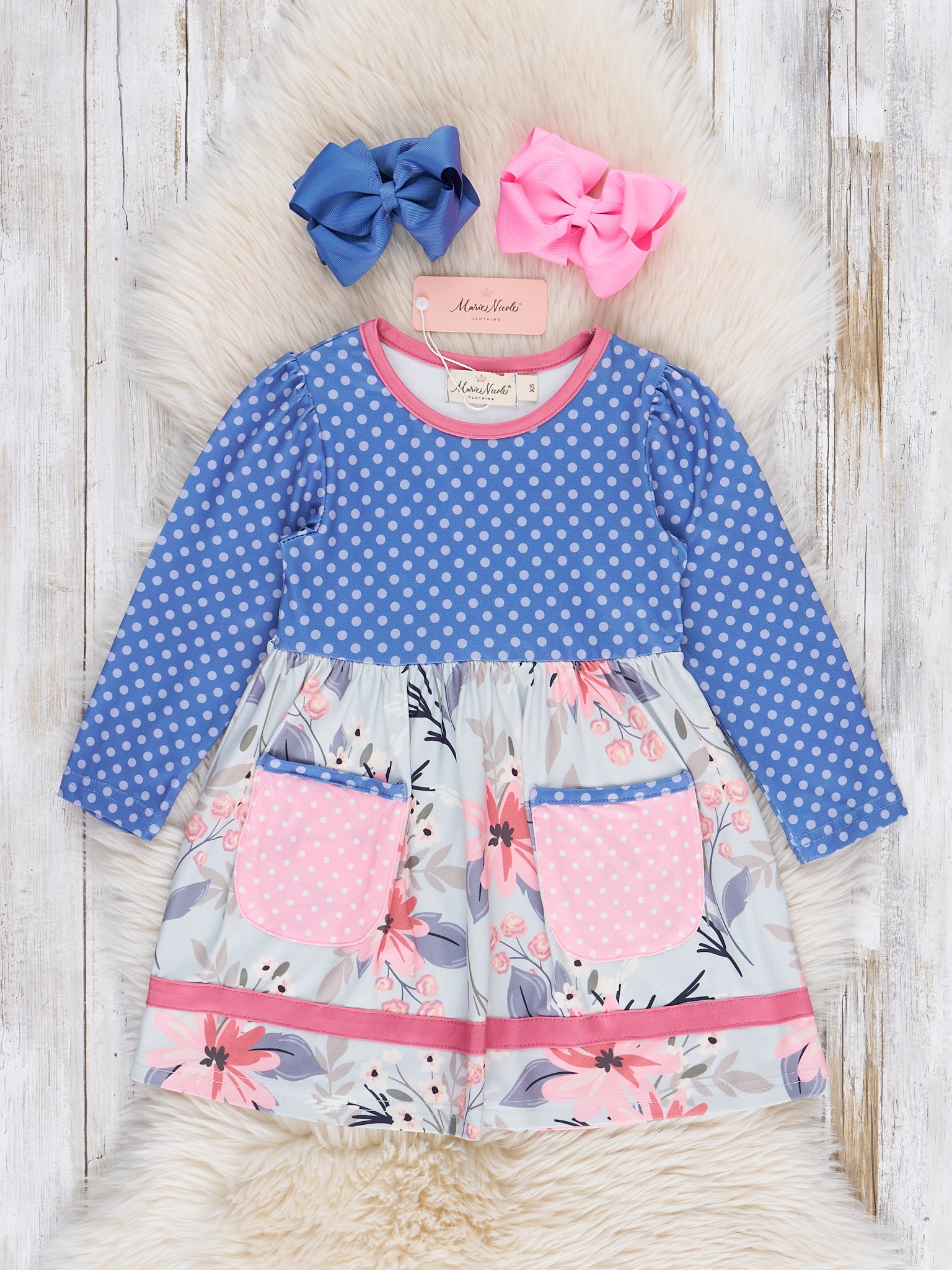 The Polka Dot Pocket Floral Dress in Blue is a sweet and playful choice that’s perfect for sunny days and special occasions. Featuring a charming mix of classic polka dots and delicate floral prints, this dress from Marie Nicole Clothing blends timeless style with fresh, garden-inspired whimsy. Finished with a convenient pocket and made from soft, breathable fabric, it’s ideal for twirls, playdates, and picture-perfect moments.