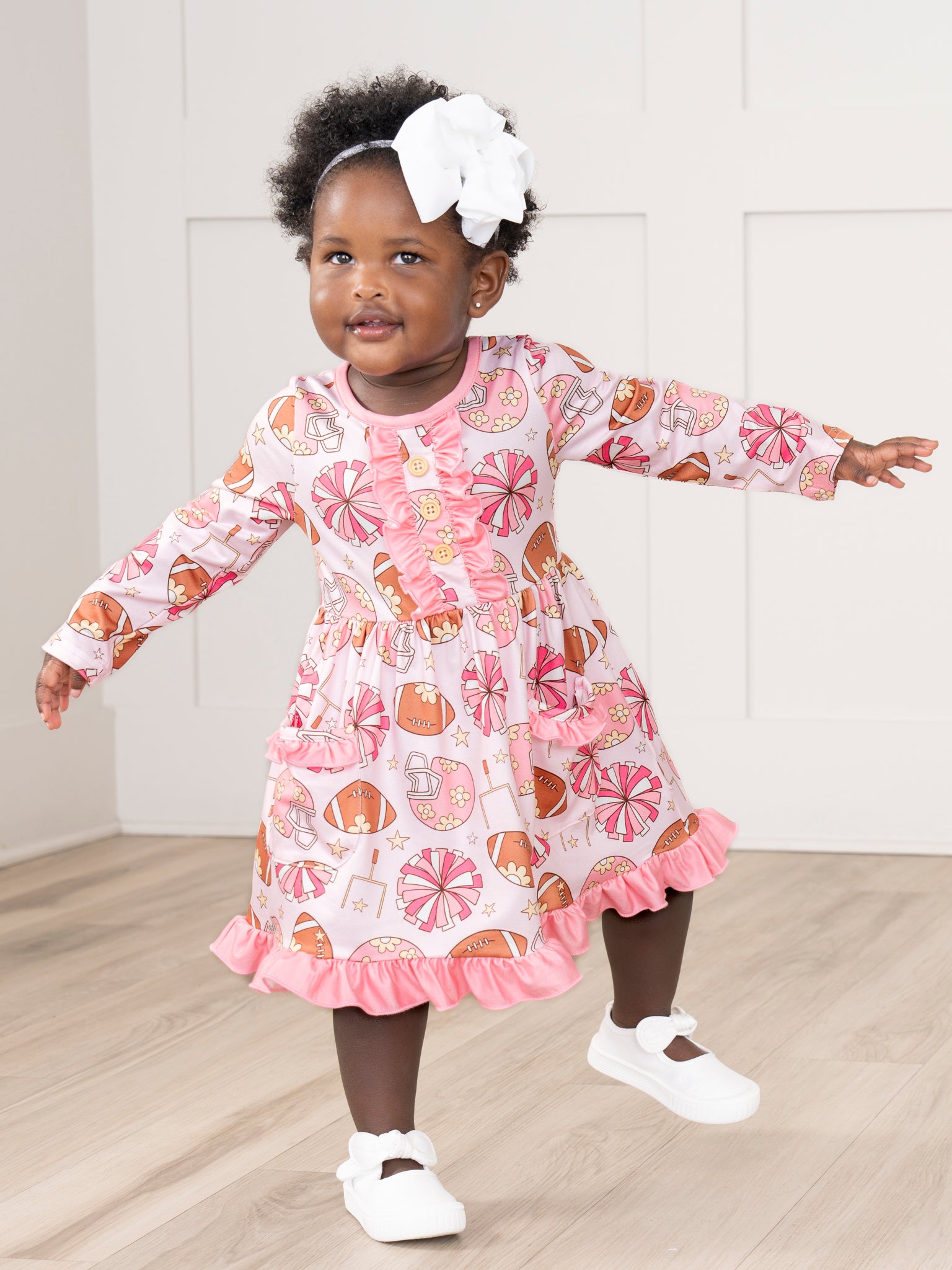 Time to cheer! The Sassy Snap Ruffle Dress, covered in a playful pattern of poms poms, footballs, and helmets, is the perfect piece for anyone excited for game day. With ruffle details and comfy, loose fabric, this piece by Marie Nicole Clothing, your little girl will love to jump and cheer in this dress!