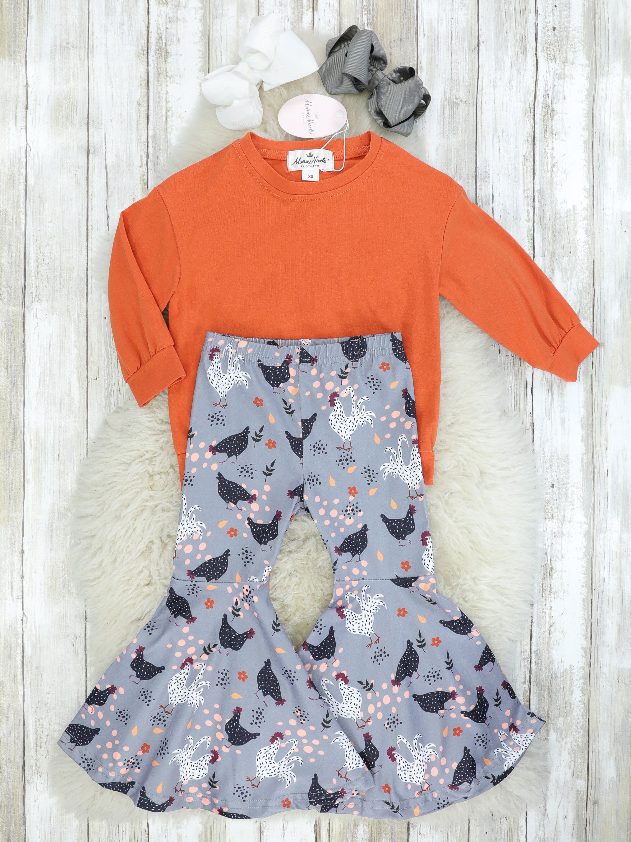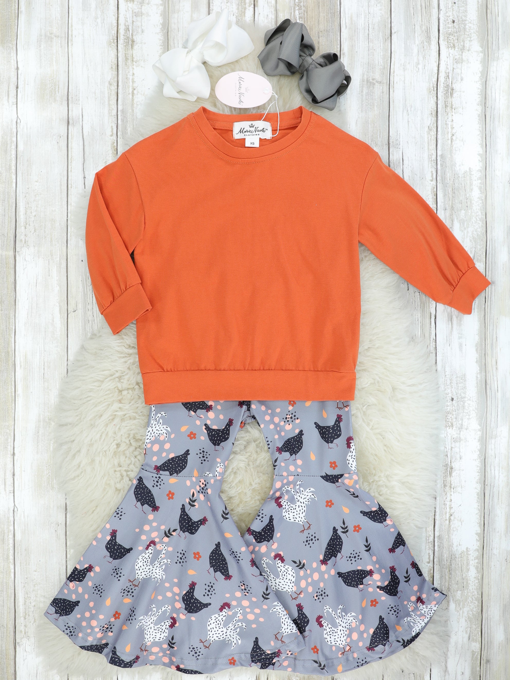 Orange Long Sleeve & Spotted Chicken Bell Bottoms Outfit