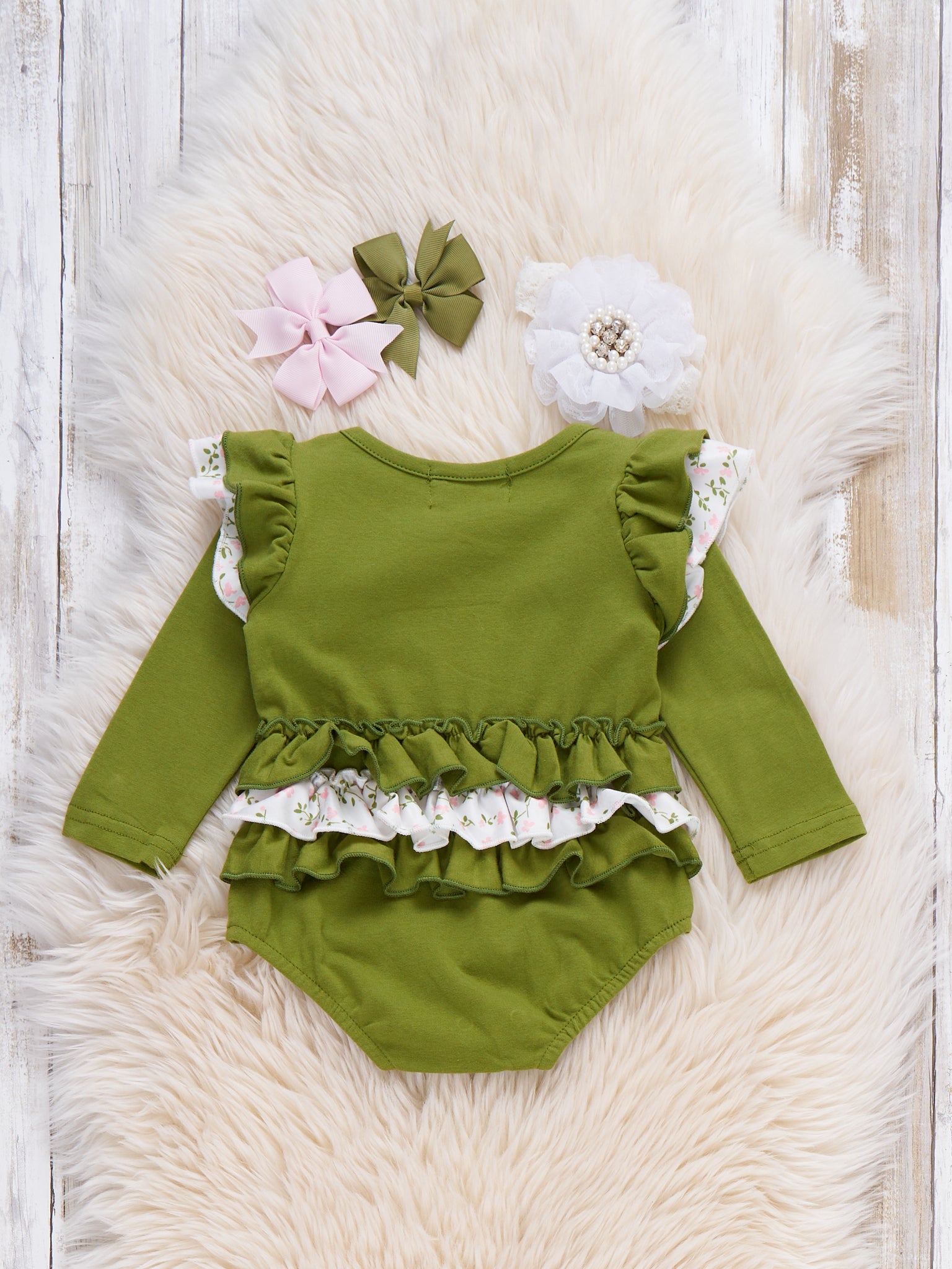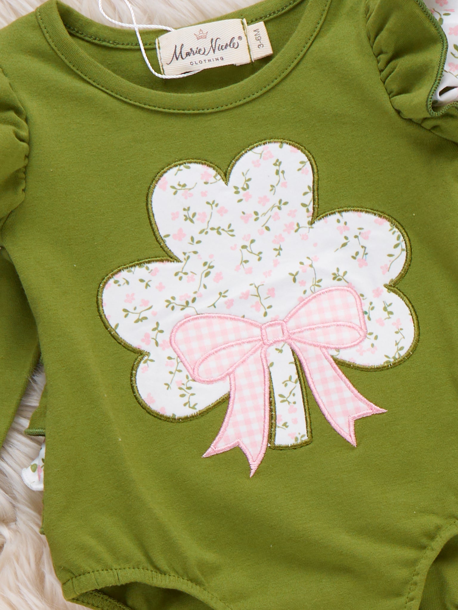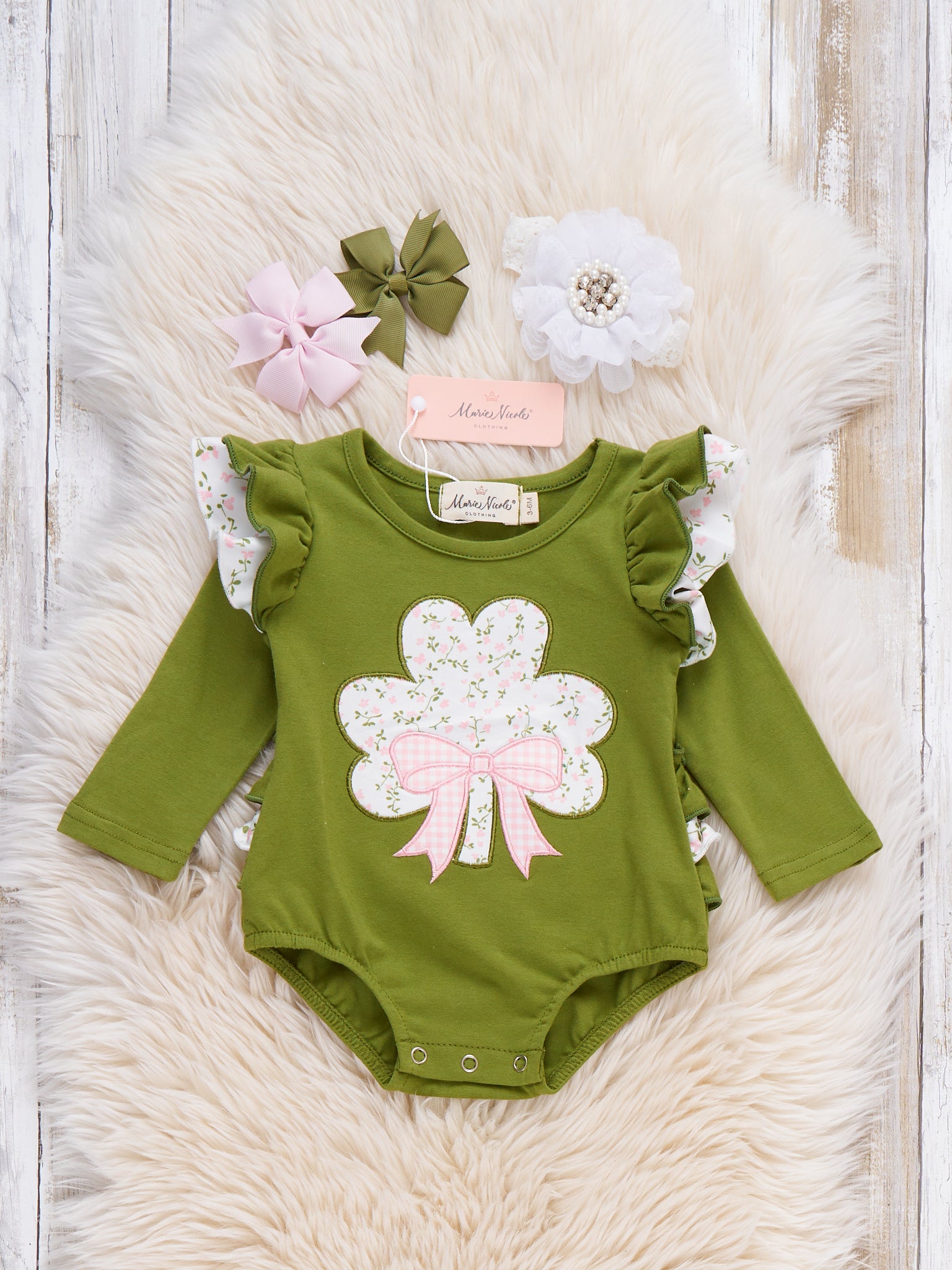 The Bow Blessings Shamrock Embroidered Romper by Marie Nicole Clothing brings together charm and festive spirit. Featuring sweet ruffled accents and a beautifully detailed shamrock topped with a bow, this romper is perfect for St. Patrick’s Day celebrations or adding a lucky touch to everyday adventures. Designed with comfort and style for your little blessing.