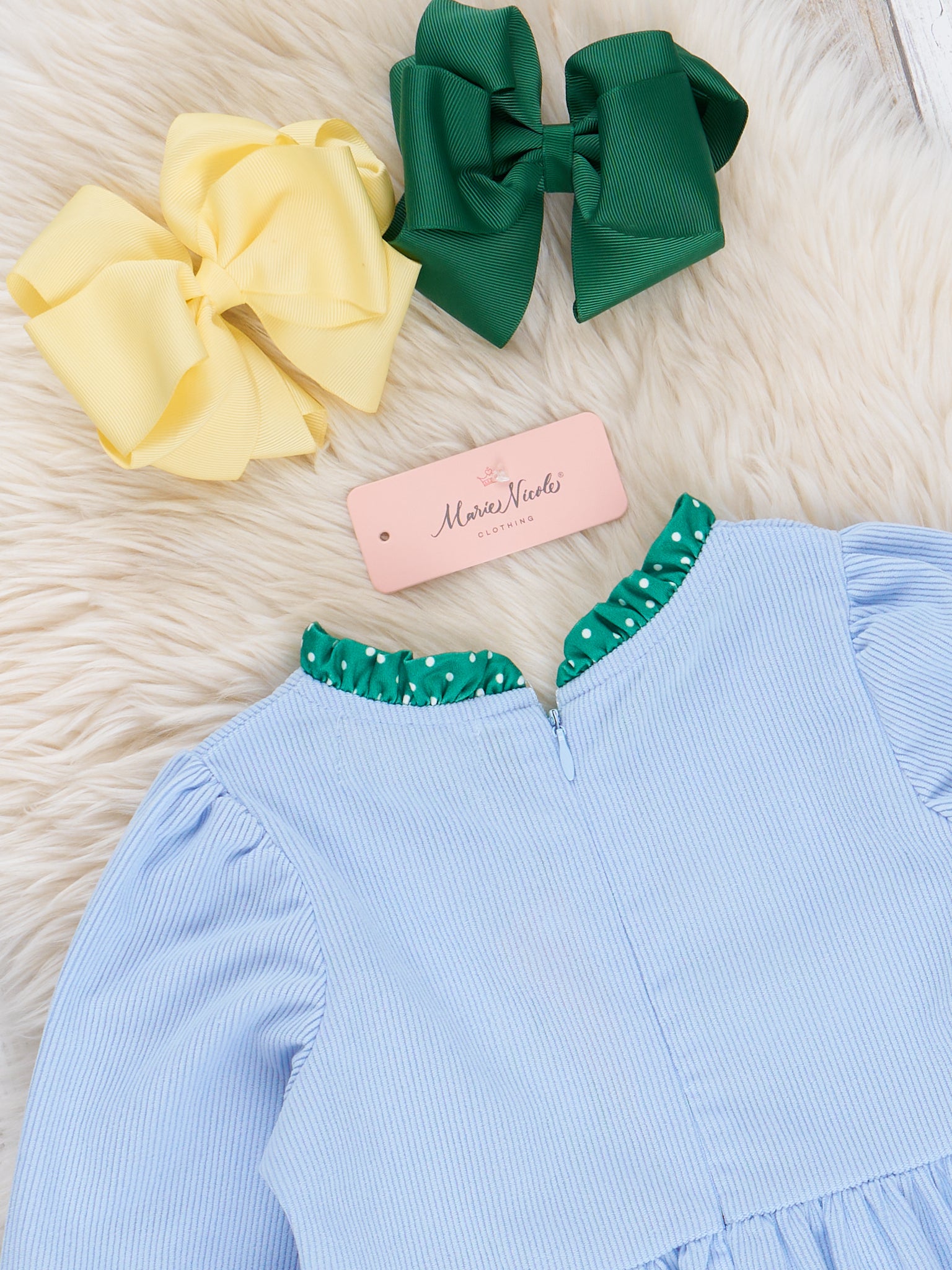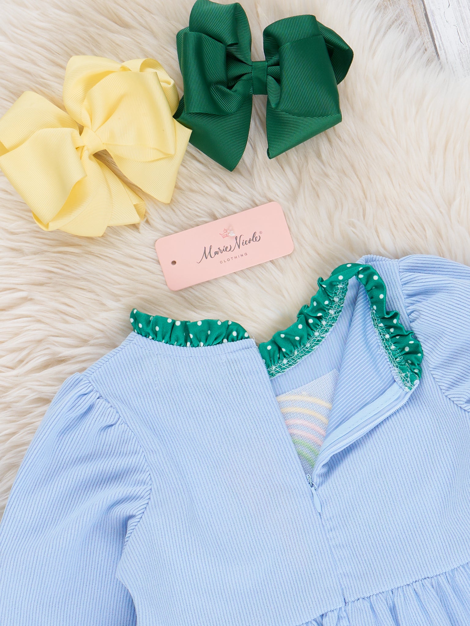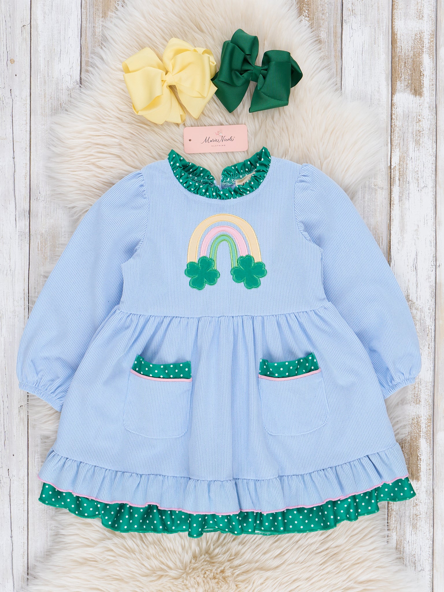 Get lucky in style with our Luckiest Rainbow Embroidered Ruffle Dress by Marie Nicole Clothing! Perfect for St. Patrick's Day celebrations, this girls' dress features a charming embroidered rainbow with pots of gold. The blue bodice and green polka dot ruffle trim add an extra touch of whimsy.