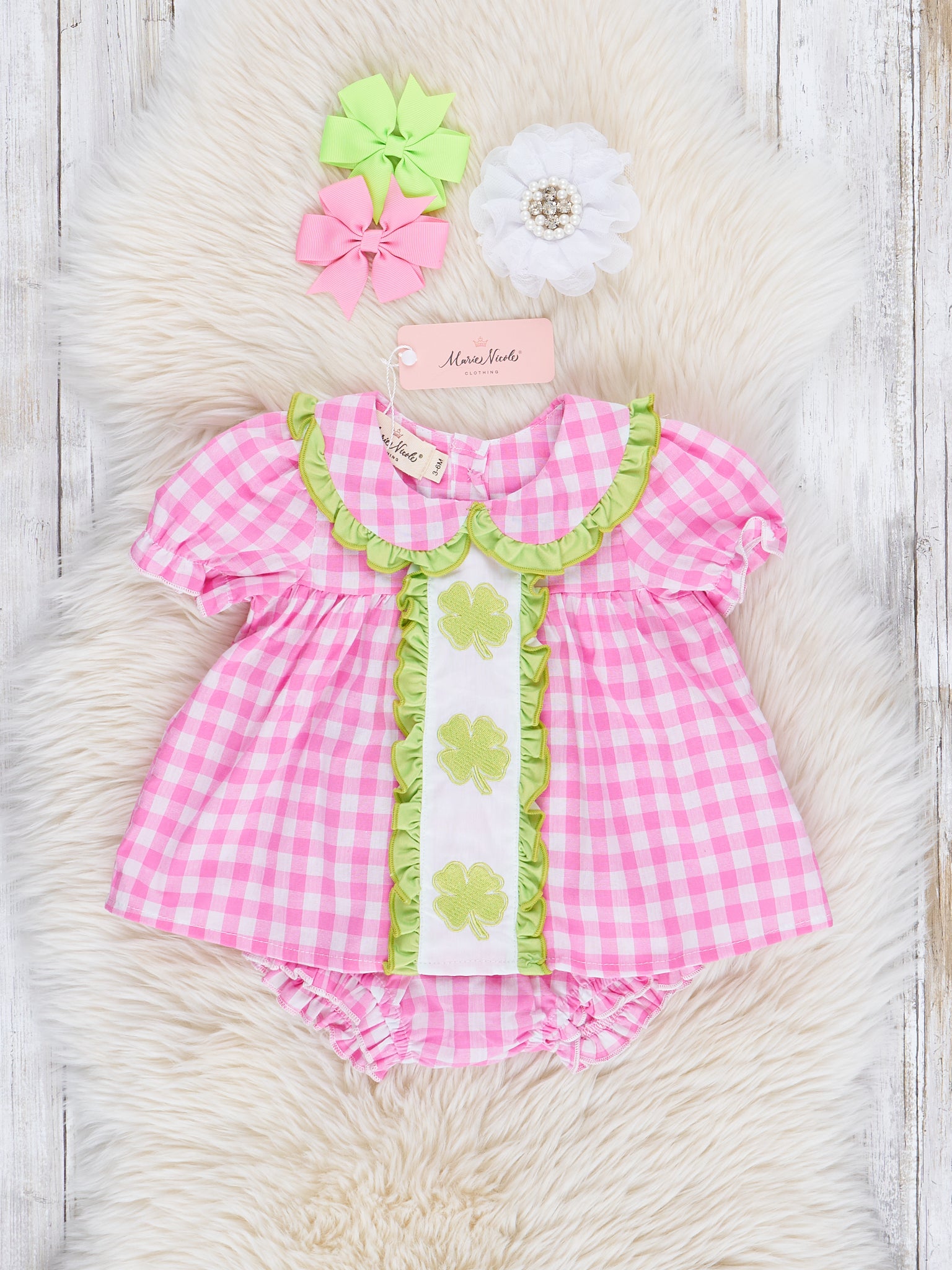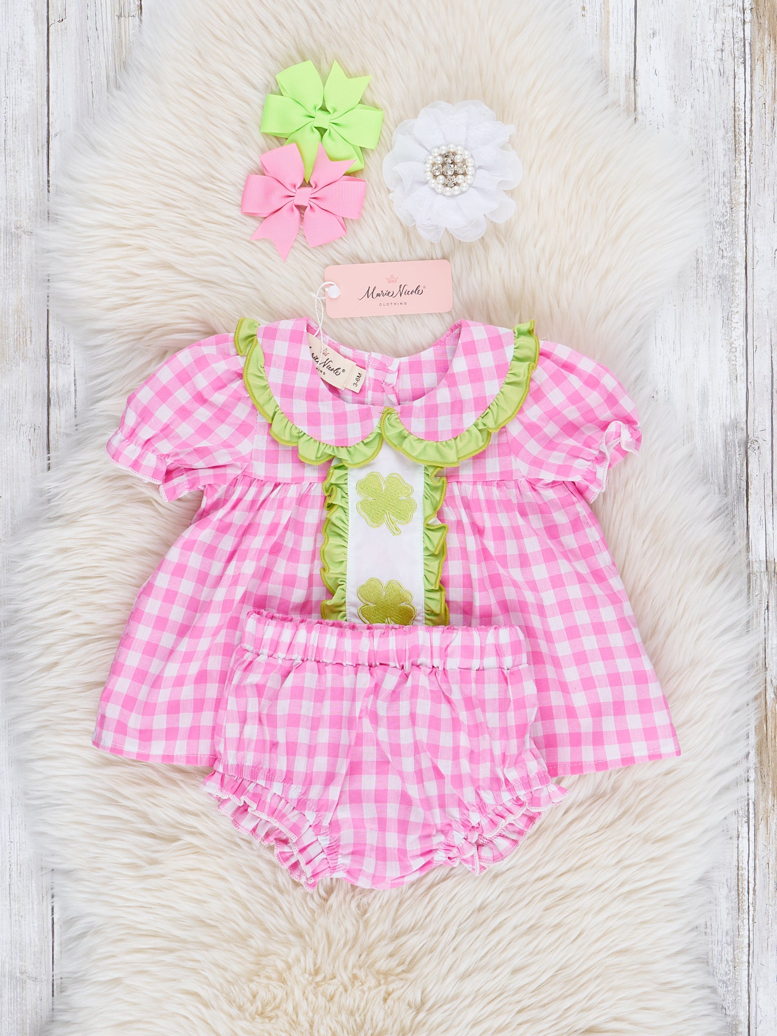 Treat your little leprechauns to this mischievous Happy Lucky Shamrocks Embroidered Ruffle Bloomers Outfit by Marie Nicole Clothing! Adorable magenta gingham and lime accents with embroidered shamrocks are sure to bring out the St Patrick’s Day spirit in any wee one. Throw in a pinch of cuteness, and let the fun begin!