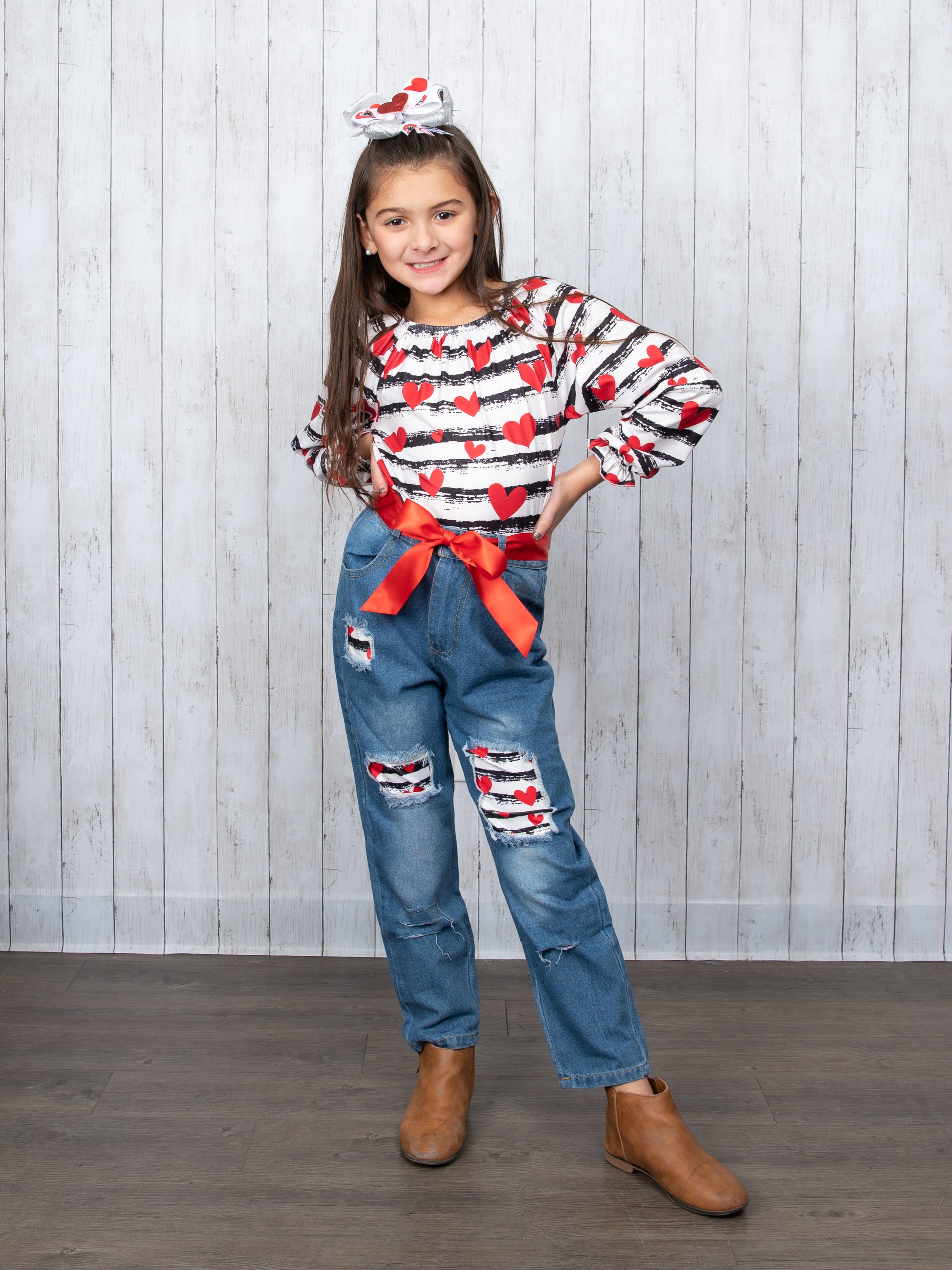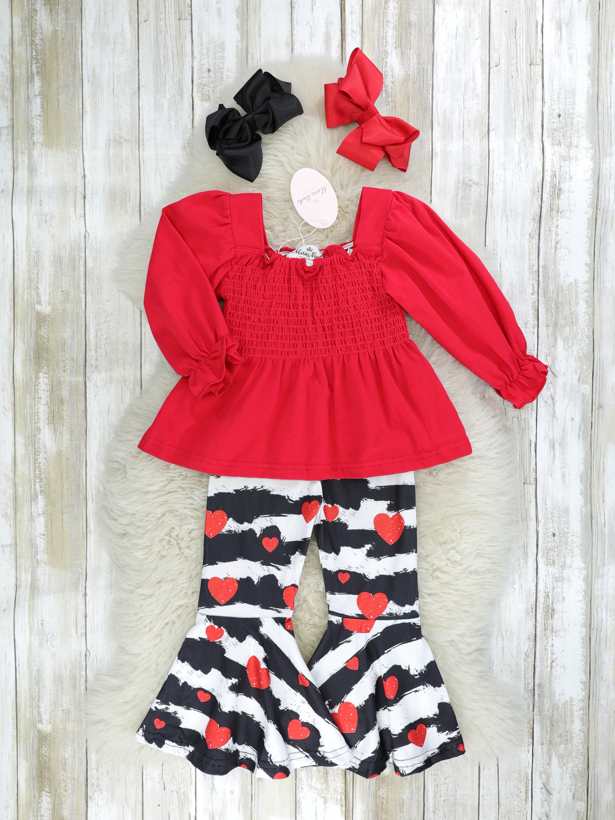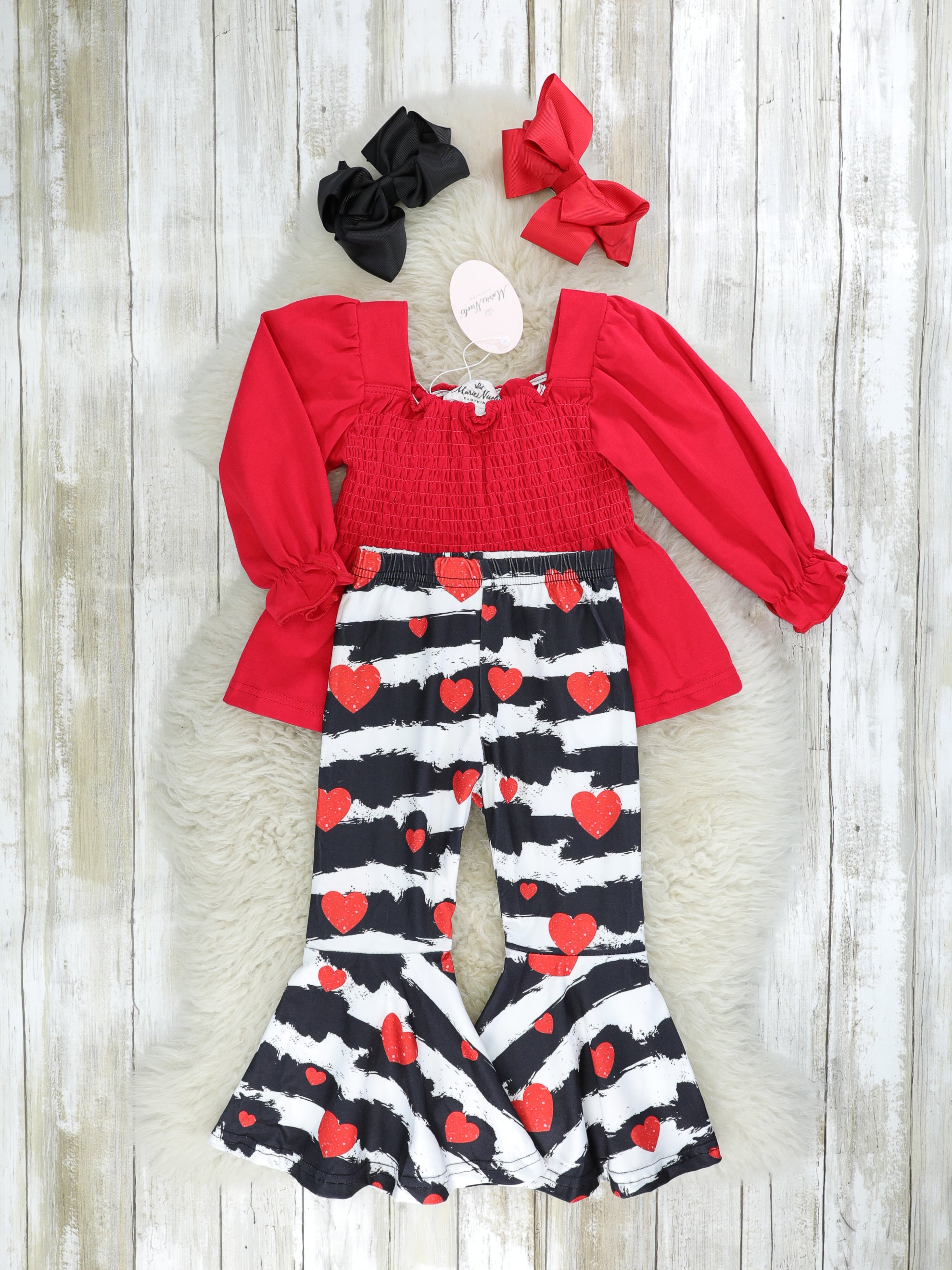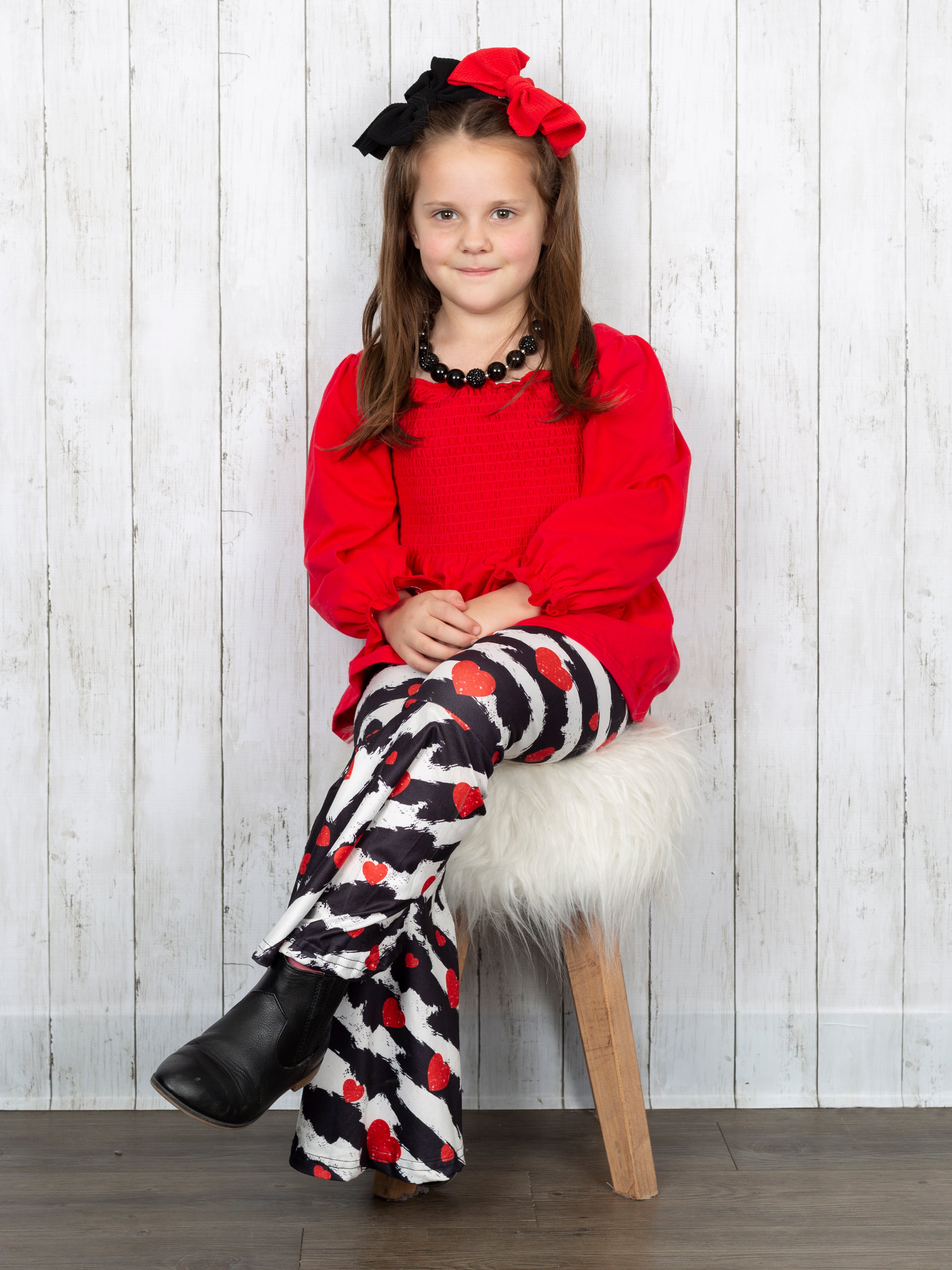 Red Puff Sleeve Top & Striped Heart Bell Bottom Outfit