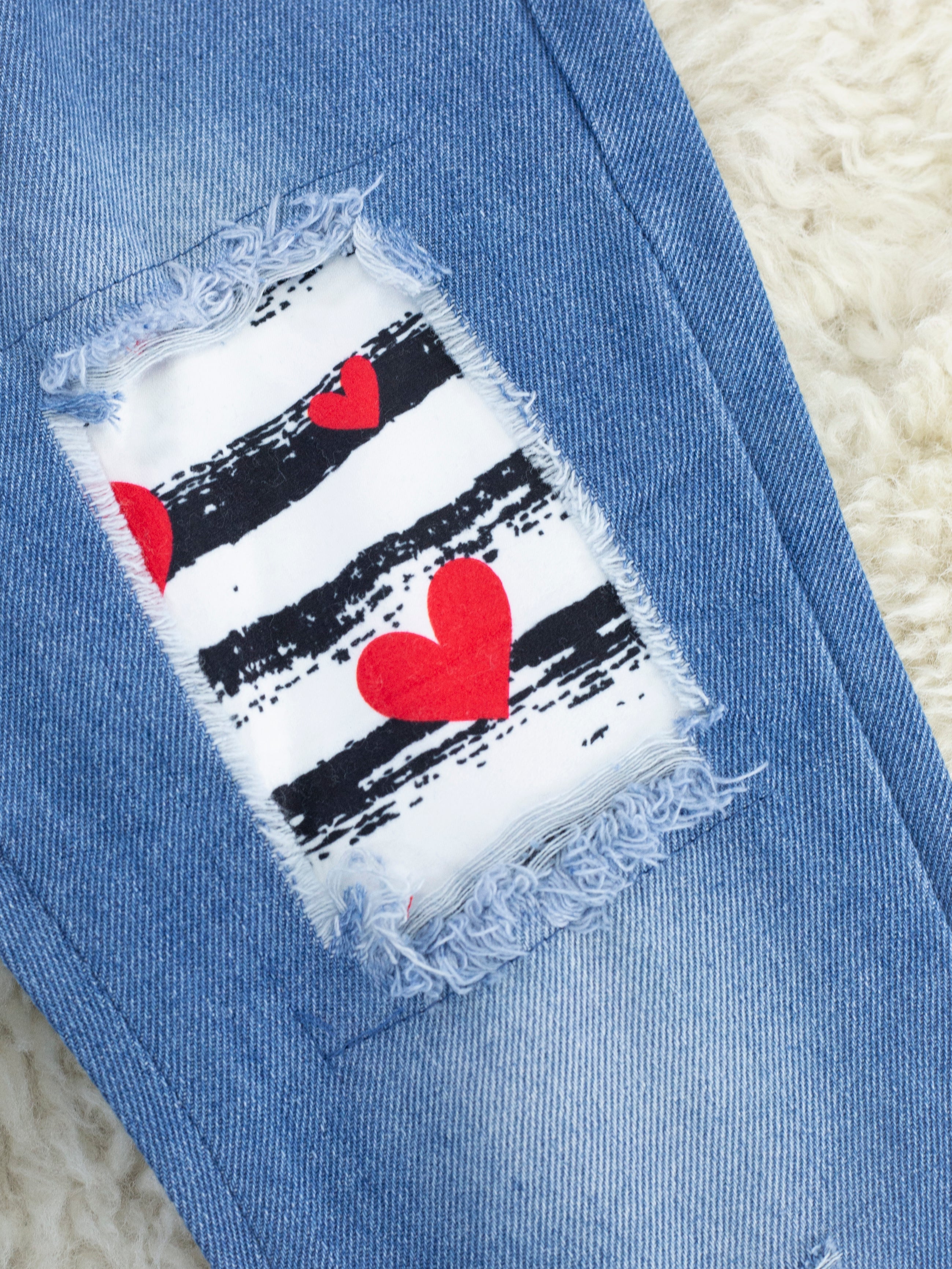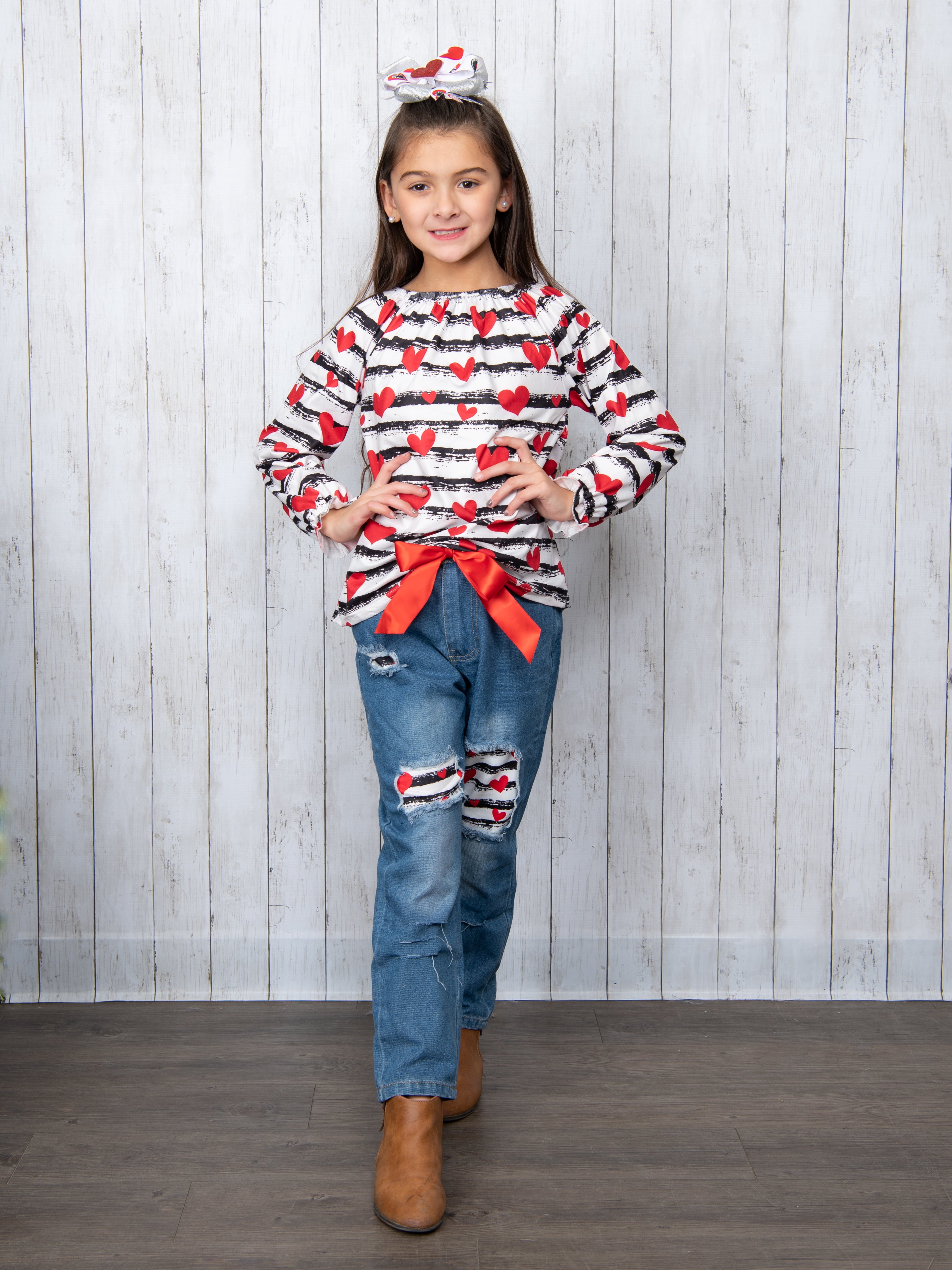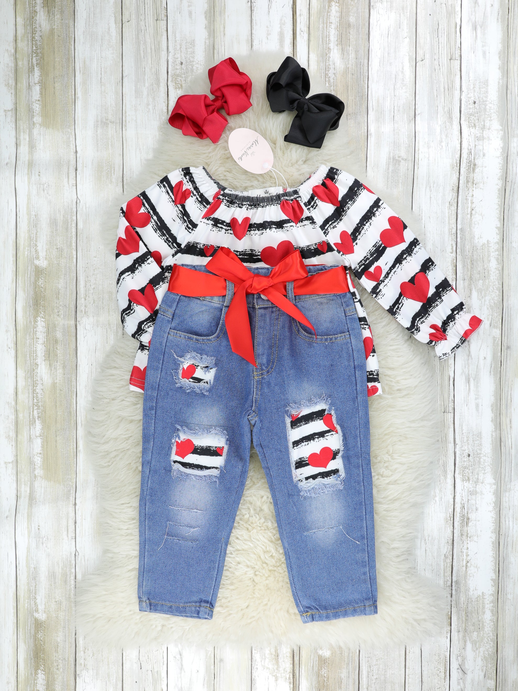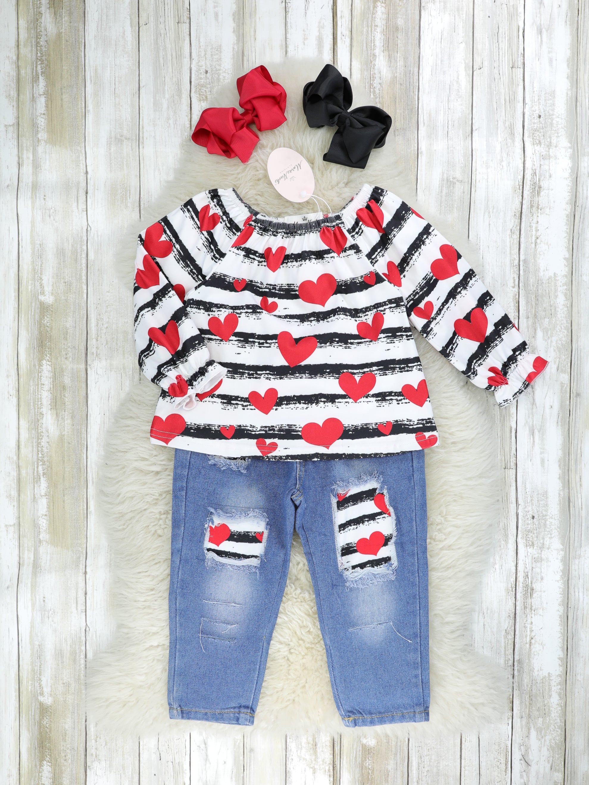 Red Puff Sleeve Top & Striped Heart Bell Bottom Outfit