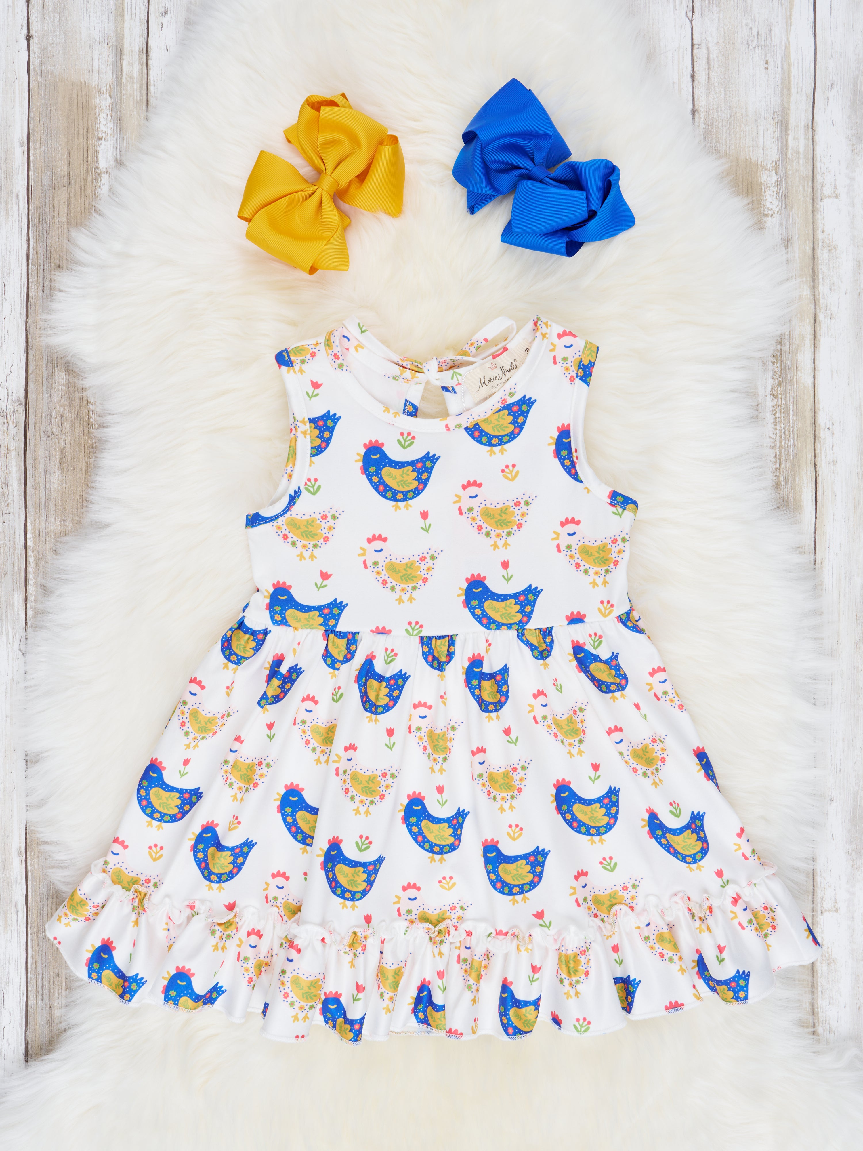 Time to fly the coop! Get those chicks ready to strut this sister set in this adorable Summer Chick Ruffle Dress. Perfect for any little one with a flair for the feathered, this chicken print set ensures they'll look as cool as a cucumber!