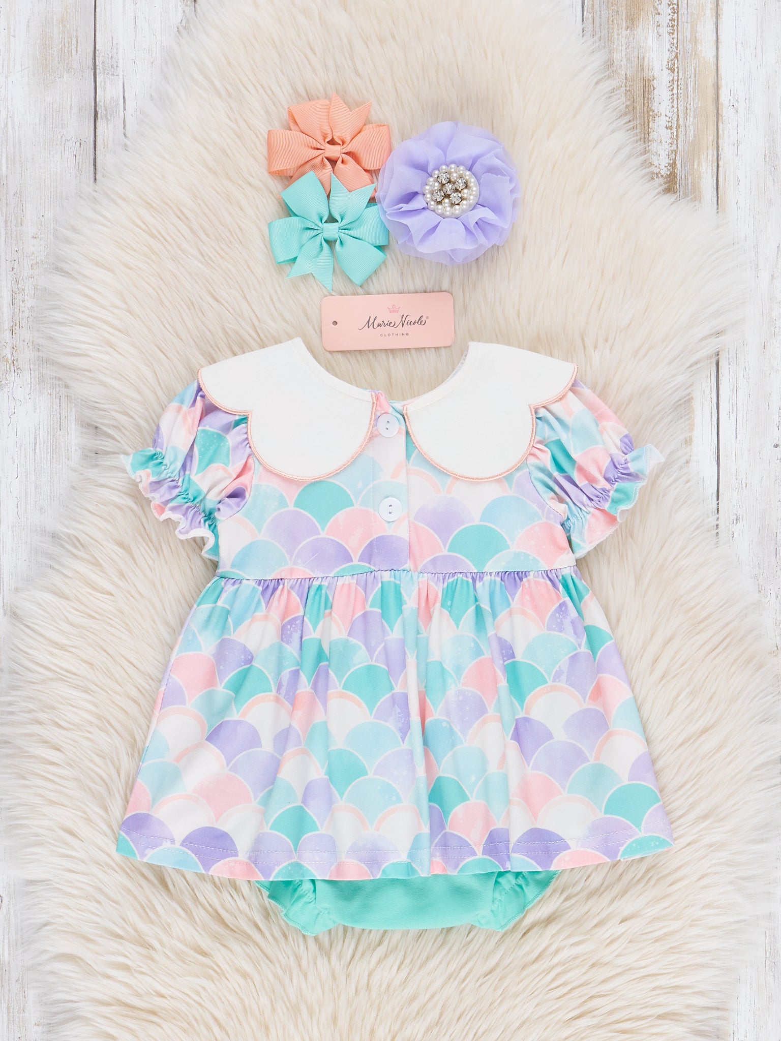 The Embroidered Mermaid Life Ruffle Bubble is a magical one-piece featuring whimsical mermaid embroidery and soft ruffle accents for a playful, ocean-inspired look. From Marie Nicole Clothing this bubble is perfect for sunny days and seaside adventures.