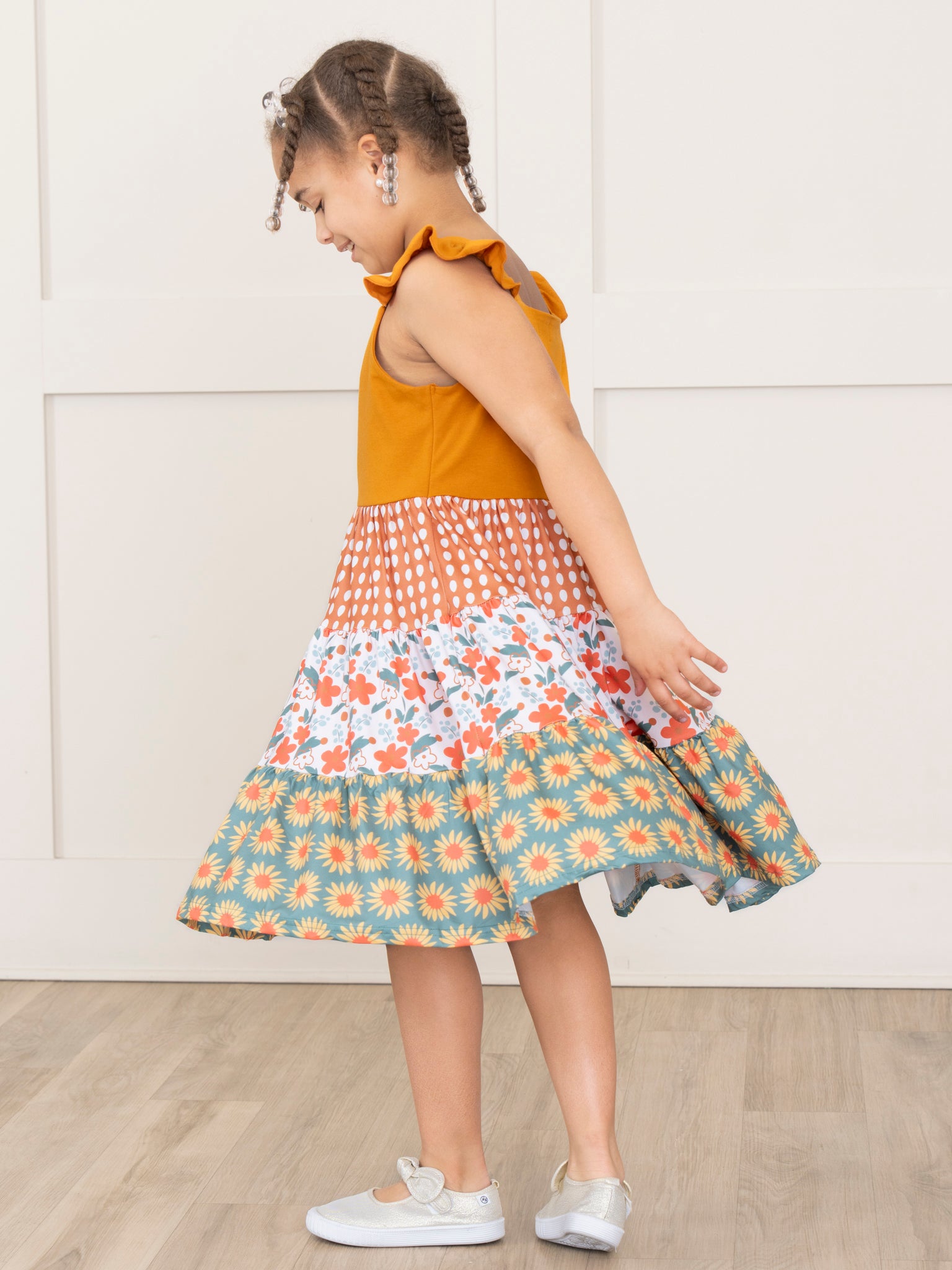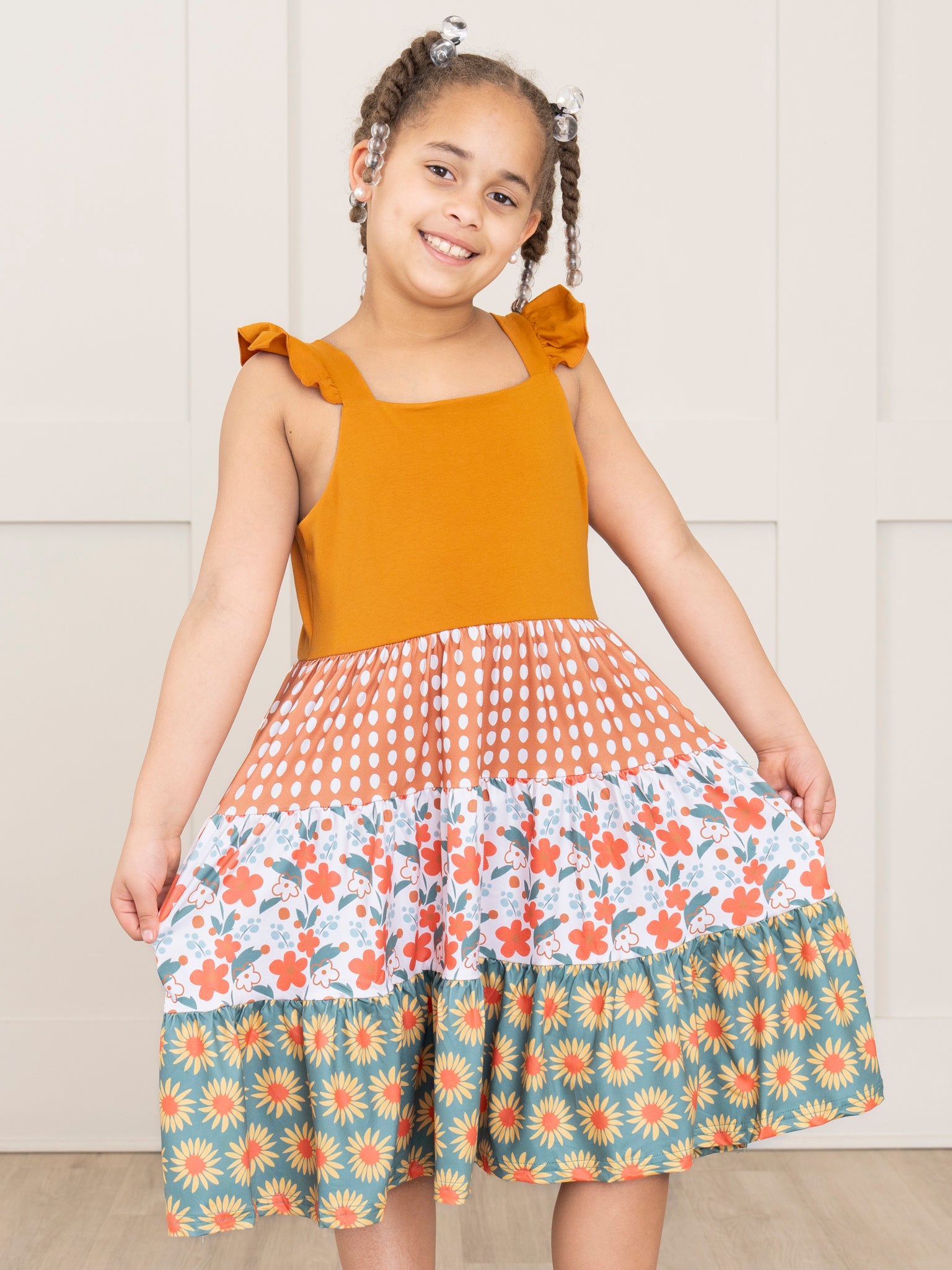 This adorable girls' dress from Marie Nicole Clothing mixes cinnamon orange, gingham, florals, and retro dots for a fun and playful look. With flutter sleeves and a tiered ruffle skirt, your little one will love twirling around in this sister set. Perfect for any occasion!
