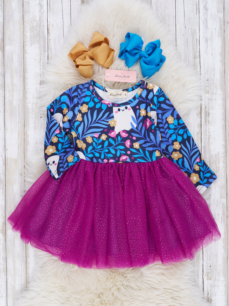 Long Sleeve Halloween Swing Dresses - Purple Ghosts