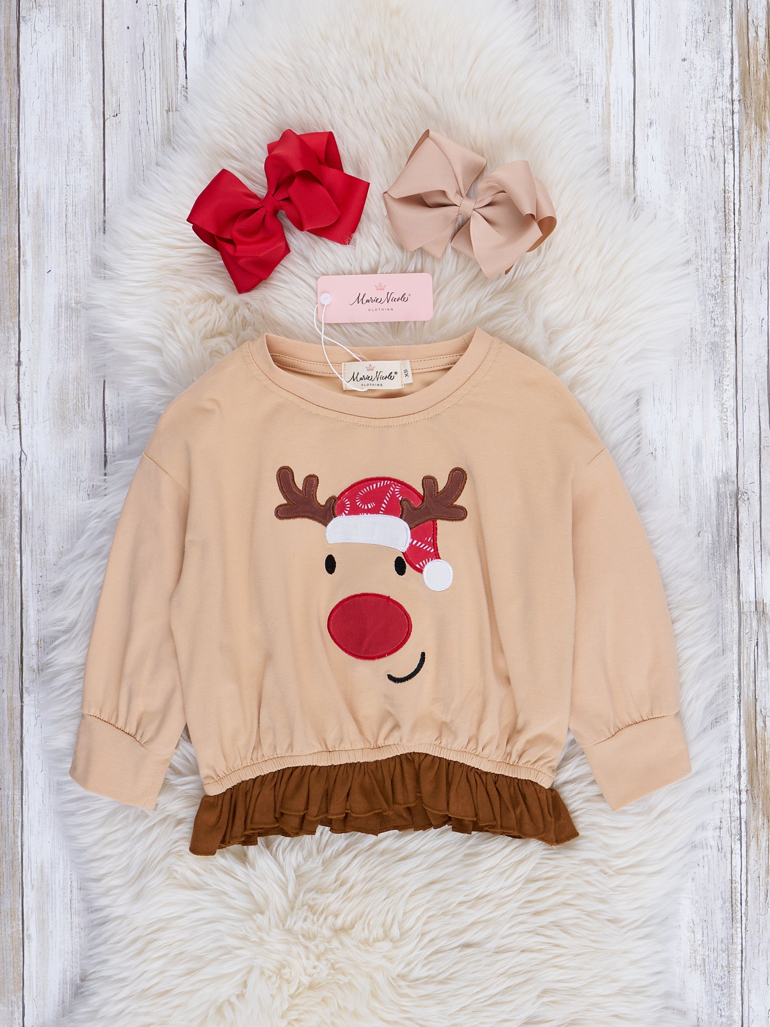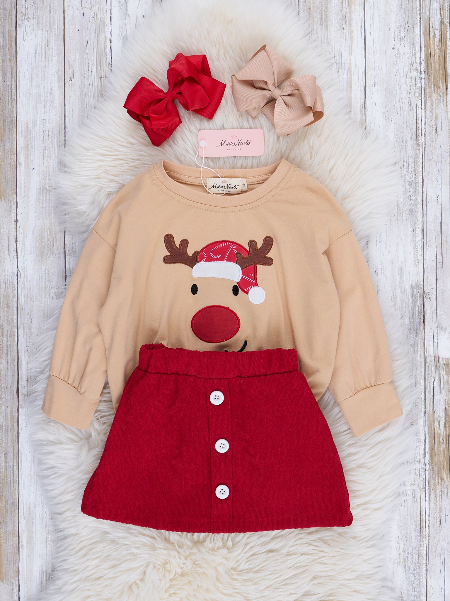 Tan & Red Friendly Reindeer Ruffle Outfit w/ Skirt