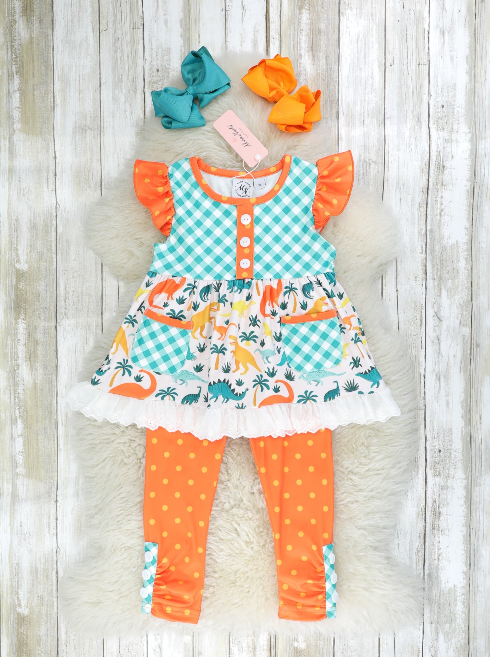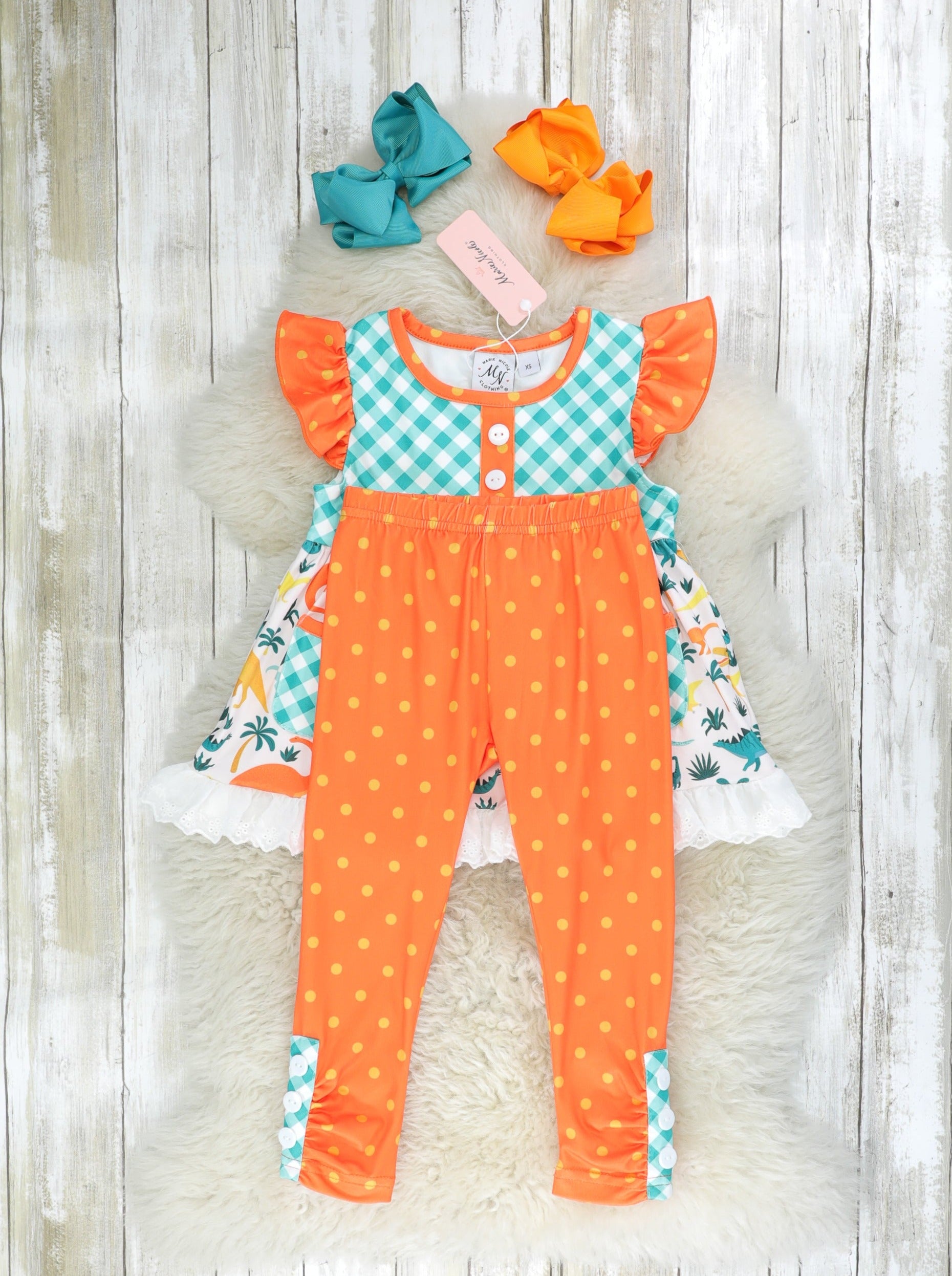 This charming sister set is absolutely t-riffic! This outfit features a peplum top with teal gingham, pockets, flutter sleeves, decorative buttons, adorable dinosaur details, & lace trim. The orange polka dot leggings feature ruffle details & decorative buttons at the ankles.