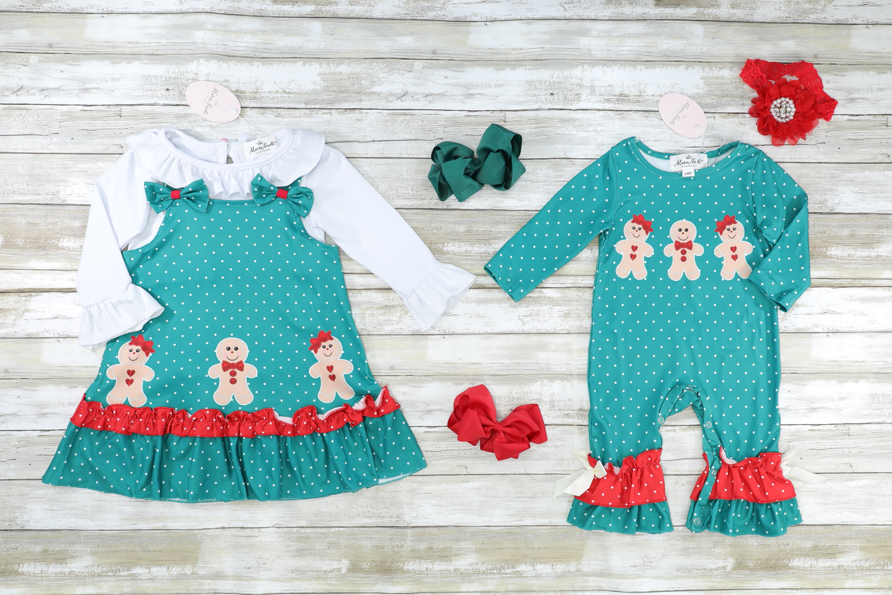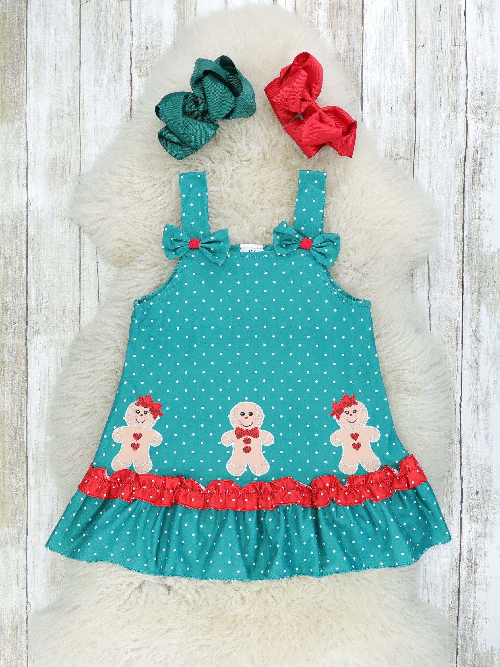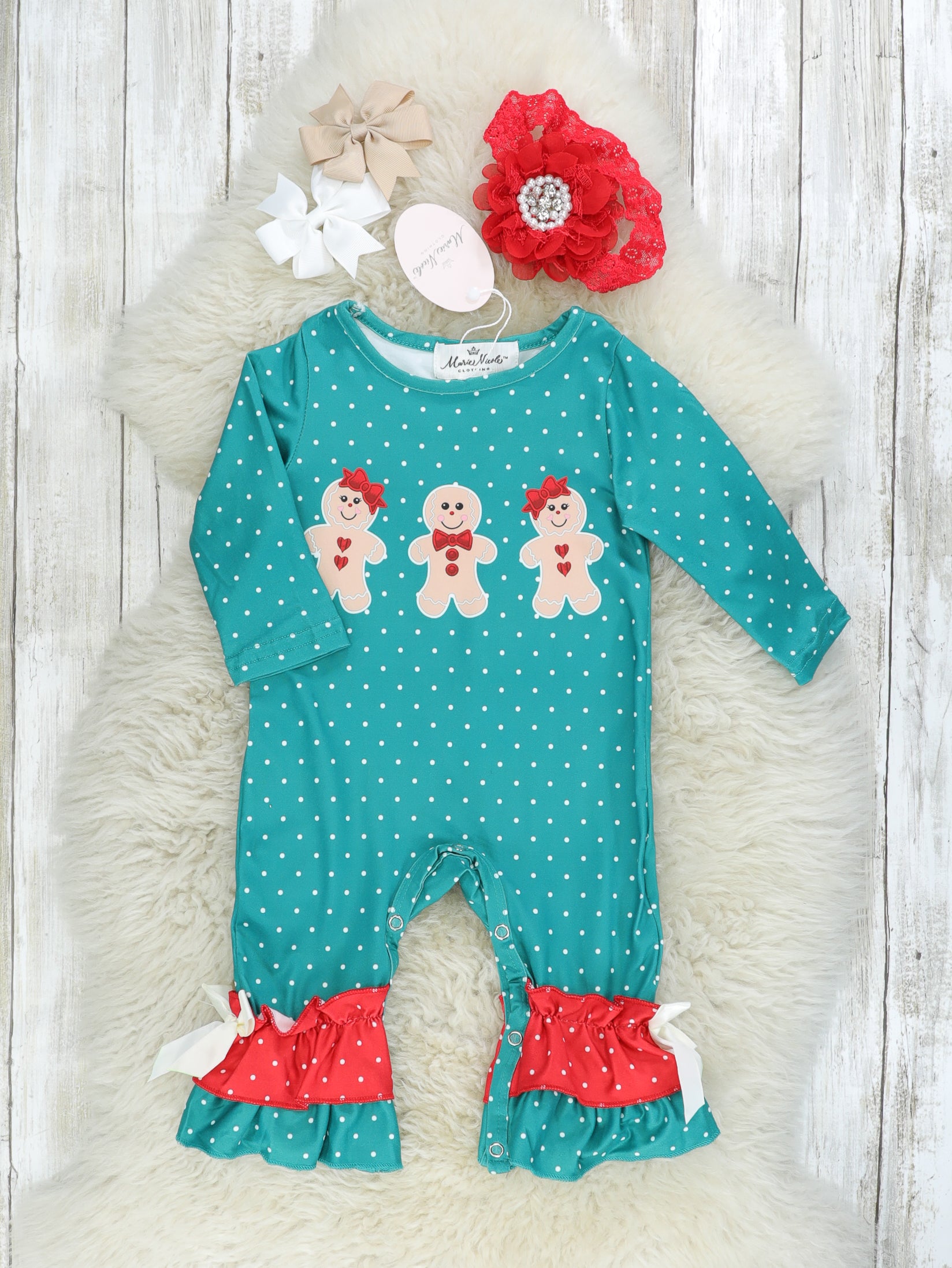 Teal Polka Dot Gingerbread Ruffle Overall Set
