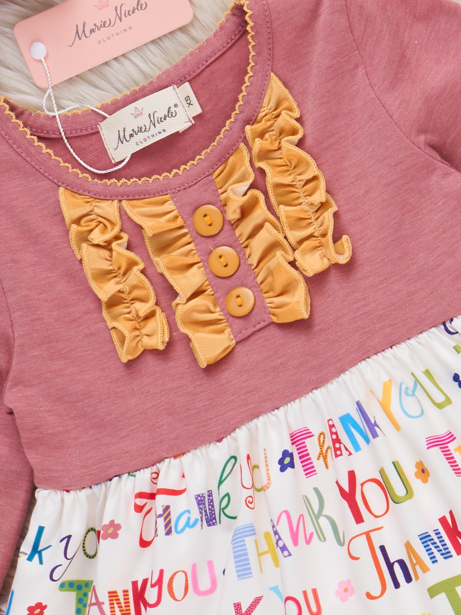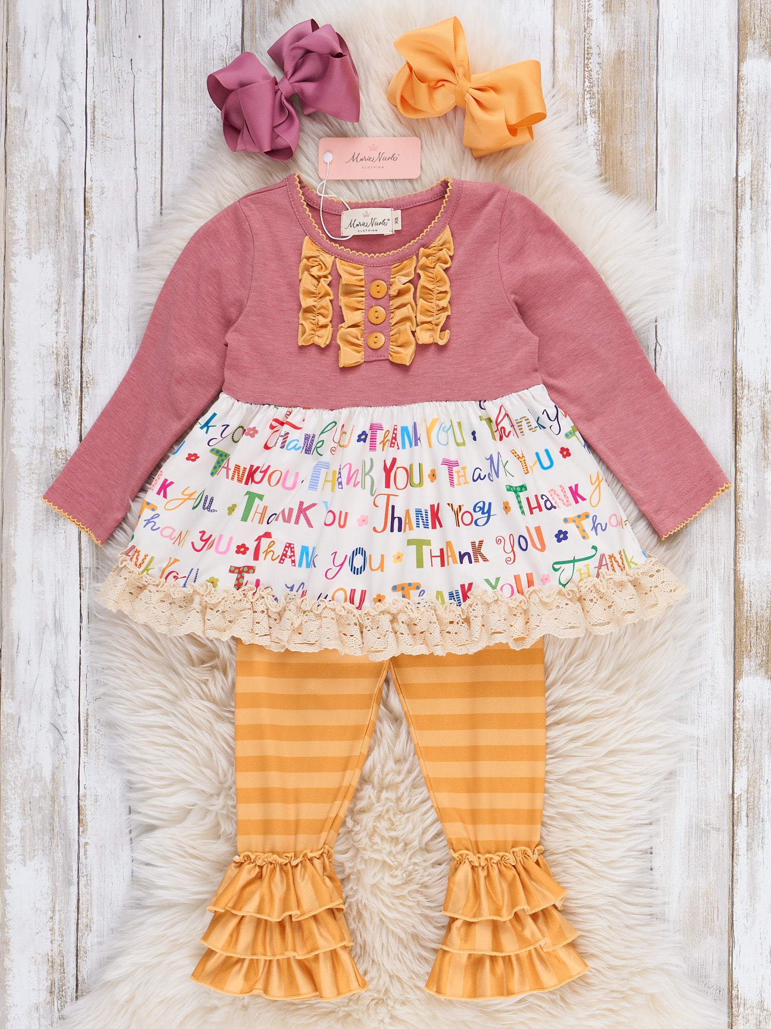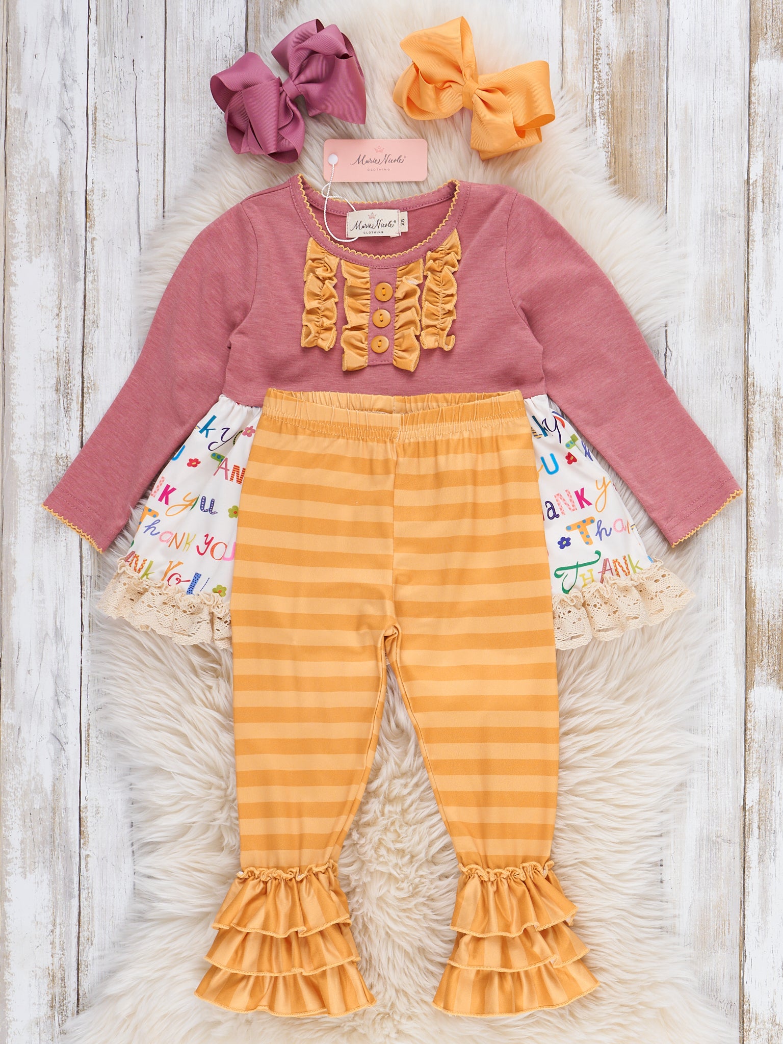 The Joyful Moments Script Striped Outfit by Marie Nicole Clothing features a playful top with a script print, lace, and ruffle accents, paired with coordinating striped bell-bottom pants. This set is designed for both comfort and style, making it a great choice for festive gatherings, everyday wear, and cheerful seasonal photos.