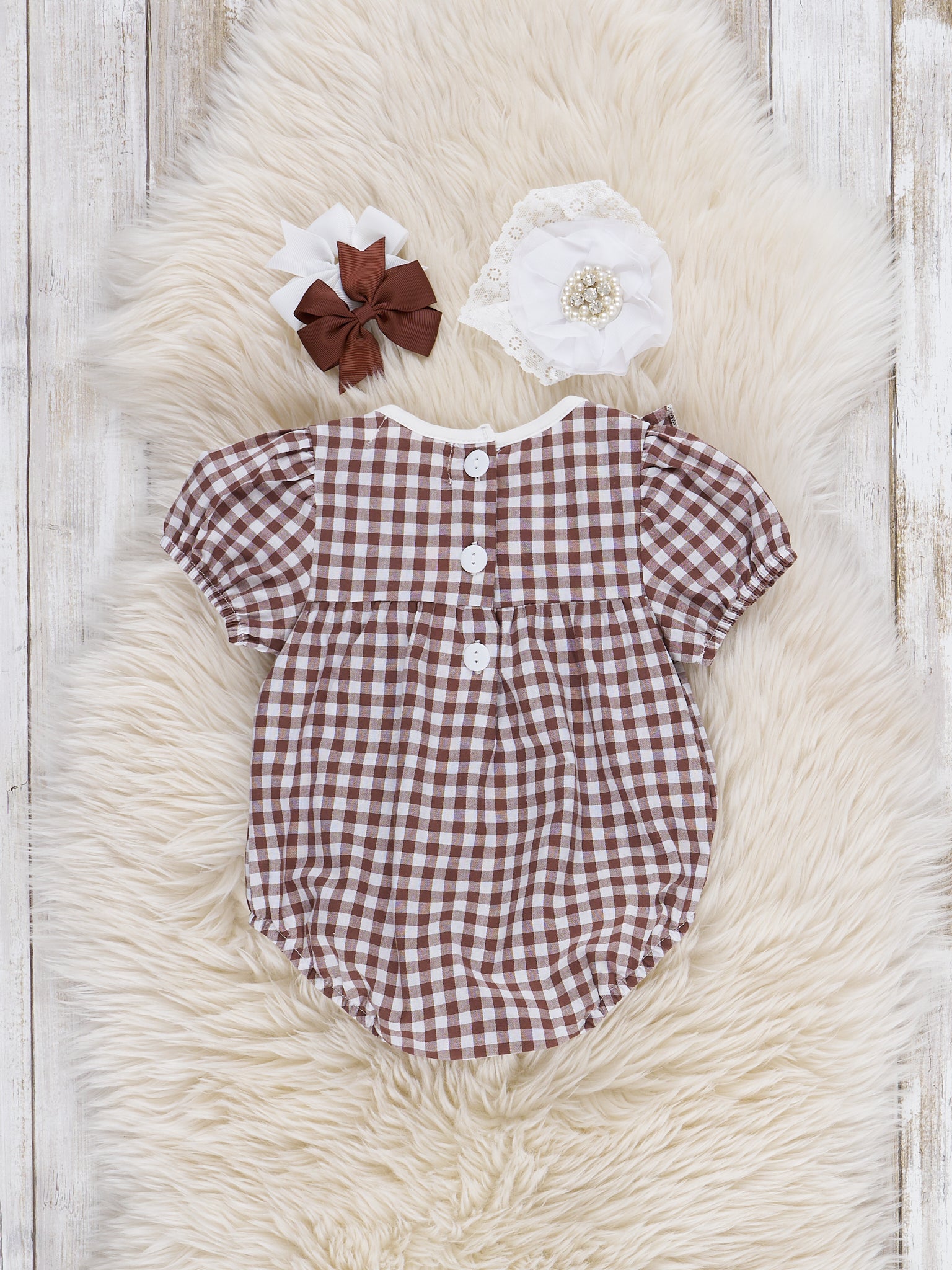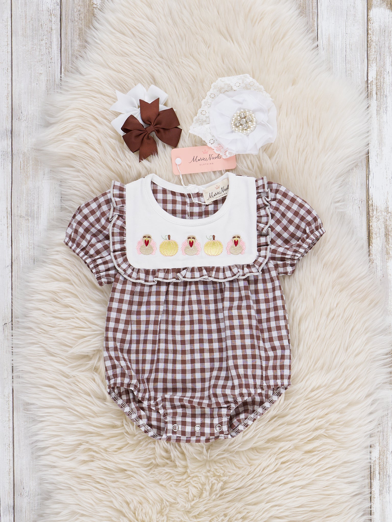 The Turkey Flock Gingham Bubble Romper from Marie Nicole Clothing is a charming one-piece featuring classic gingham fabric and turkey embroidery across the chest. With ruffle trims and a comfortable, roomy fit, this bubble is perfect for Thanksgiving gatherings, fall festivities, or adorable seasonal photos, bringing a festive and playful look to little ones.