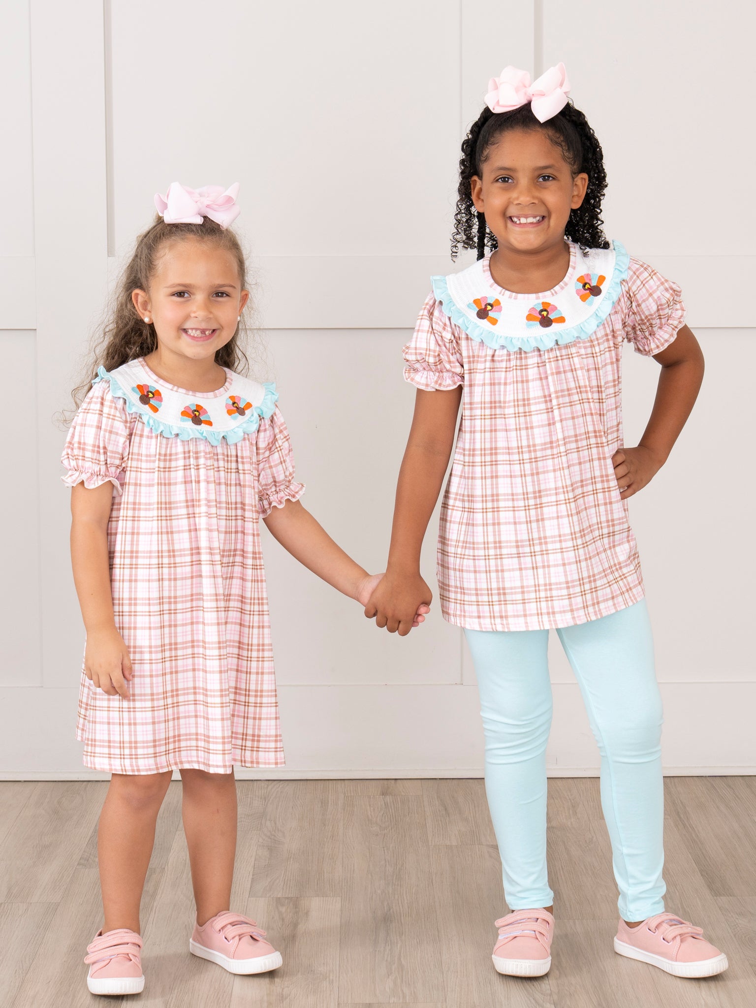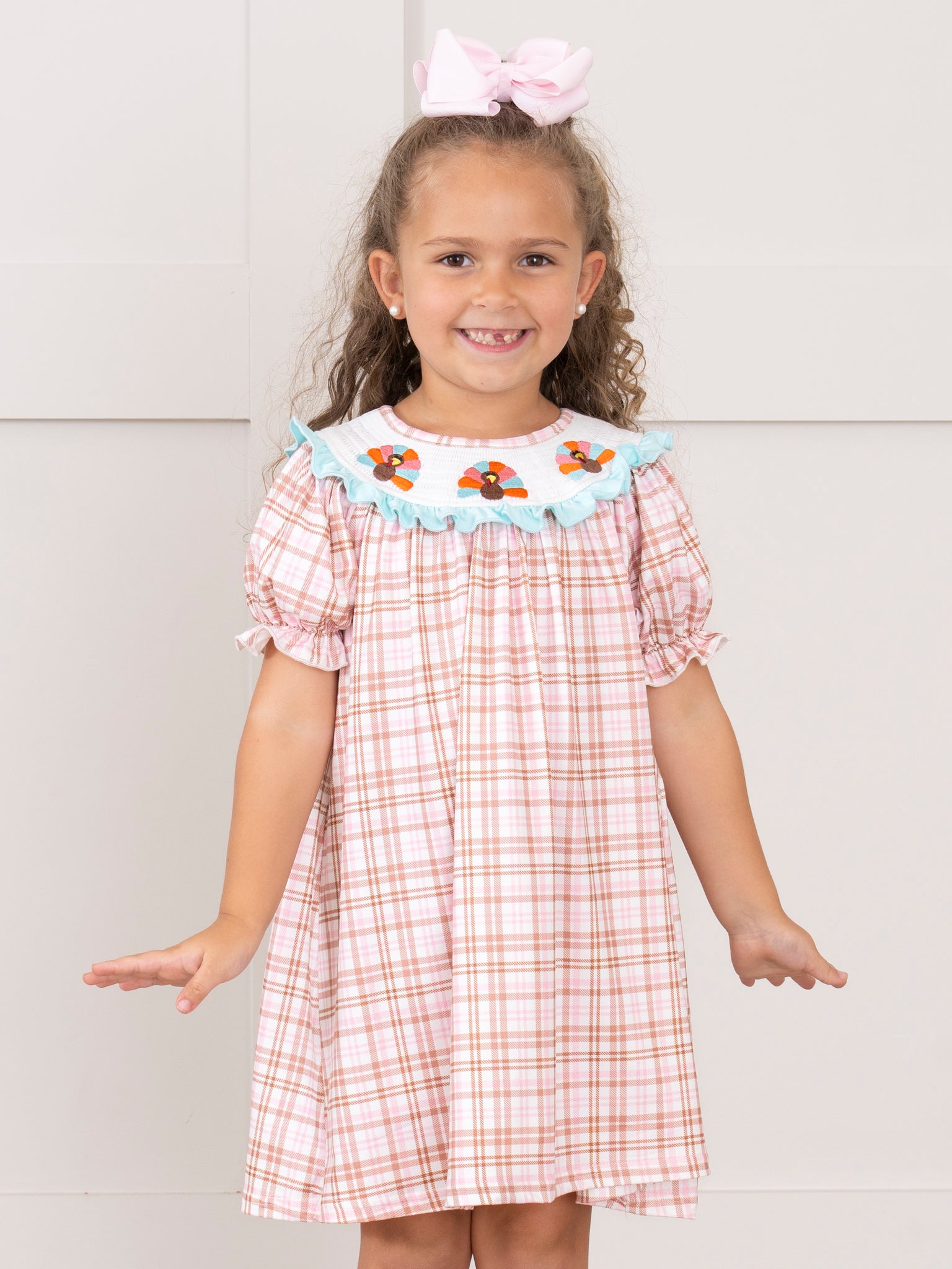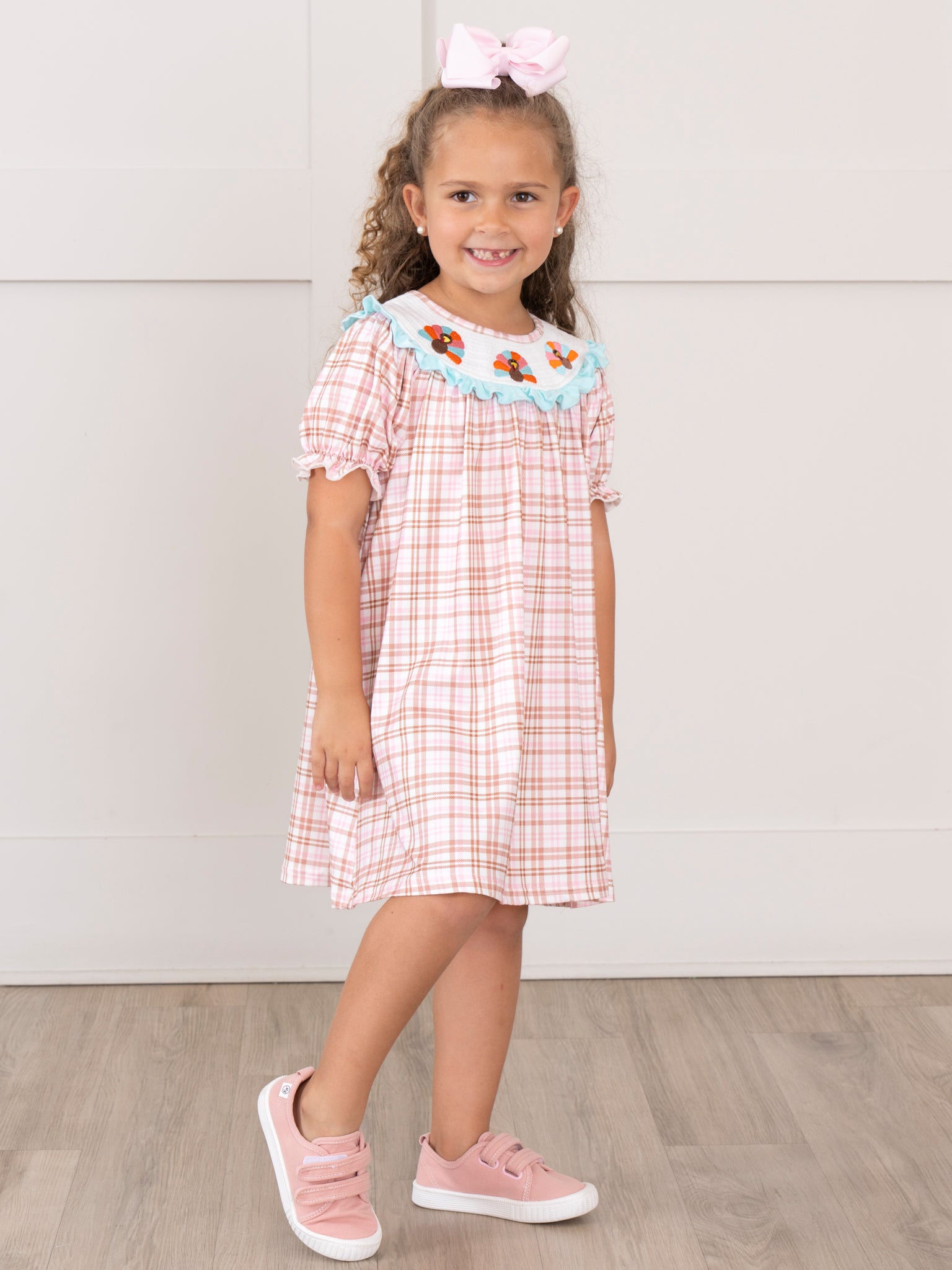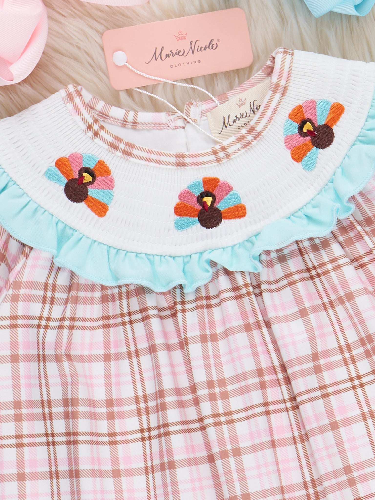 The Turkey Trot Smocked Dress by Marie Nicole Clothing features a soft pastel plaid pattern, smocked turkey embroidery, a blue ruffle-trimmed neckline, and gently gathered short sleeves. This dress is perfect for Thanksgiving celebrations and seasonal family gatherings, combining classic comfort with festive charm.