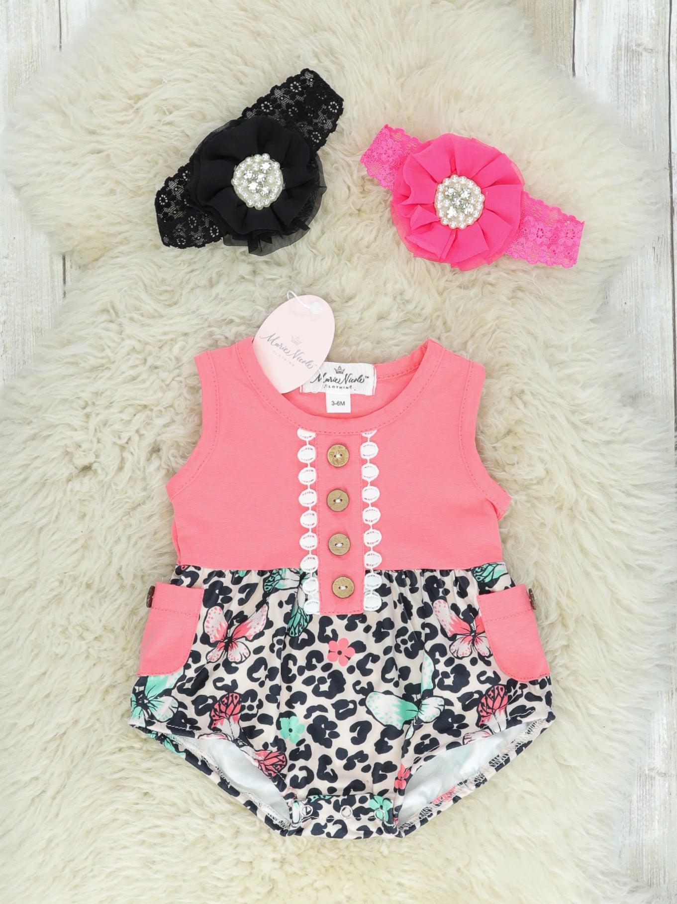 Leopard print & butterflies- what more could your little girls want in an outfit?! This coral romper features buttons, white eyelet trim on both sides of the buttons, pockets, a beautiful leopard butterfly print, & snap buttons making for easy diaper changes. Shop the sister set here!