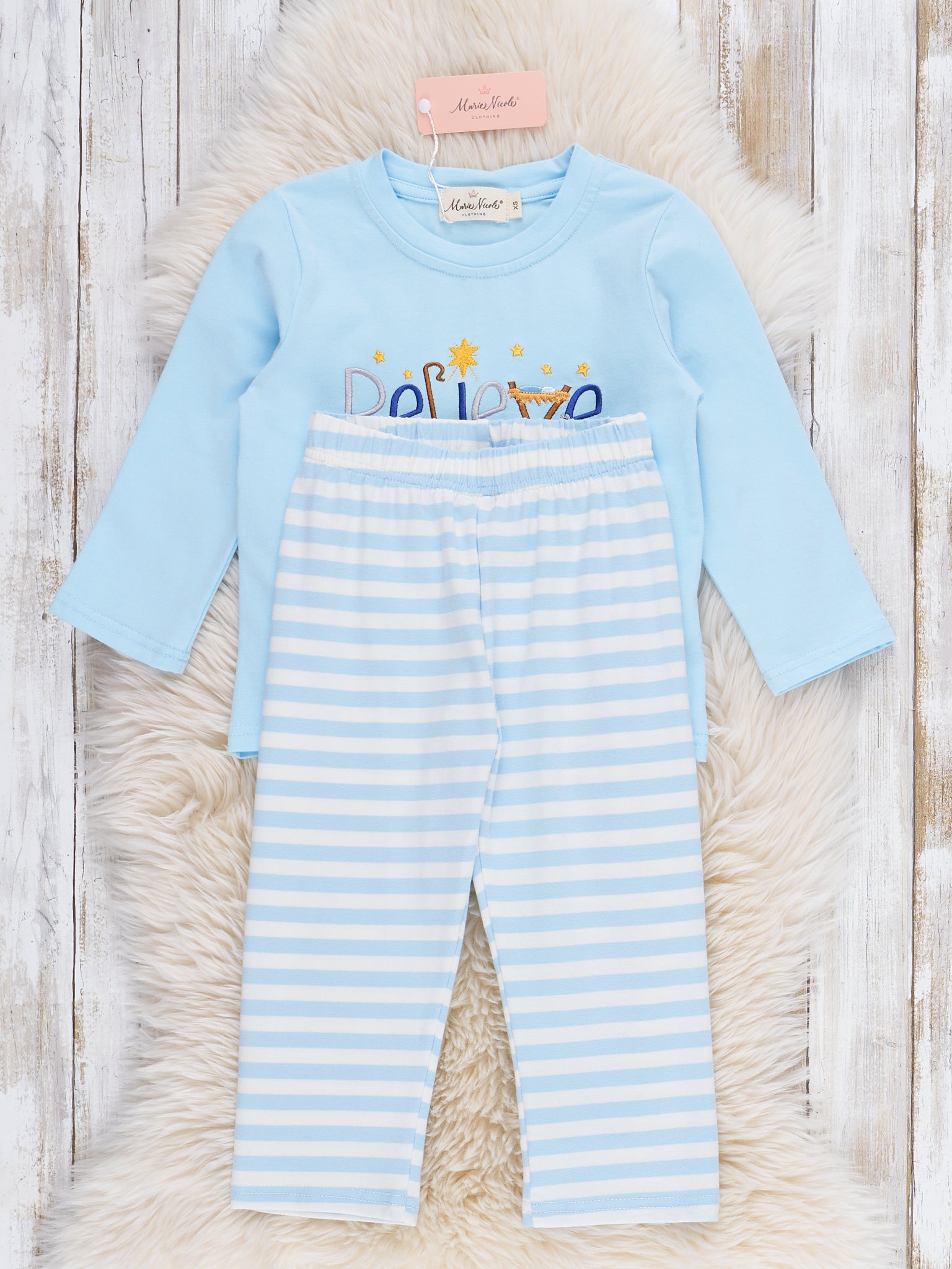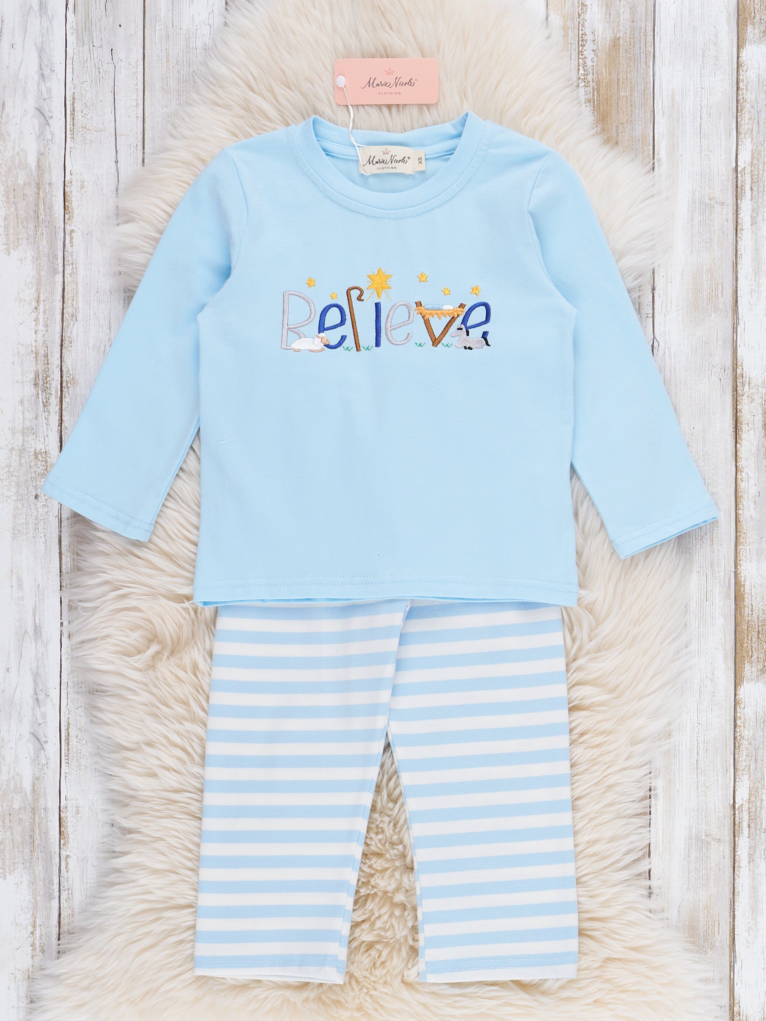 The Believe in Wonder Embroidered Outfit by Marie Nicole features a long sleeve top with an uplifting "believe" design and a pair of coordinating striped leggings. Designed for comfort and easy movement, this versatile set is perfect for joyful days, playtime, and relaxed seasonal celebrations.