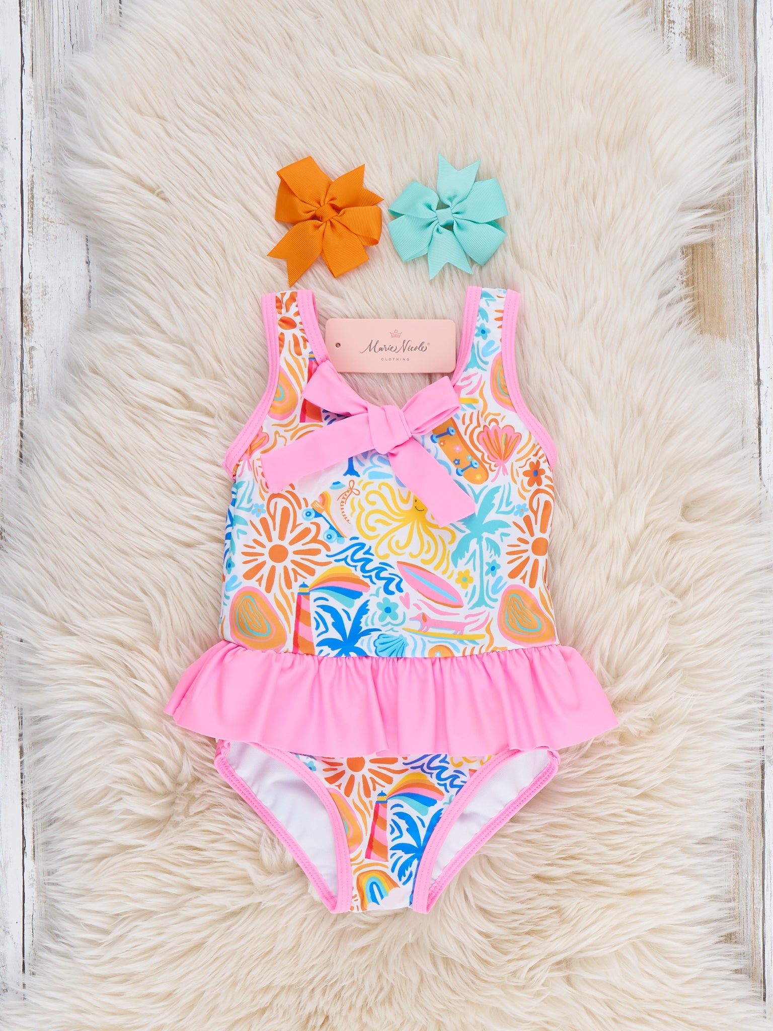 The Family Tropical Beach Swimsuit for Girls by Marie Nicole Clothing features bright tropical floral prints with a sweet bow neckline and a ruffled skirt overlay. The colorful design brings a cheerful boutique style that is perfect for family beach trips, pool days, and sunny vacations. This adorable swimsuit keeps little ones comfortable while adding a playful and vibrant touch to warm-weather adventures.