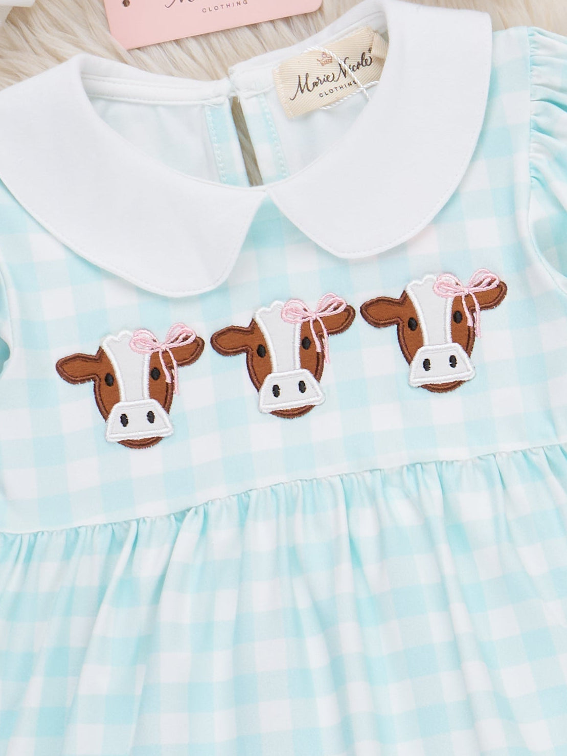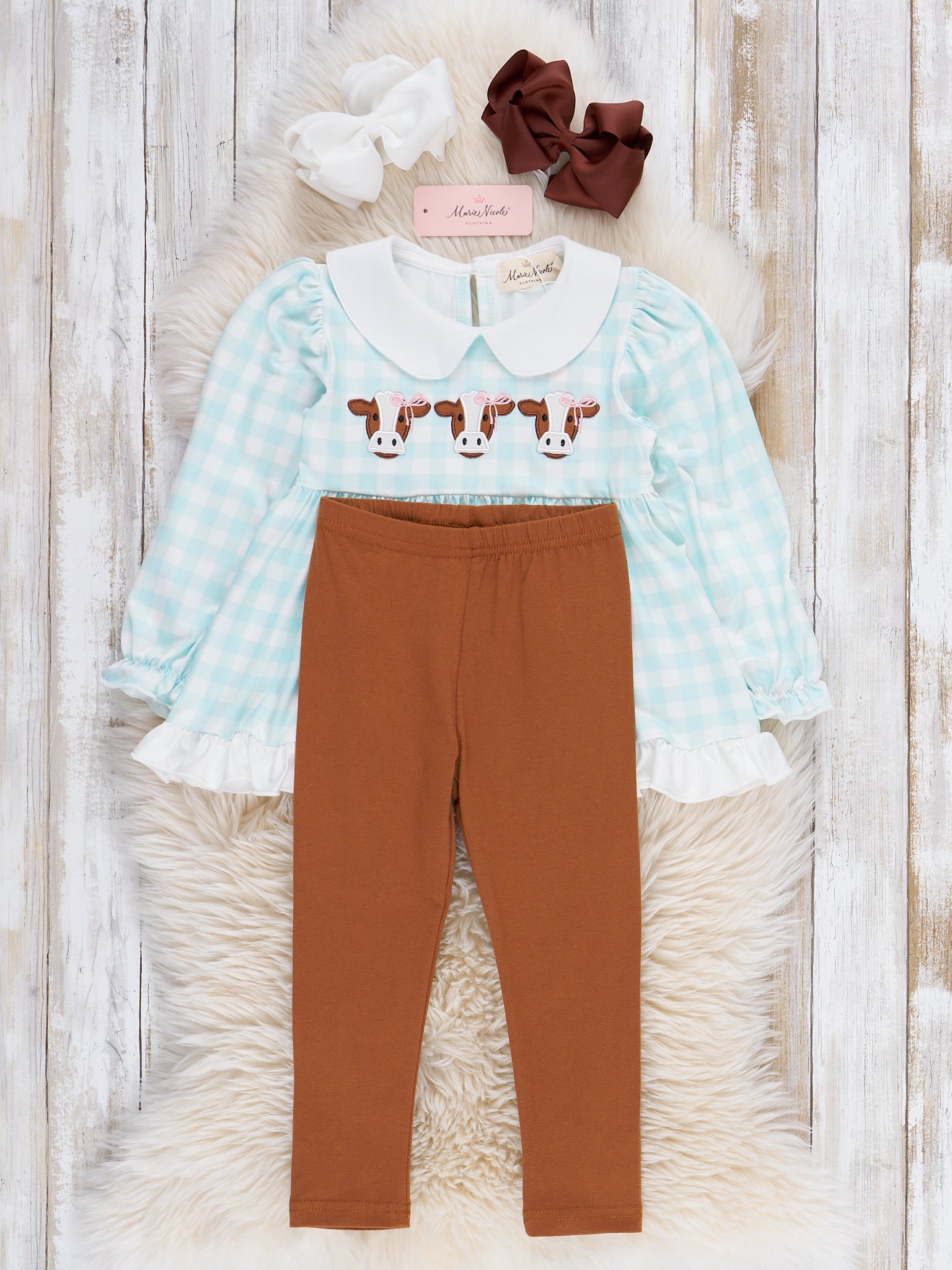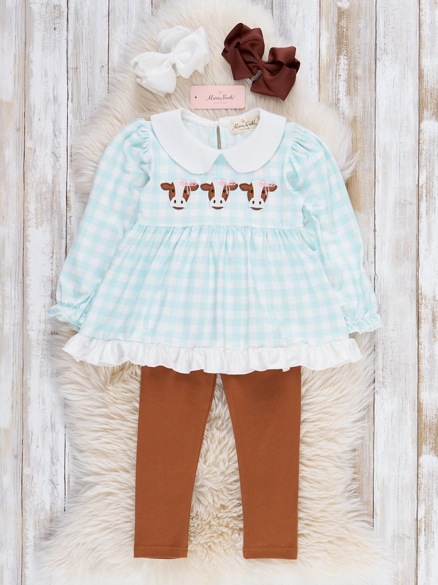 The Happy Moo Days Plaid Ruffle Outfit by Marie Nicole Clothing features a cheerful plaid top with charming embroidered accents and coordinating bottoms. With soft fabric and playful ruffle details, this set combines comfort and joyful style for everyday wear or holiday moments.