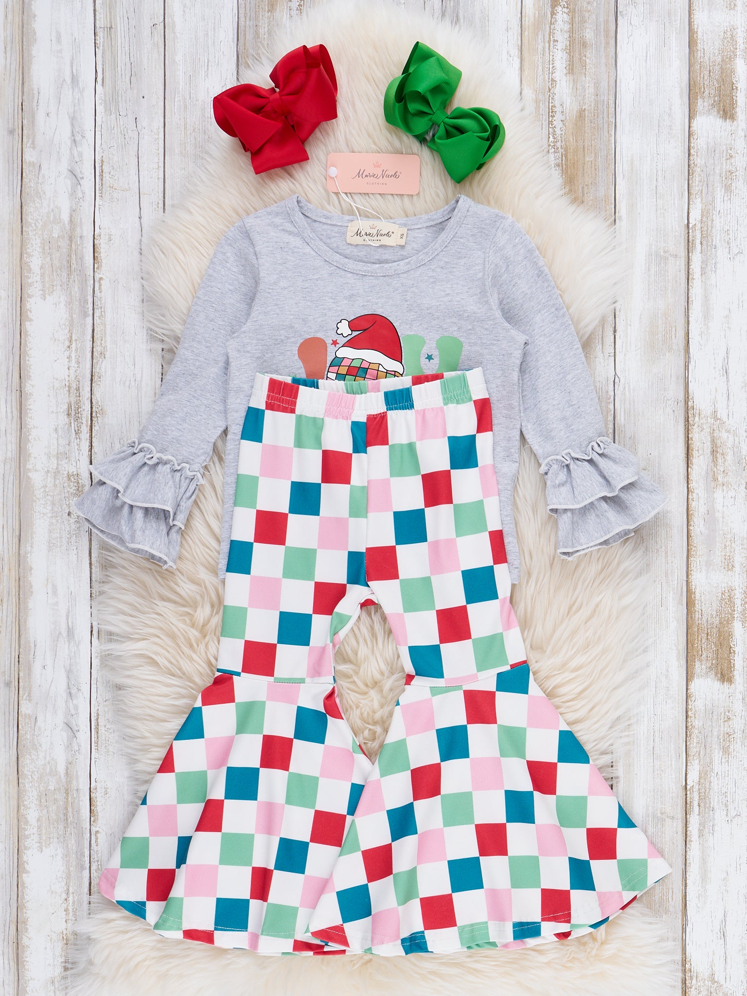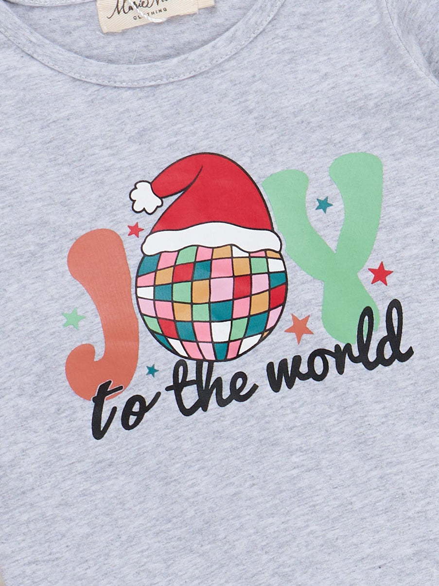 The "Joy to the World" Bell Bottom Outfit by Marie Nicole features a long sleeve top with a festive holiday motif and playful printed lettering, paired with bold, patterned bell bottom pants. This outfit combines cheerful style with comfortable movement, making it perfect for seasonal celebrations and joyful moments.