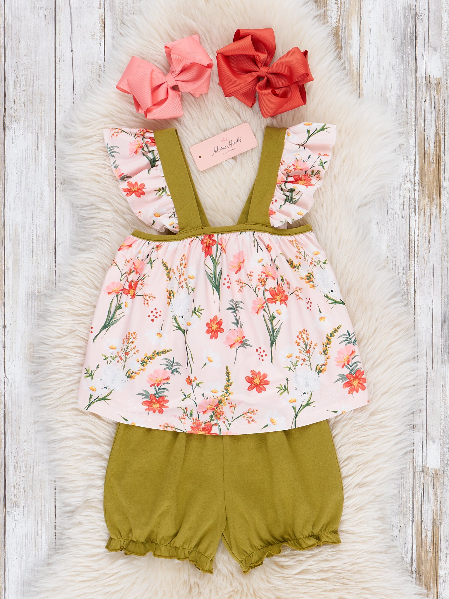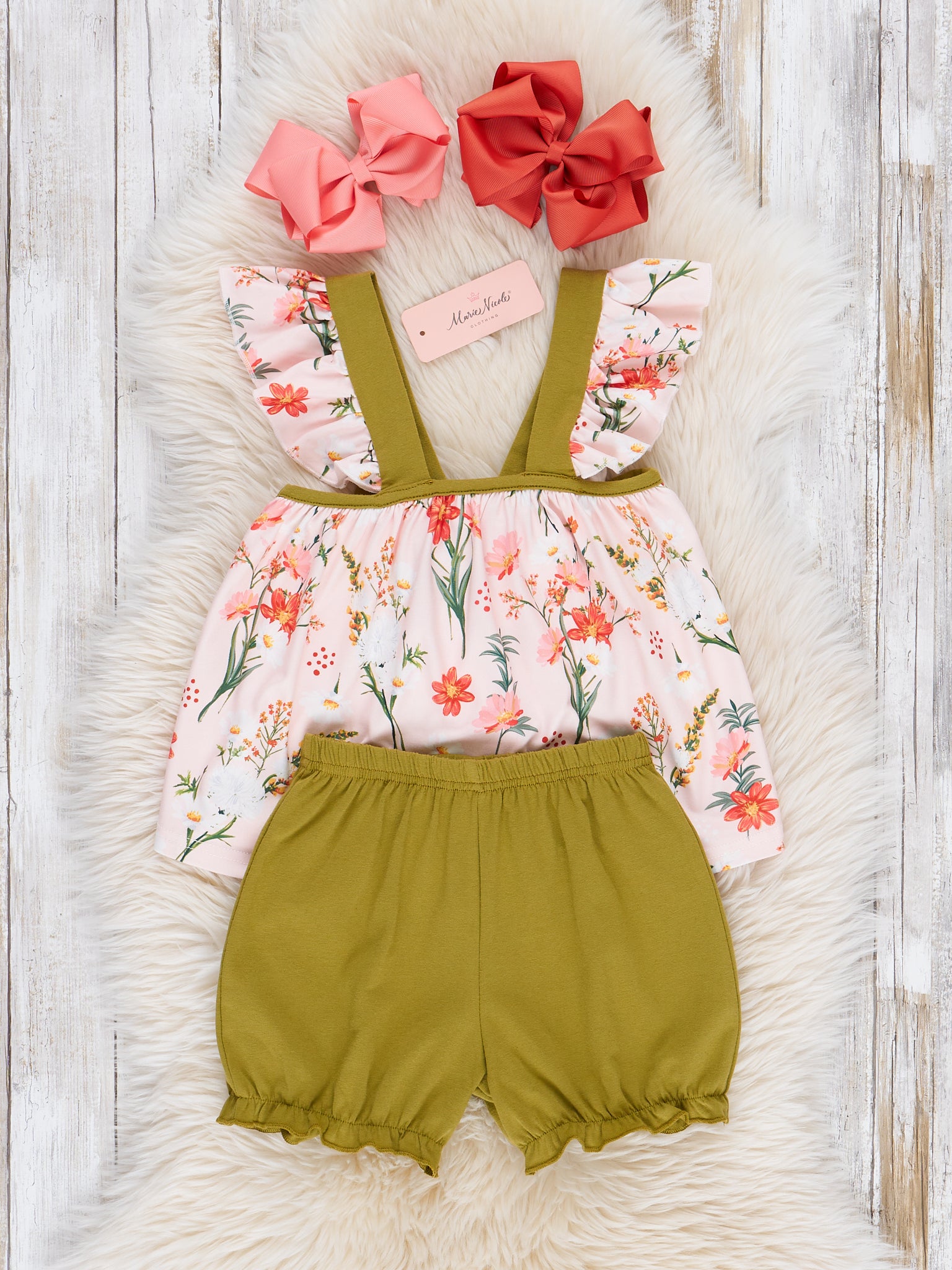 Make a statement with our Peach & Olive Garden Ruffle Outfit! Perfect for sisters, this playful shorts set features a peach floral print top with olive ruffle details paired with olive ruffle shorts. Don't miss out on this adorable summer piece from Marie Nicole Clothing.