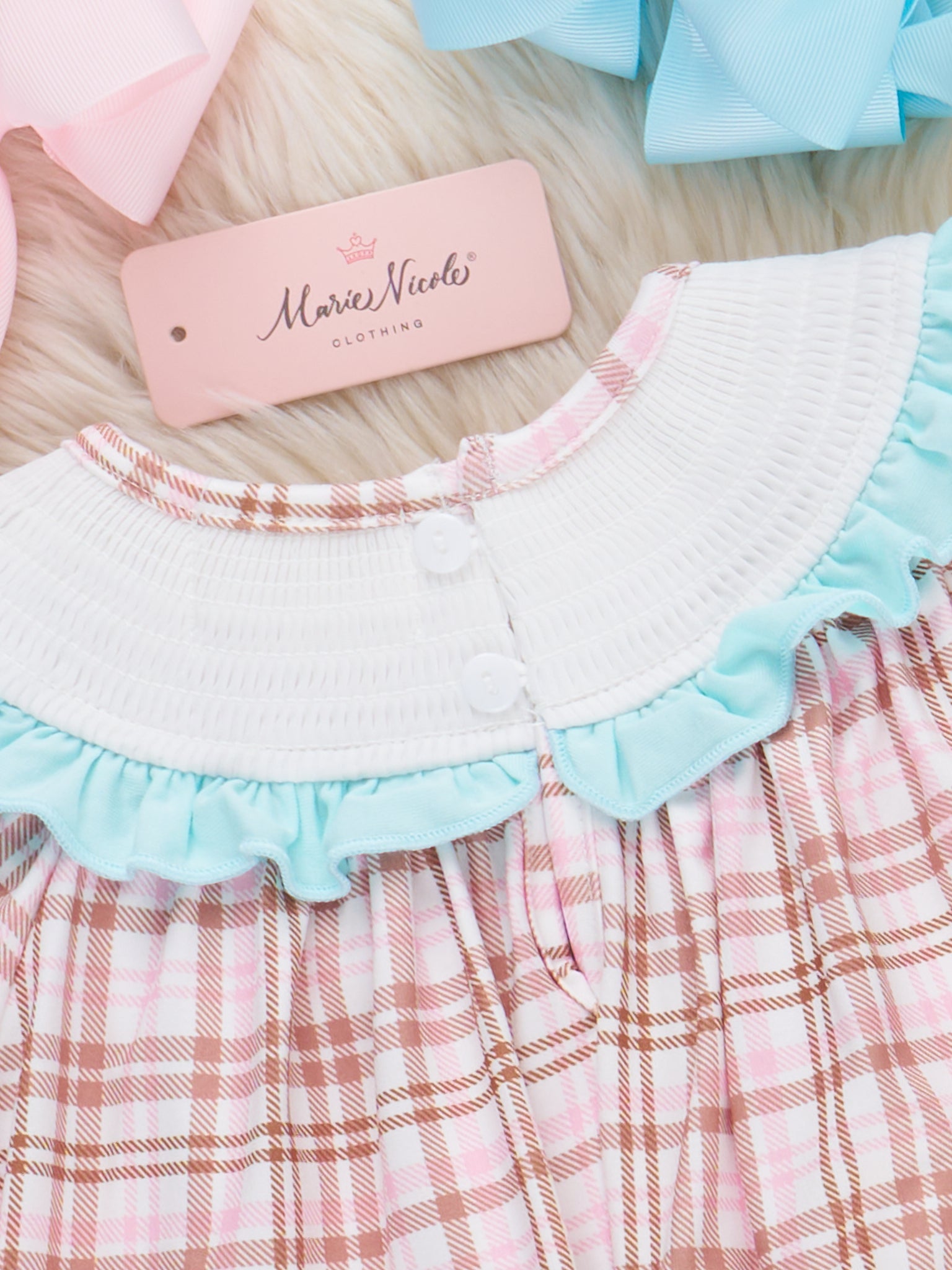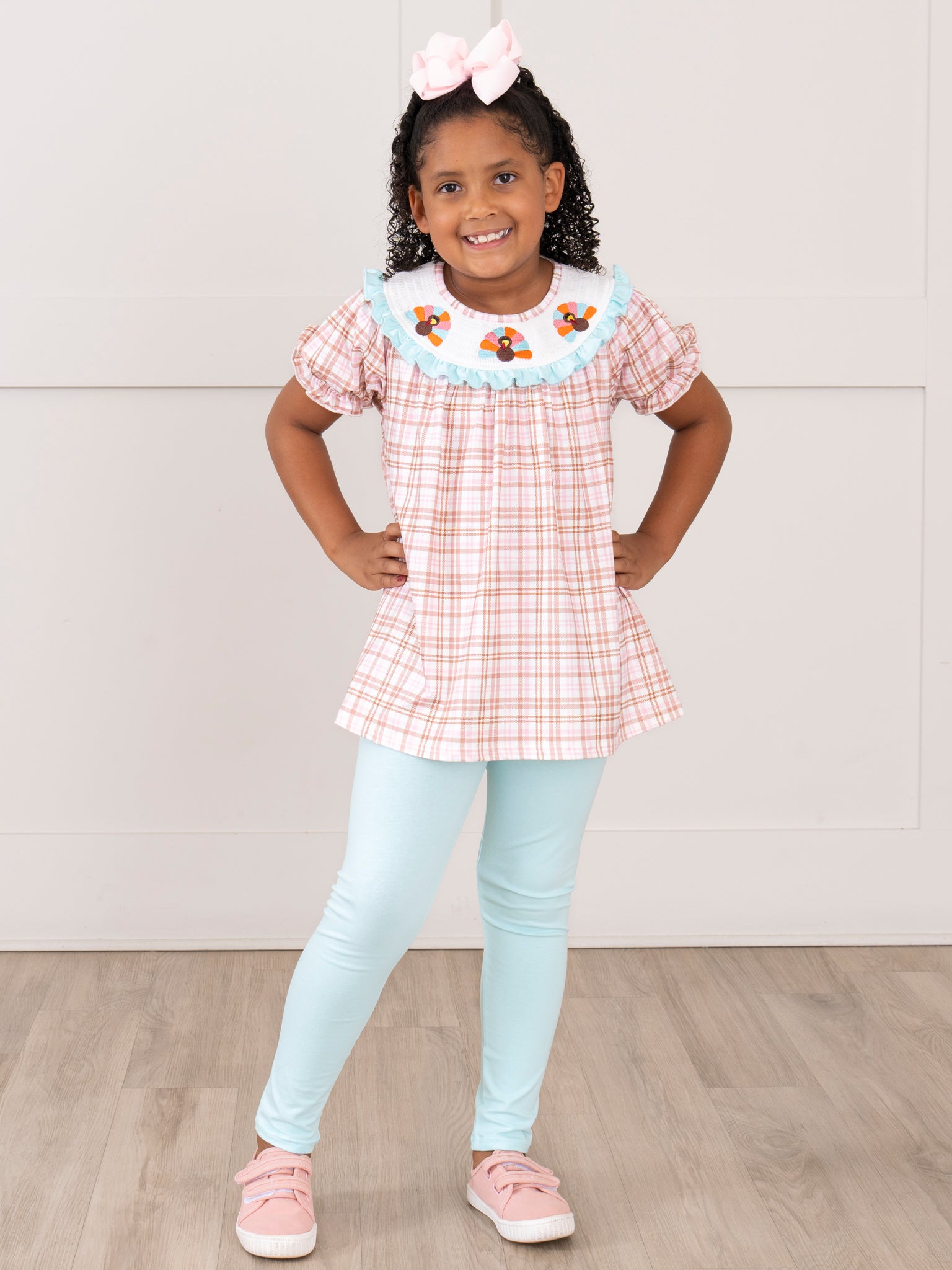 The Turkey Trot Smocked Outfit by Marie Nicole Clothing features a pastel plaid top with smocked turkey embroidery and a blue ruffle-trimmed neckline, paired with coordinating light blue leggings. This set is ideal for Thanksgiving celebrations, family gatherings, and comfortable, festive seasonal style.