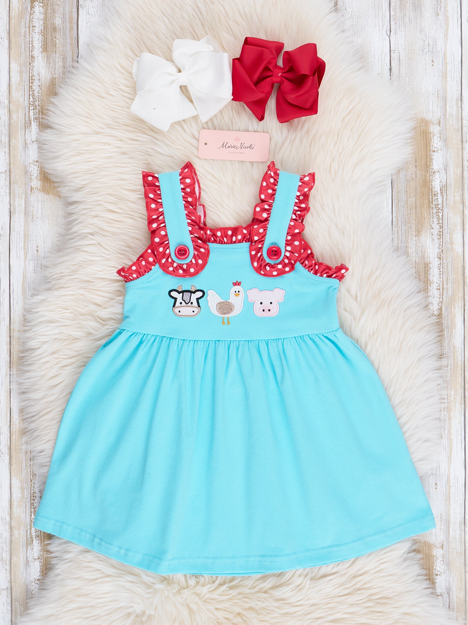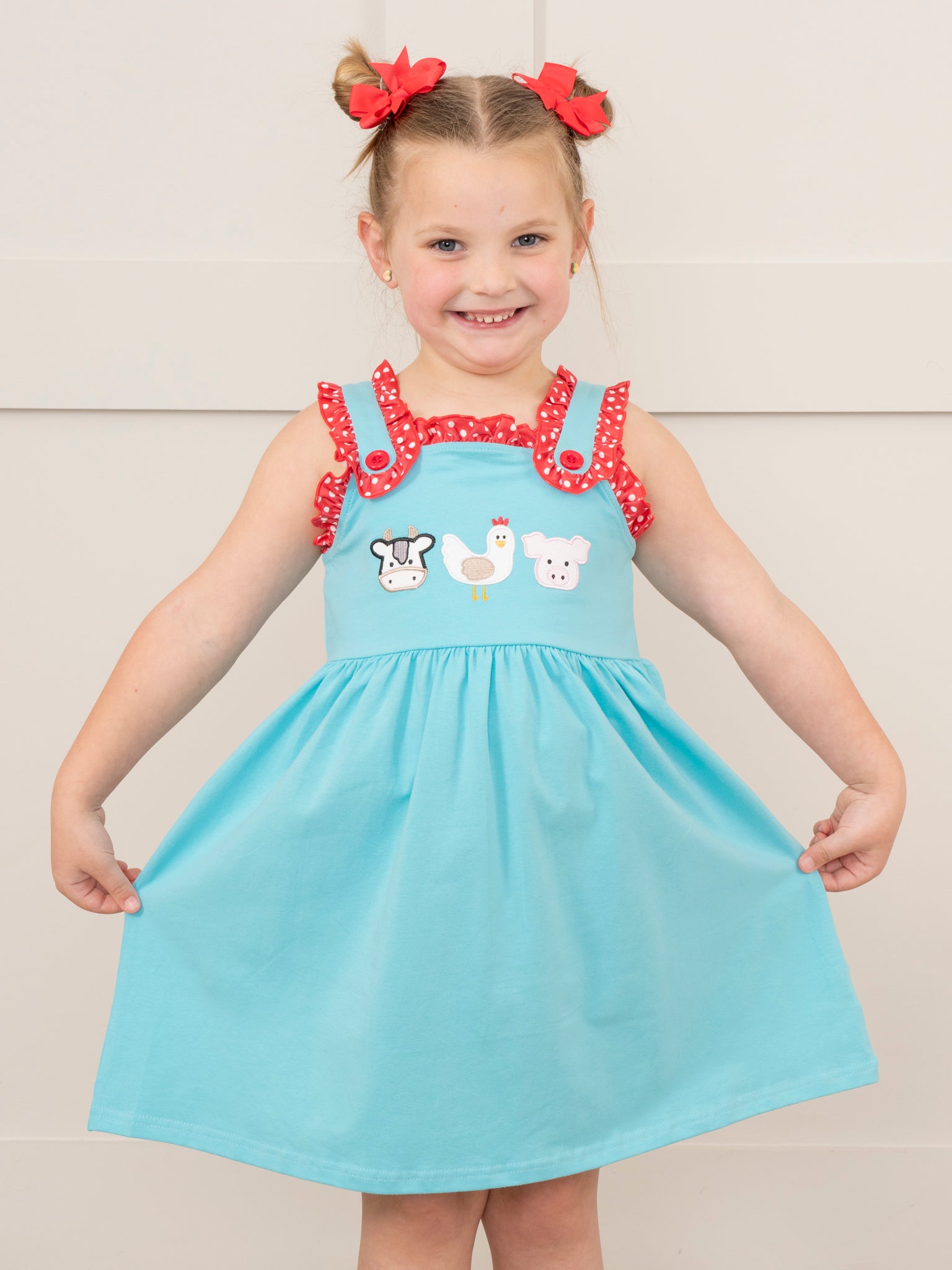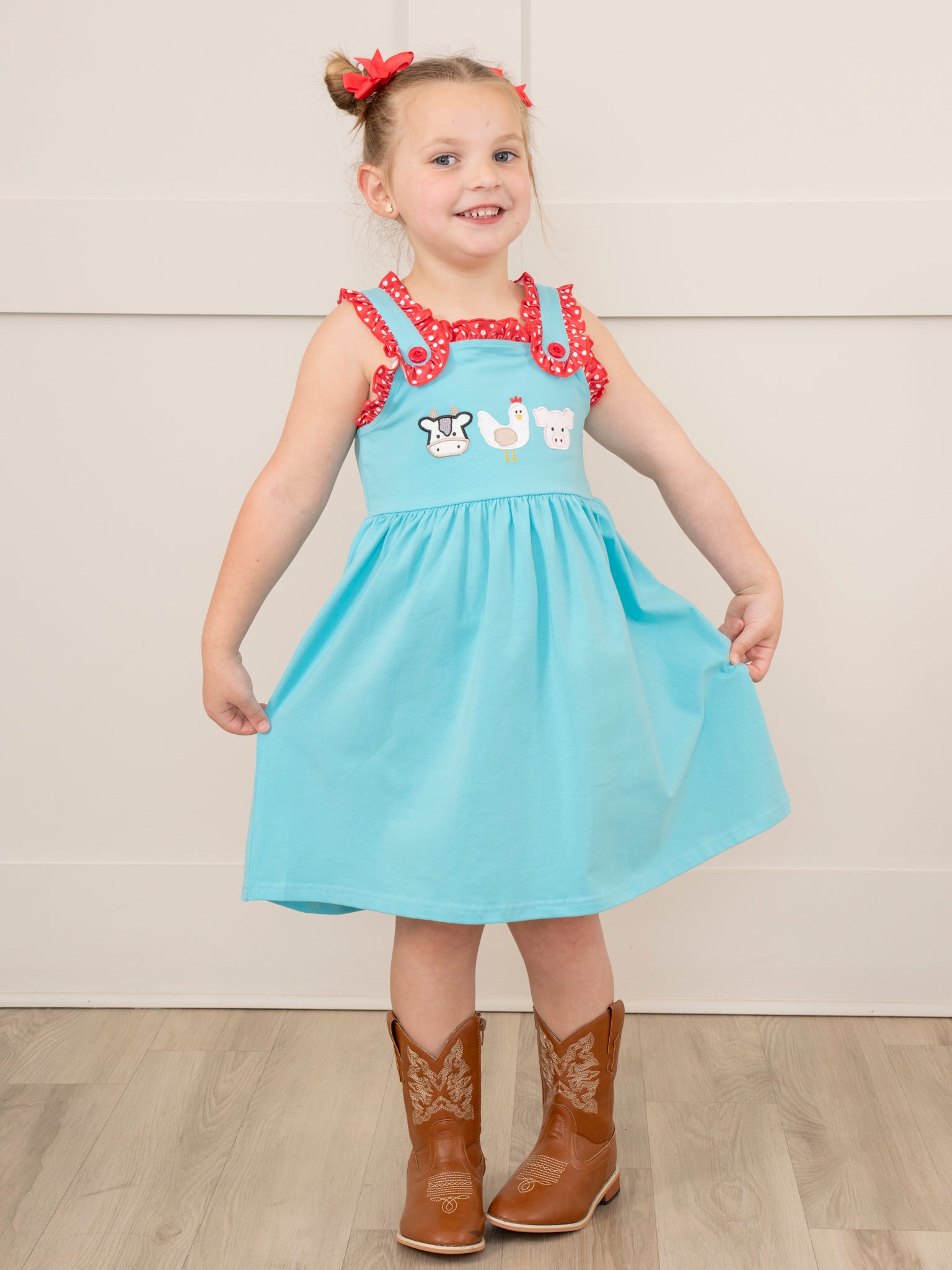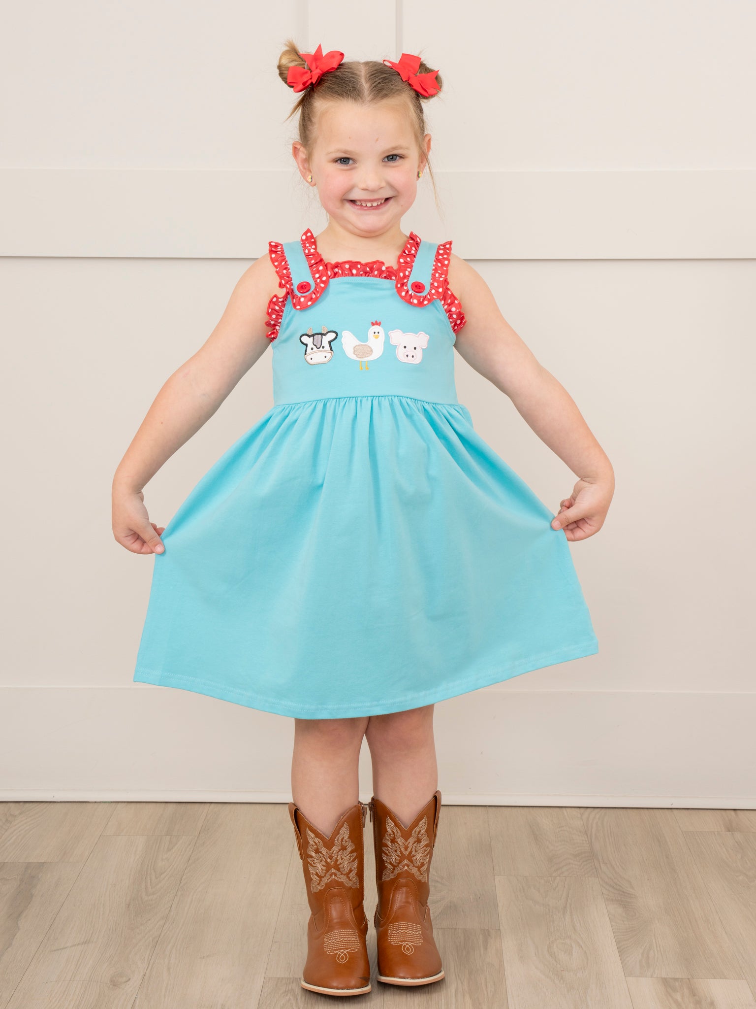 Turquoise Embroidered Farm Friends Ruffle Dress