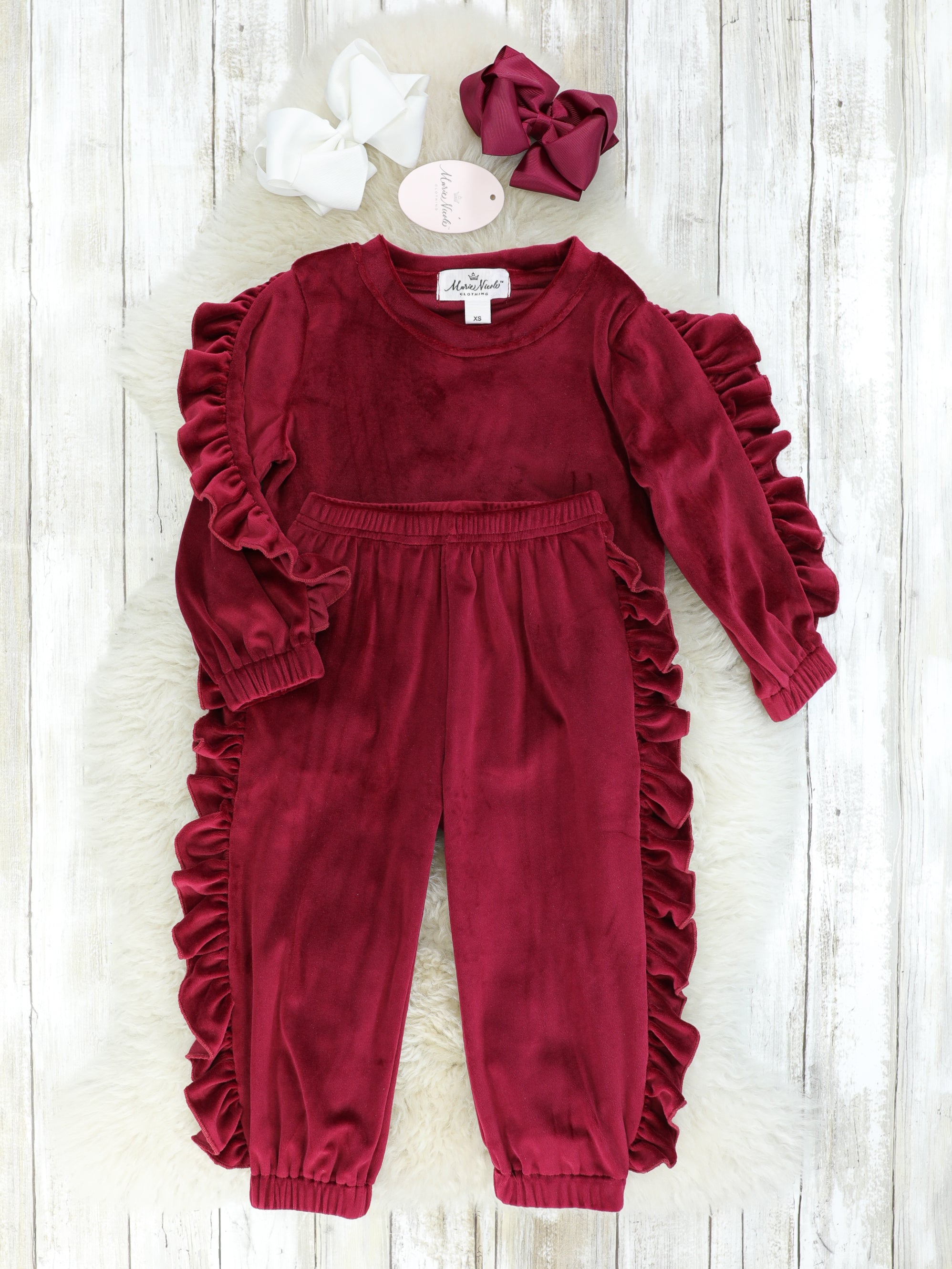 Burgundy Velvet Ruffle Pullover & Jogger Outfit