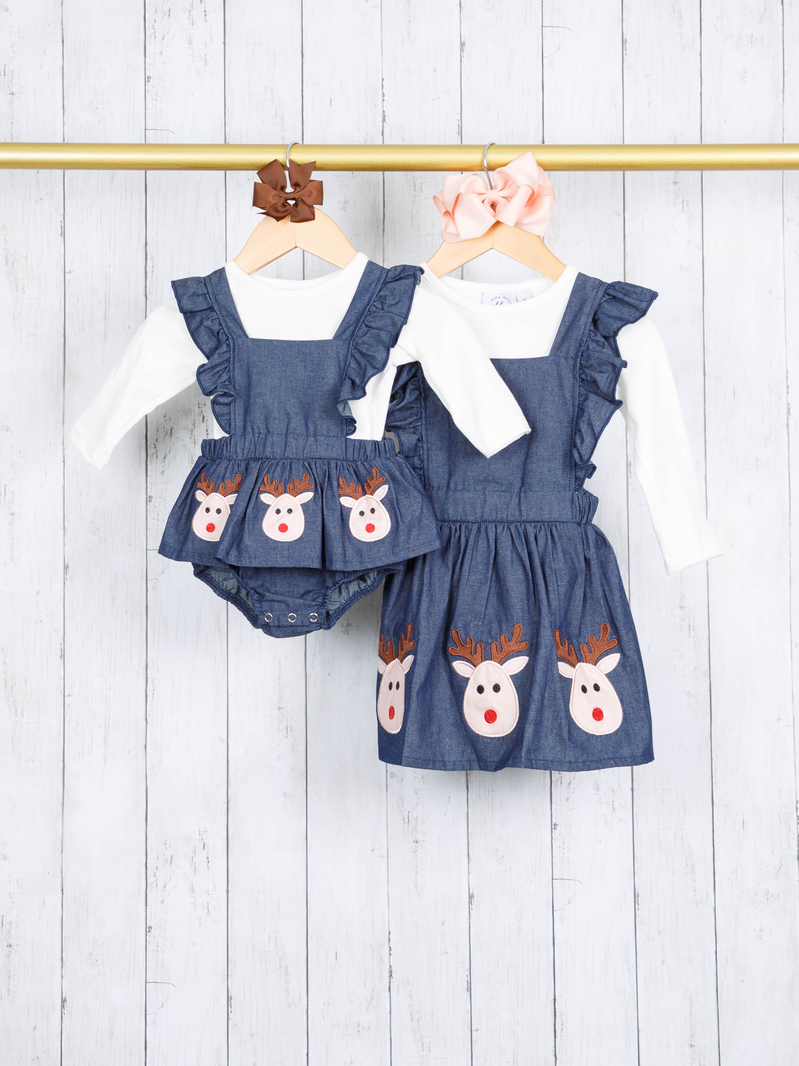White Top & Chambray Reindeer Sister Set