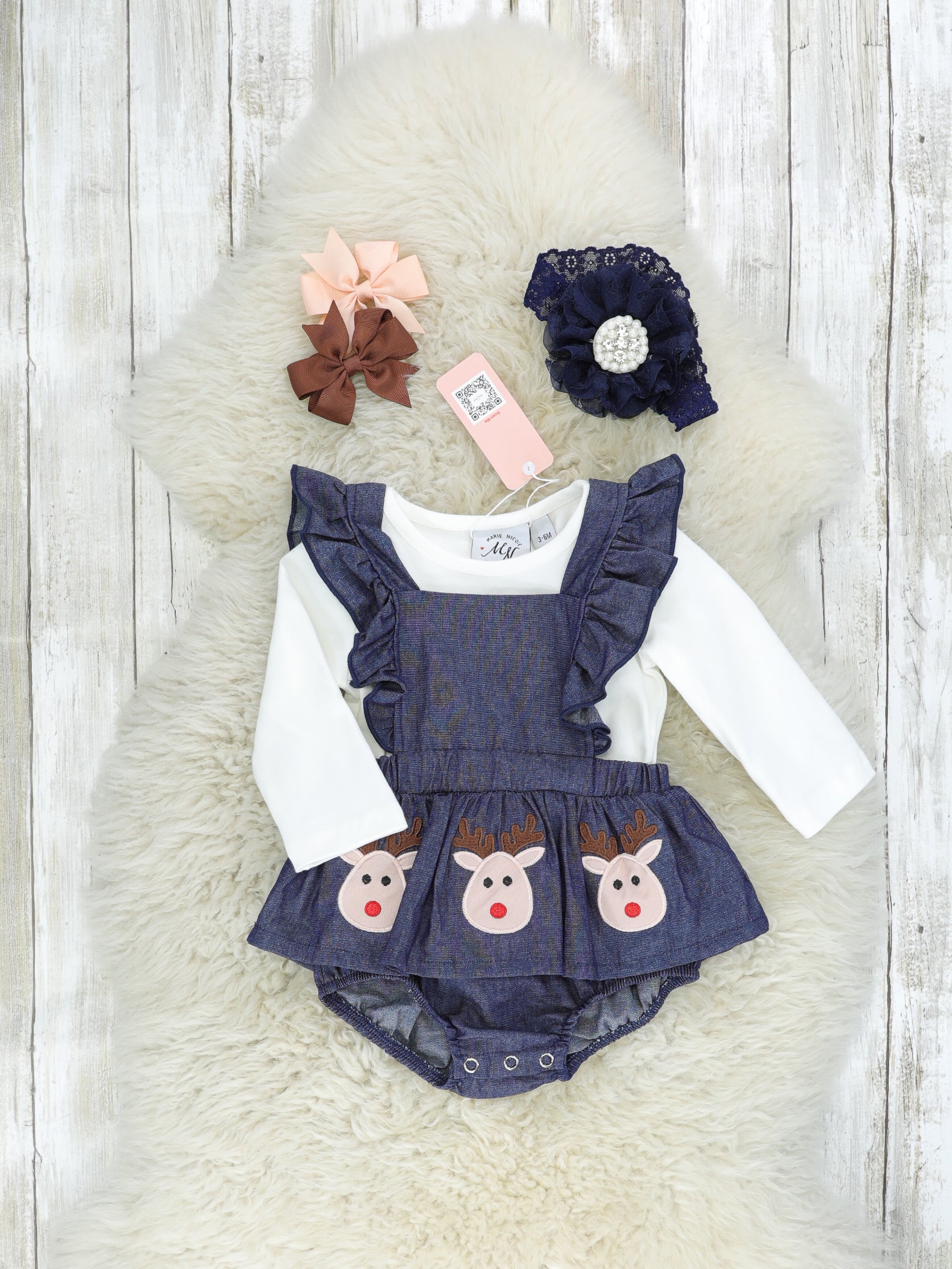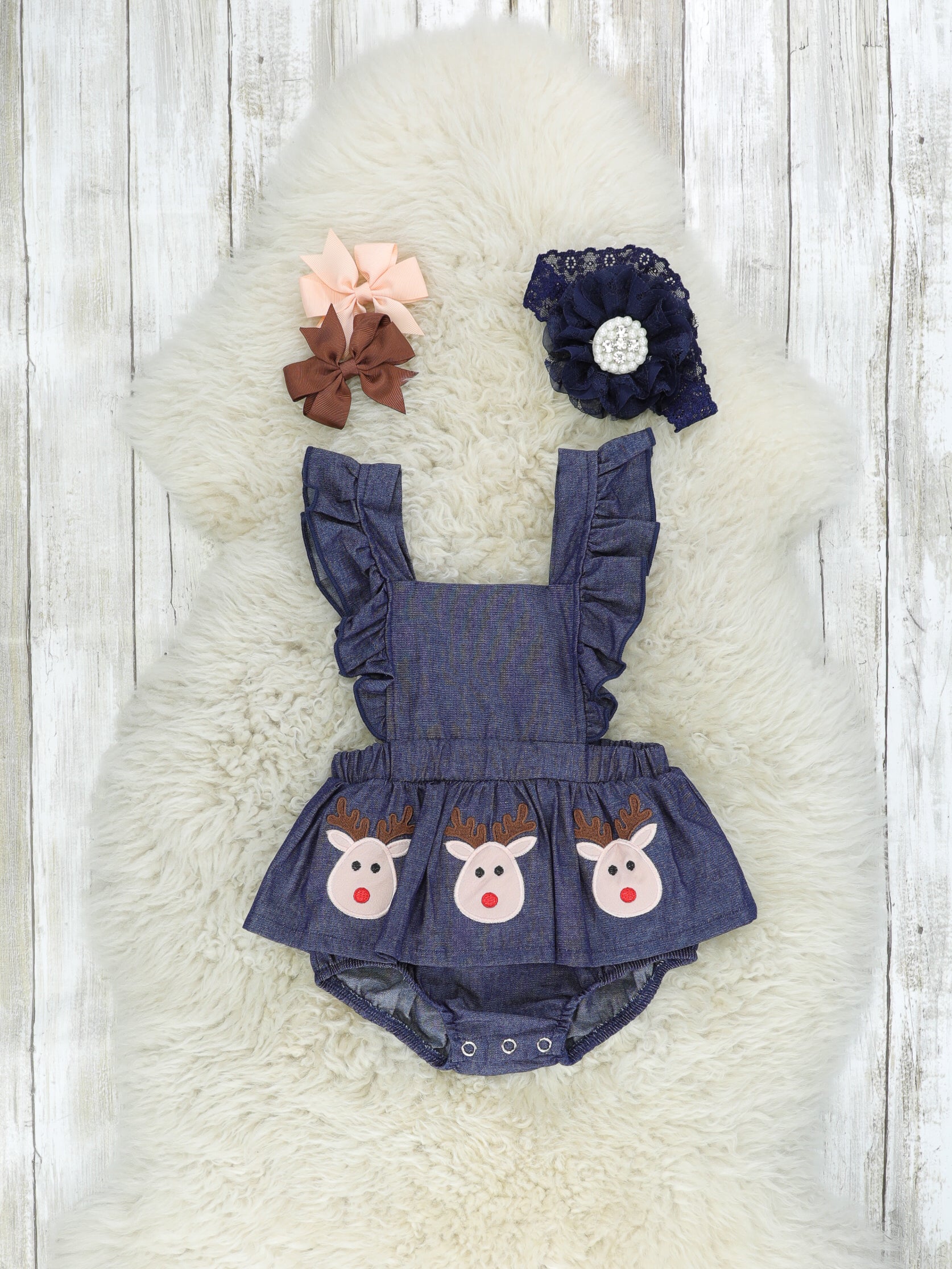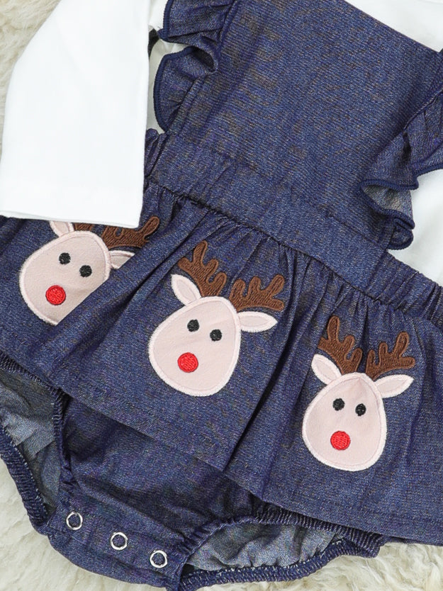 White Top & Chambray Reindeer Ruffle Romper
