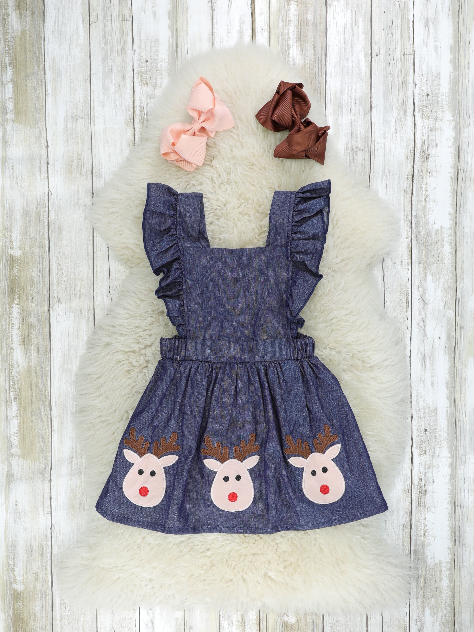 White Top & Chambray Reindeer Ruffle Dress