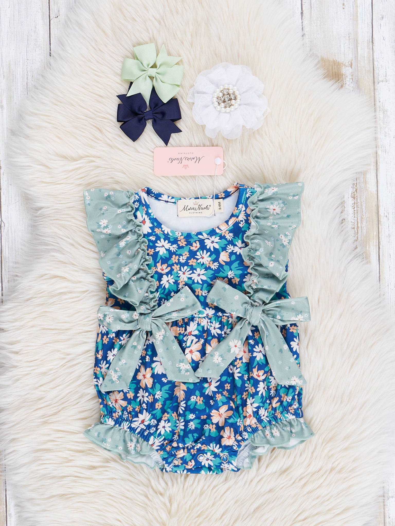 Introducing our Blue & Green Wildflowers Ruffle Bubble. This adorable bubble features a charming ruffle hem for added cuteness and a sweet bow detail. Perfect for your little one's playful adventures, it will keep them comfortable and stylish at the same time.