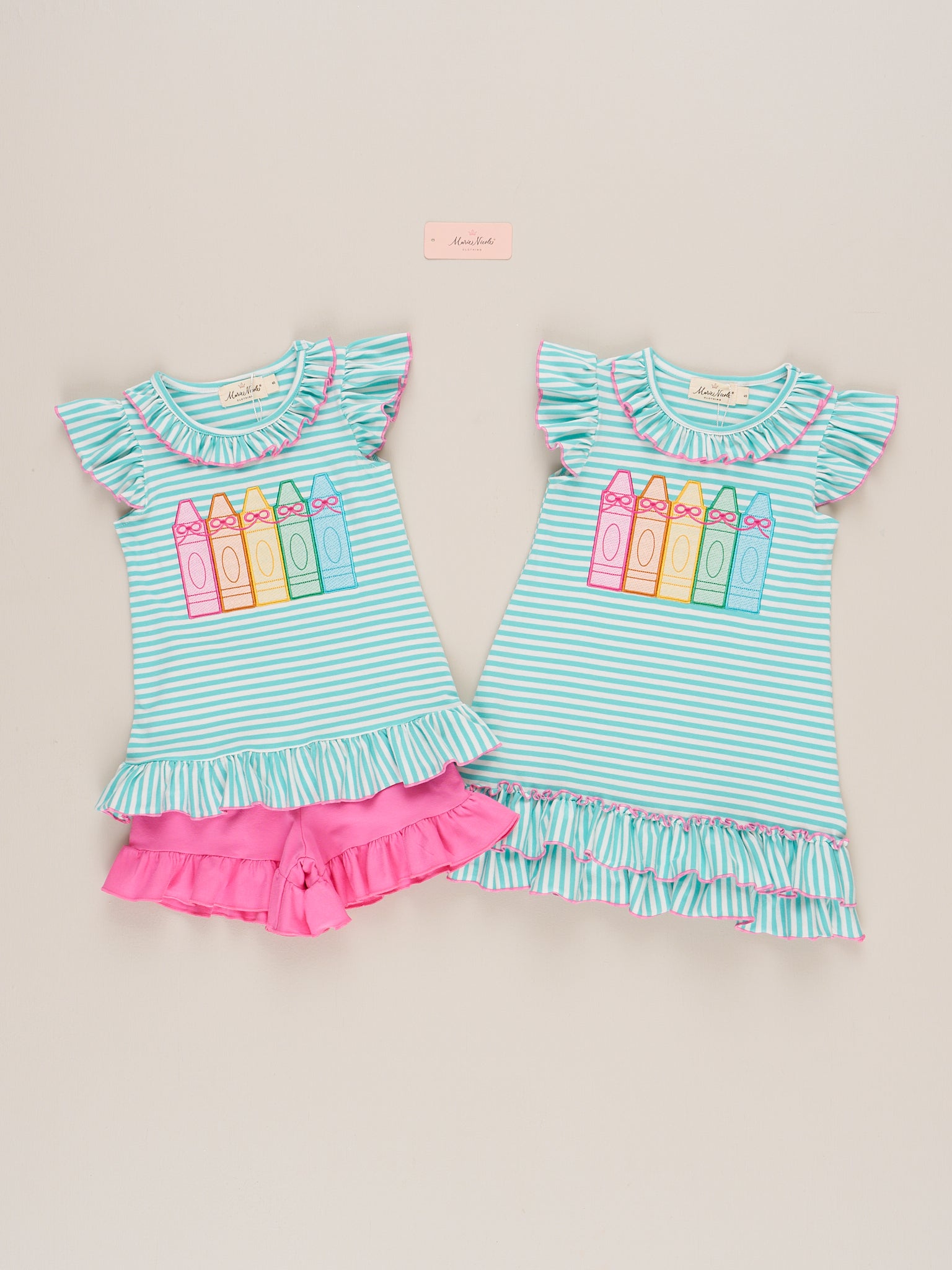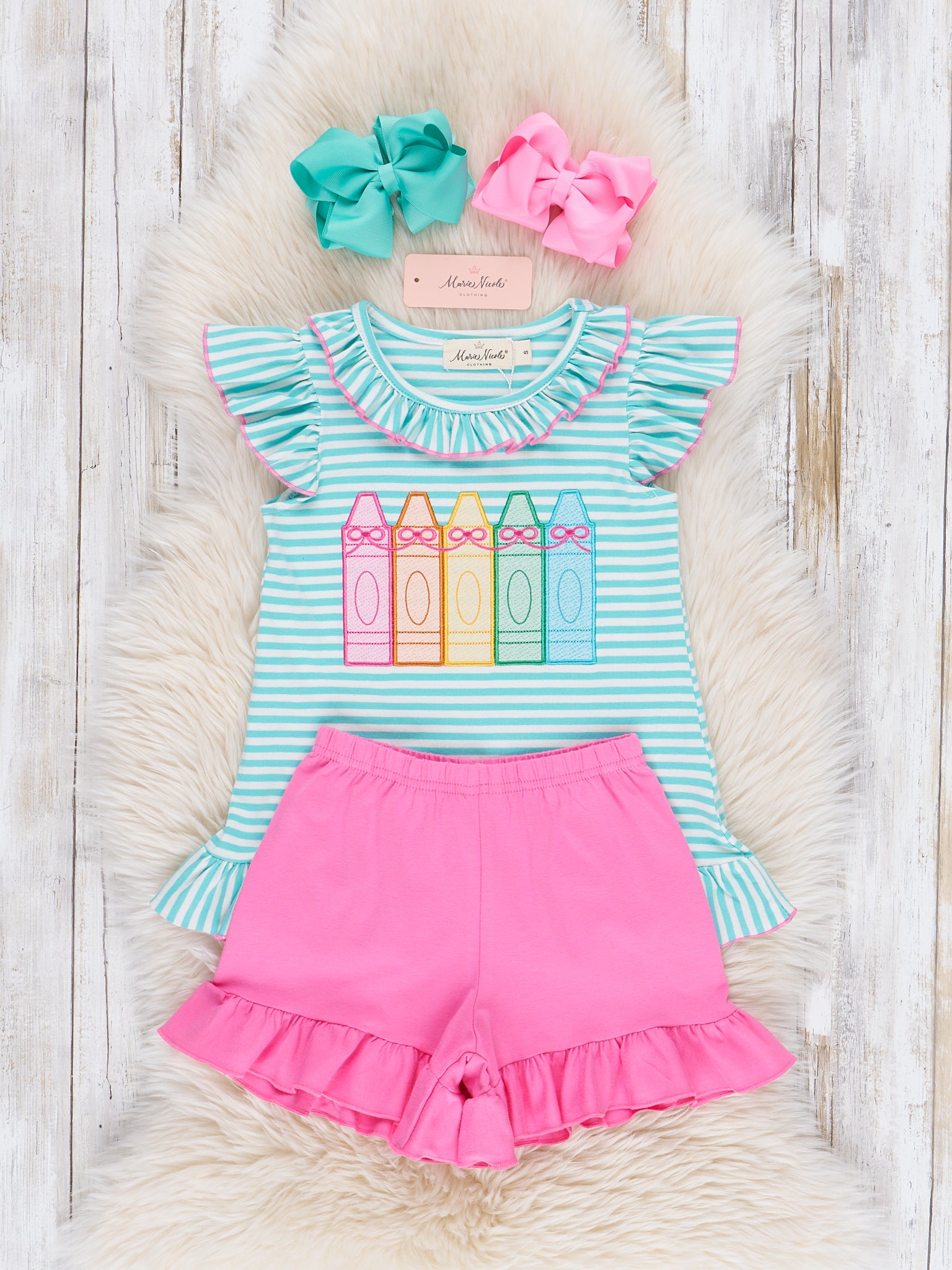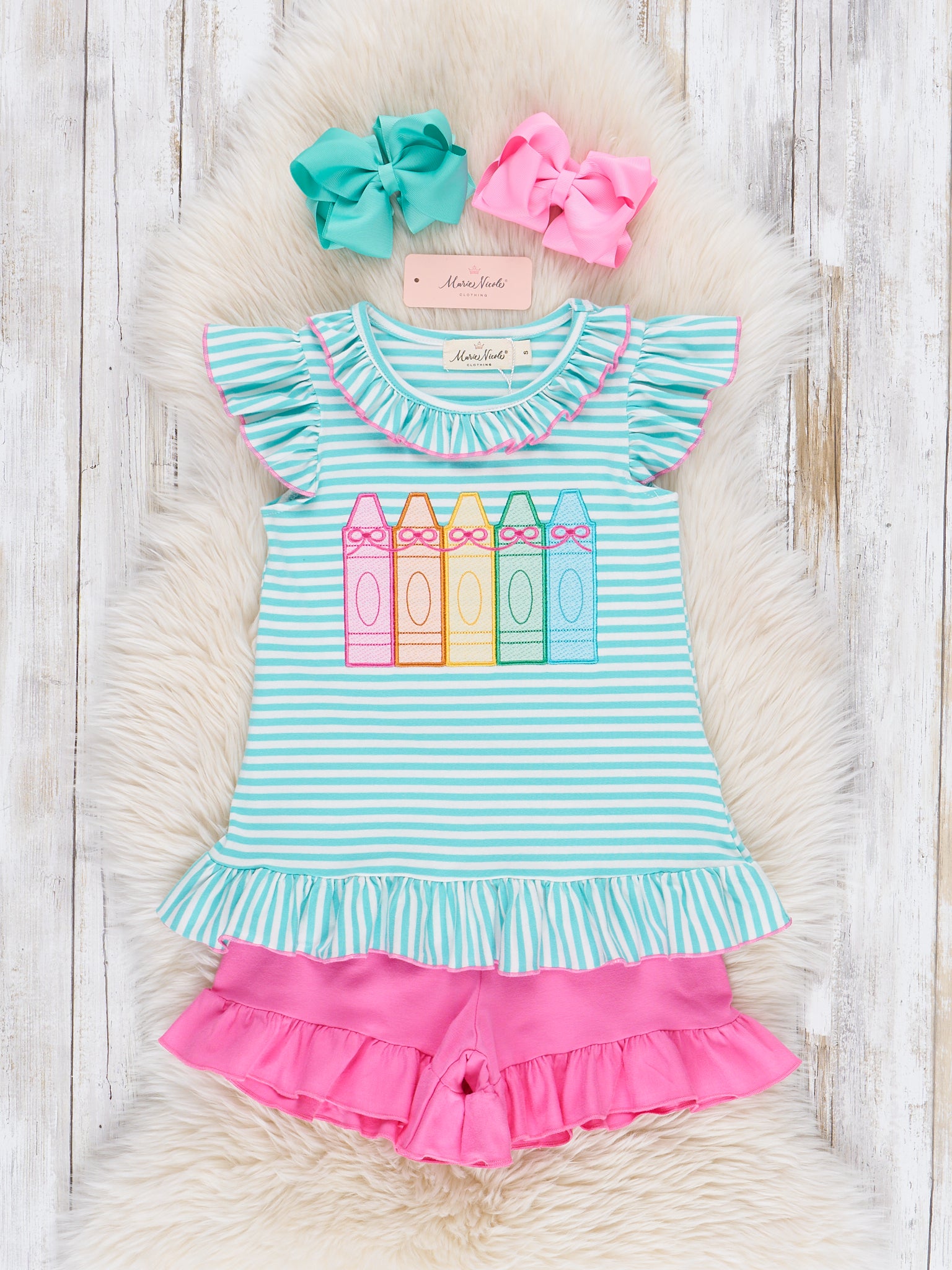 The Color Me Happy Striped Crayon Outfit is a bright and cheerful favorite that’s perfect for back-to-school and playful days. Featuring colorful stripes and fun crayon details, this outfit from Marie Nicole Clothing brings creativity and charm to her everyday wardrobe. Lightweight and comfortable, it’s ideal for classroom fun, art time, or any day she wants to shine in full color.