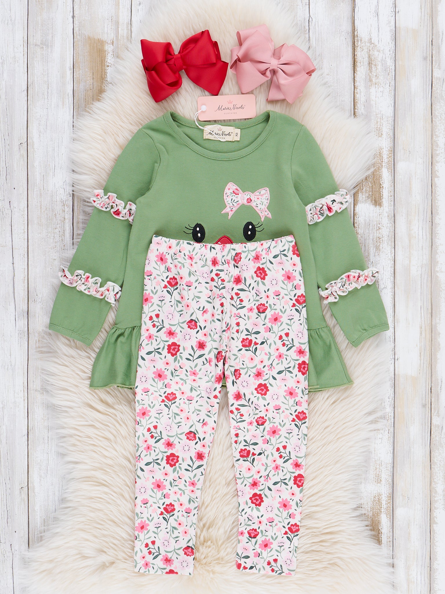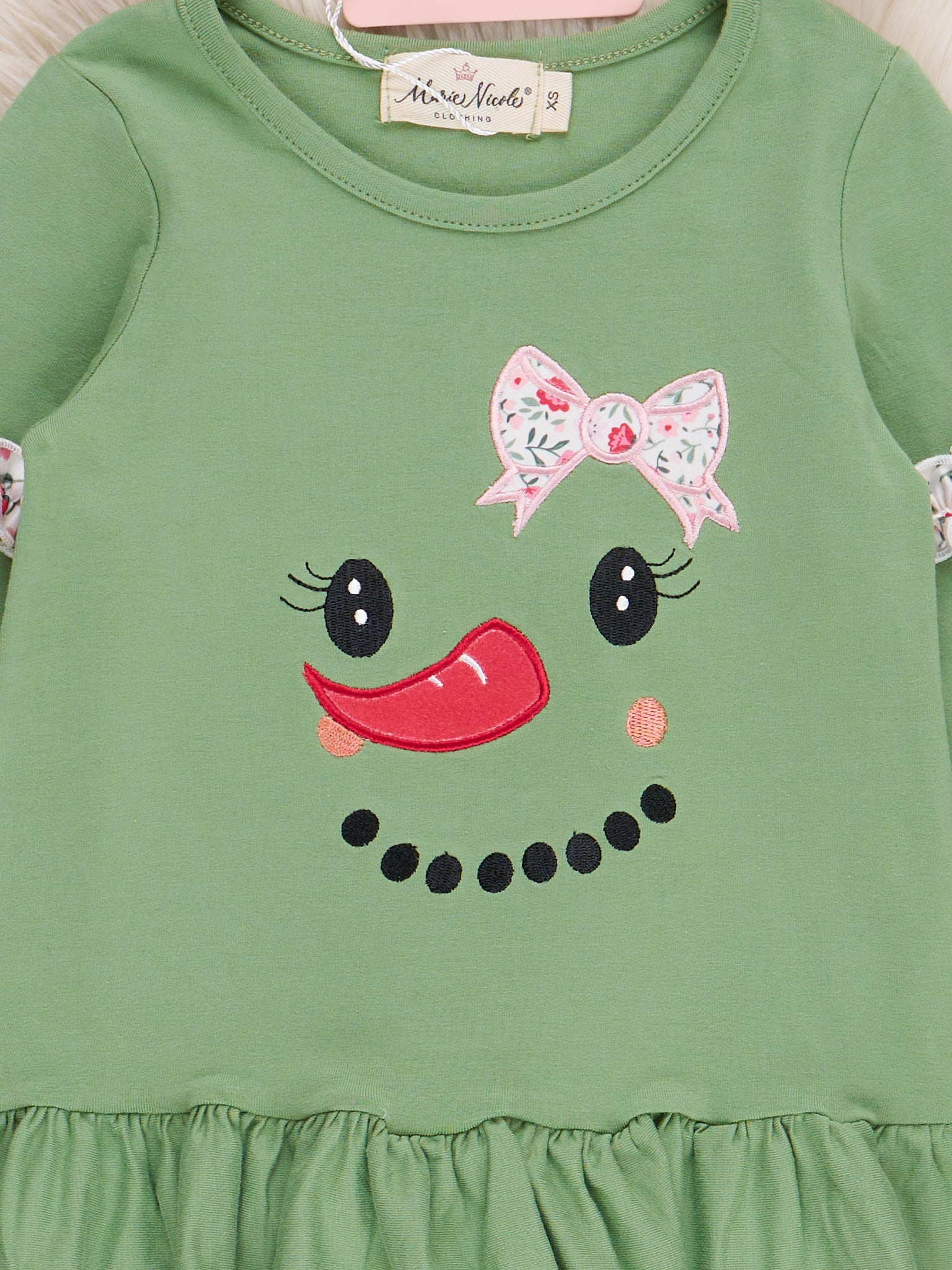 Get your little girl ready for winter fun with the Green Floral Snowgirl Ruffle Outfit! This sister set includes a playful green top adorned with a cute snowgirl design and matching floral leggings. Perfect for a day on the slopes or just playing in the snow, this outfit is sure to keep her warm and stylish.