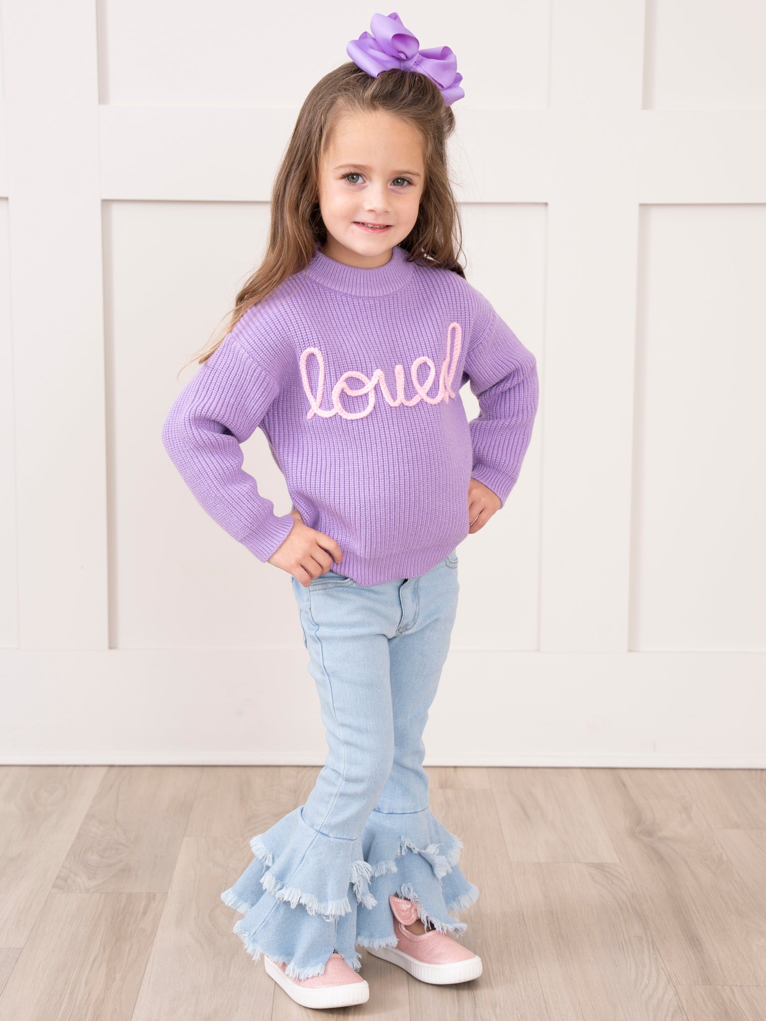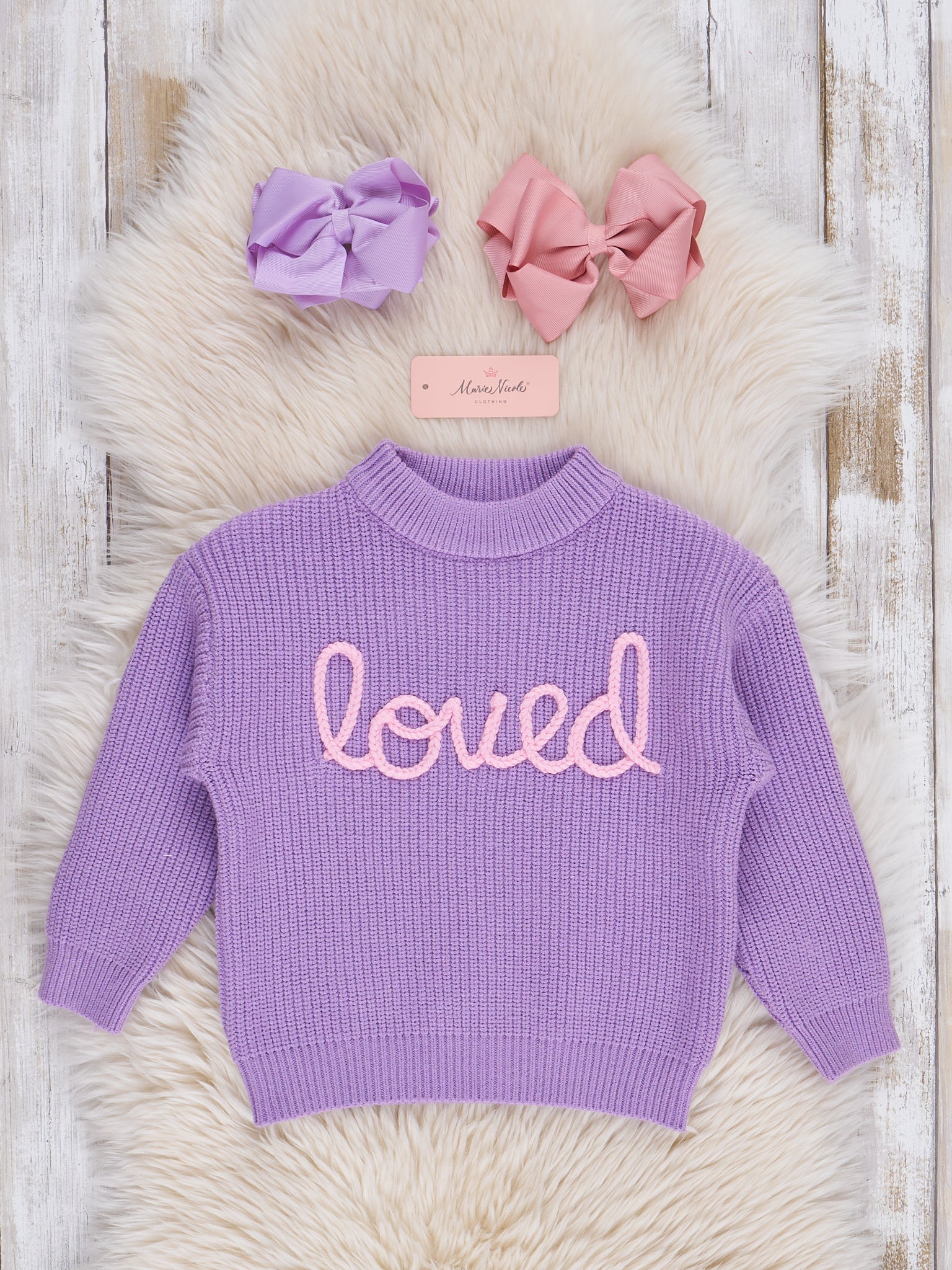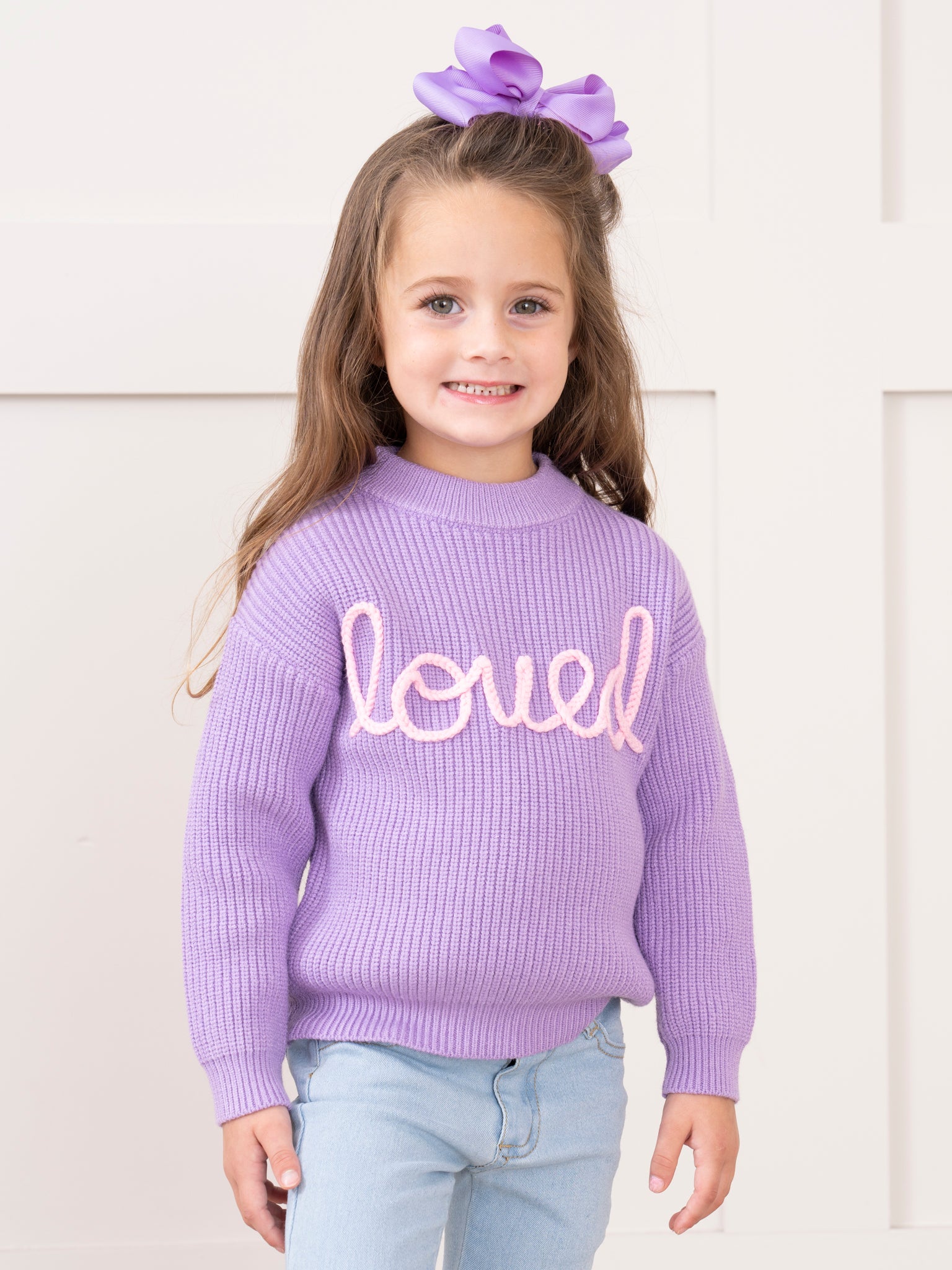 Get ready to be the sweetest thing this Valentine's Day in our Lilac Embroidered "Loved" Sweater. Made for girls, this rib knit sweater features a playful mock neck and embroidered "loved" in pink for a touch of charm. Perfect for a cozy yet stylish look!