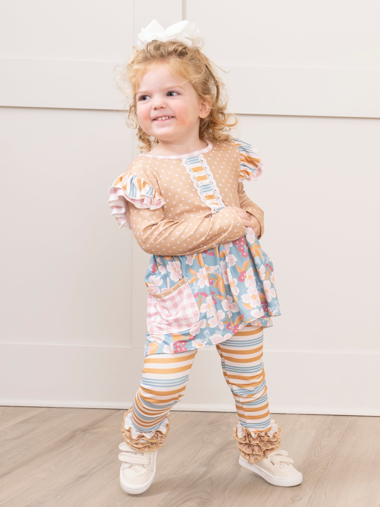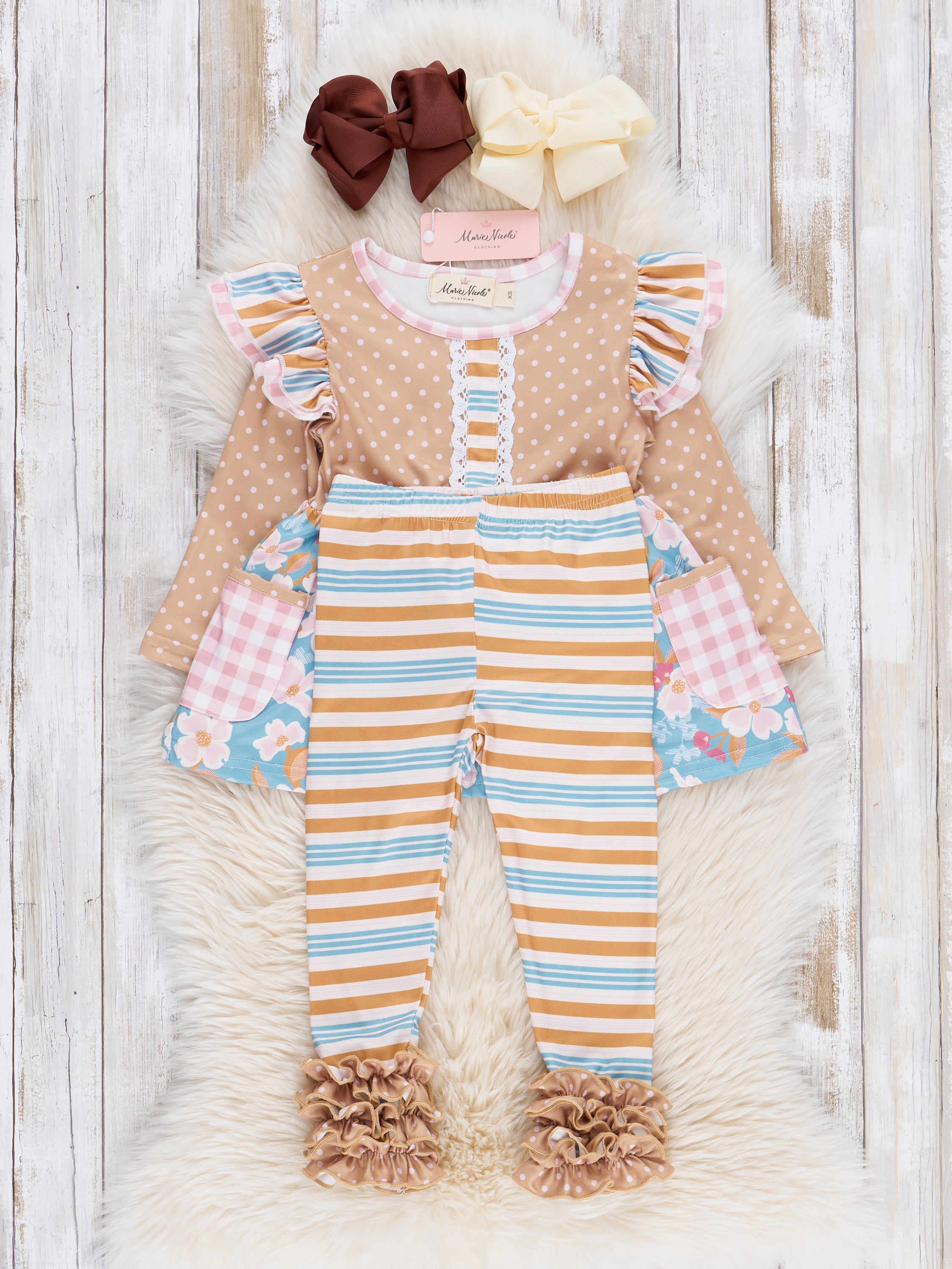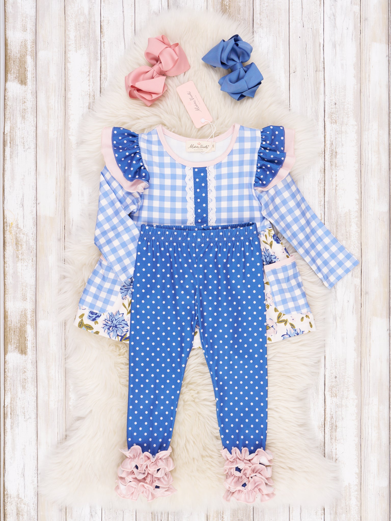 Say hello to fall with the Mixed Print Ruffle Sister Set! Featuring a fun mixed print of gingham, stripes, polka dots, flowers, and ruffle details, this is the perfect outfit to go from late summer to early fall! Available in Blue Plaid and Tan Dot.