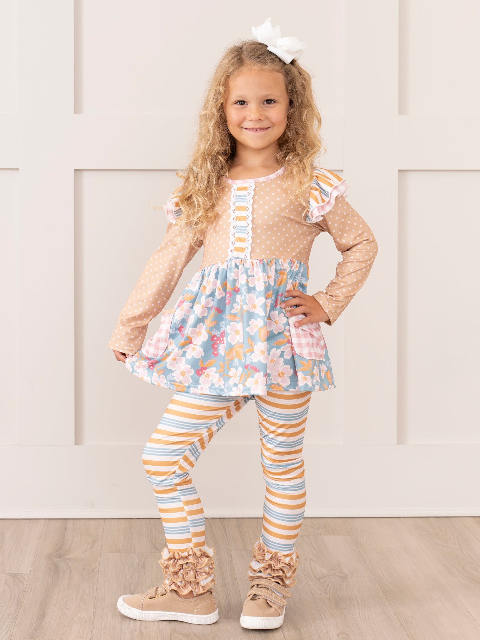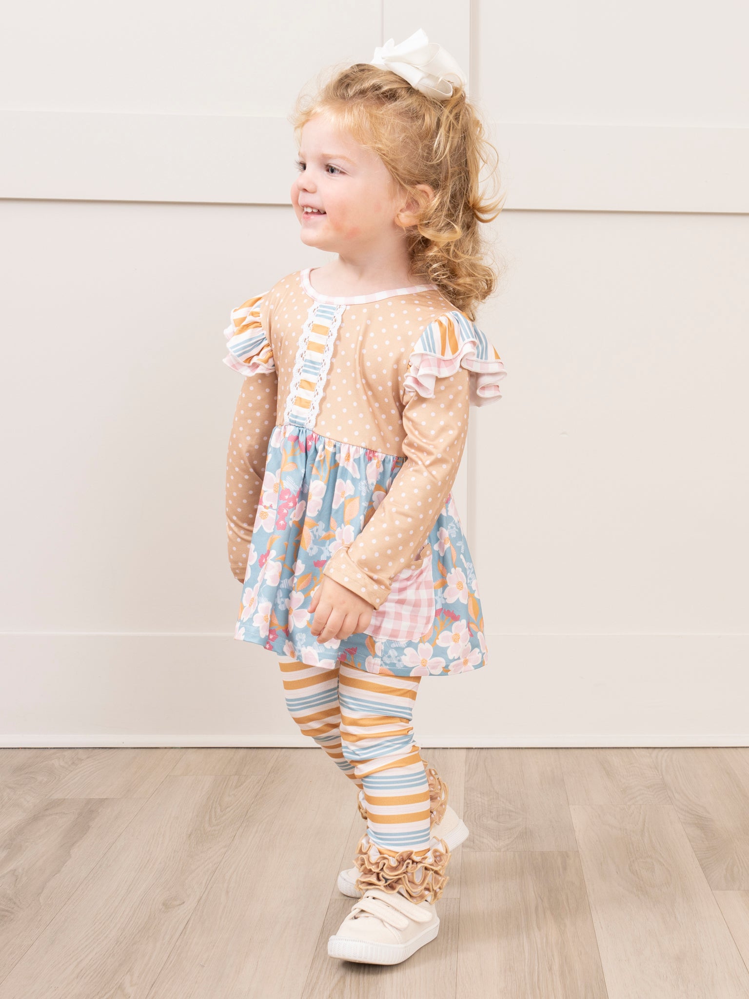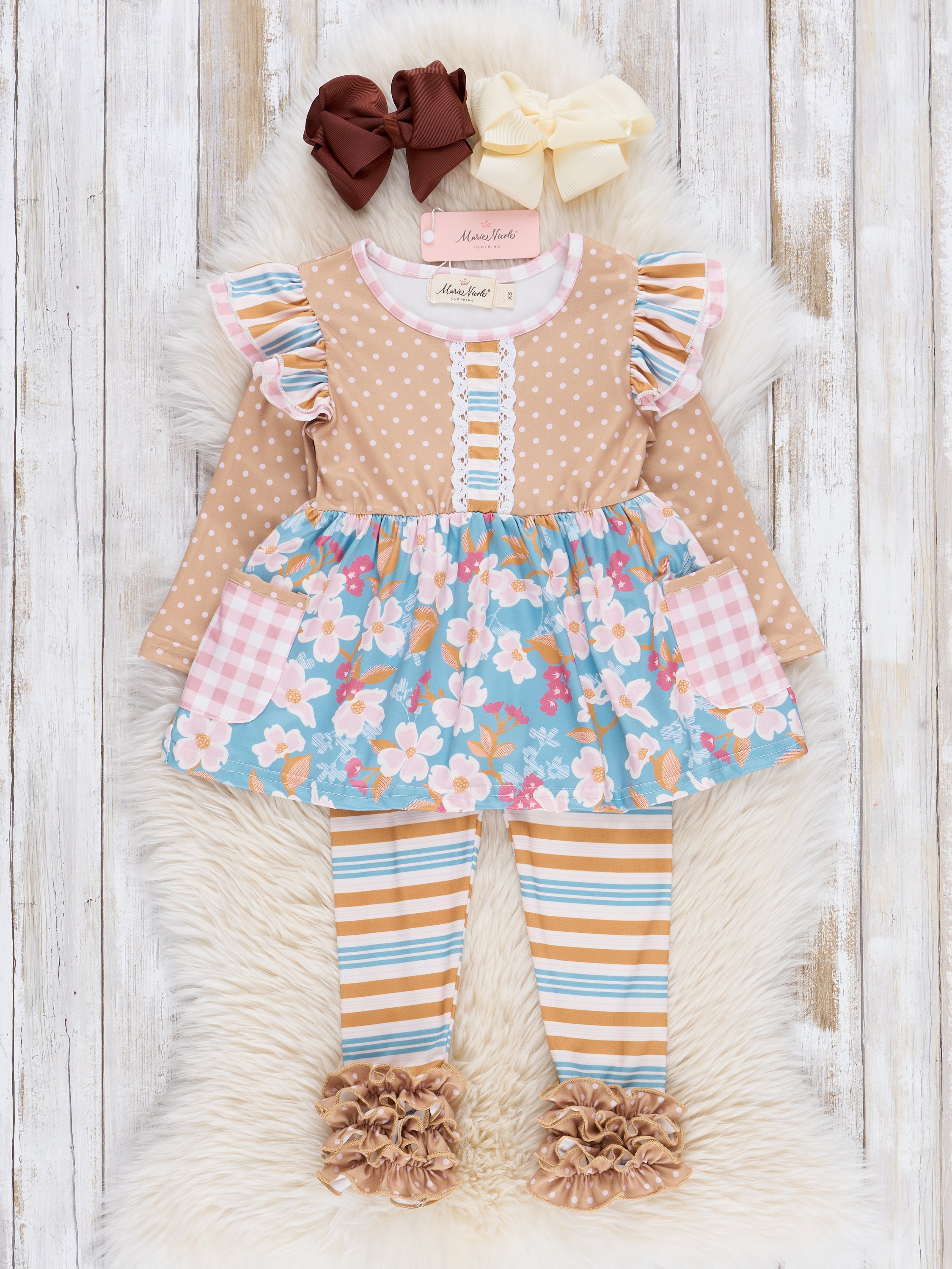 Say hello to fall with the Mixed Print Ruffle Sister Set! Featuring a fun mixed print of gingham, stripes, polka dots, flowers, and ruffle details, this is the perfect outfit to go from late summer to early fall! Available in Blue Plaid and Tan Dot.