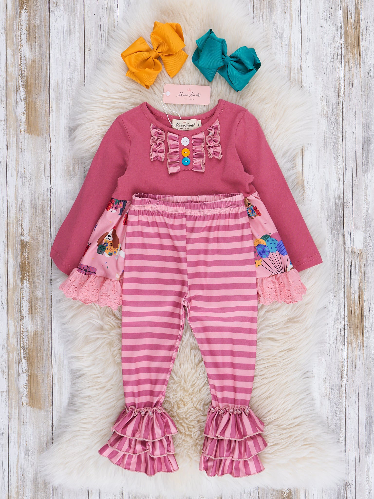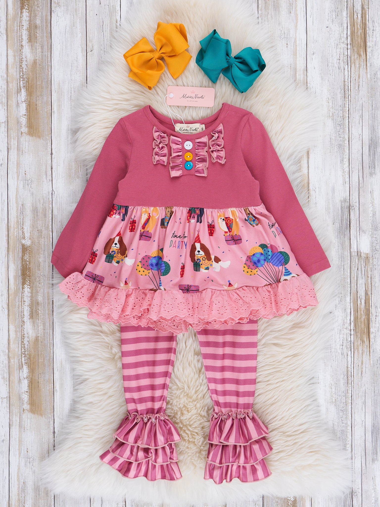 Get your little one party-ready with this chic and playful Magenta Stripes Party Ruffle Outfit. The flare top with a lace layered hem and party print adds a touch of elegance, while the striped tiered ruffle leggings bring a fun and trendy vibe. Perfect for any birthday celebration, your girl will party in style!