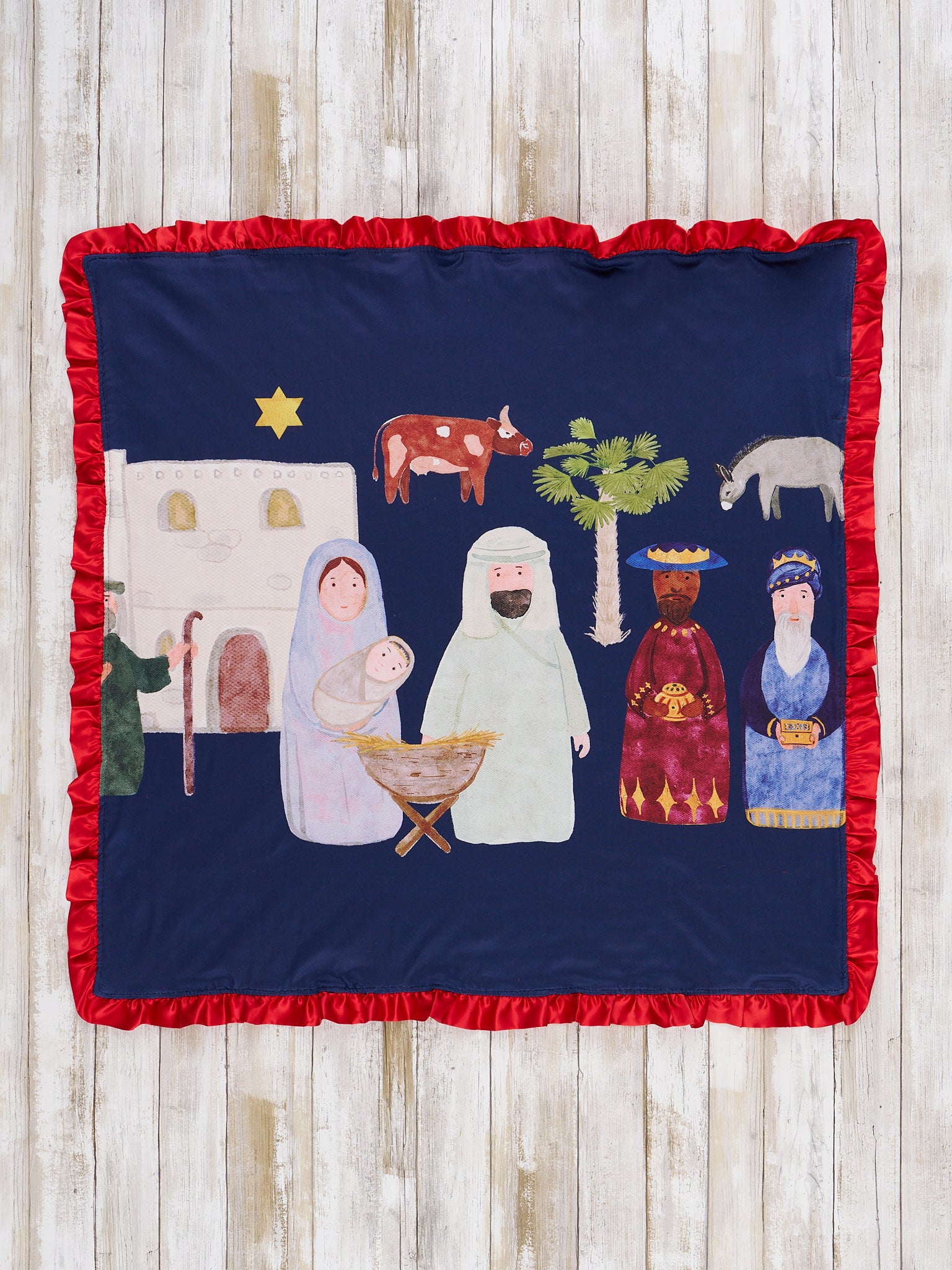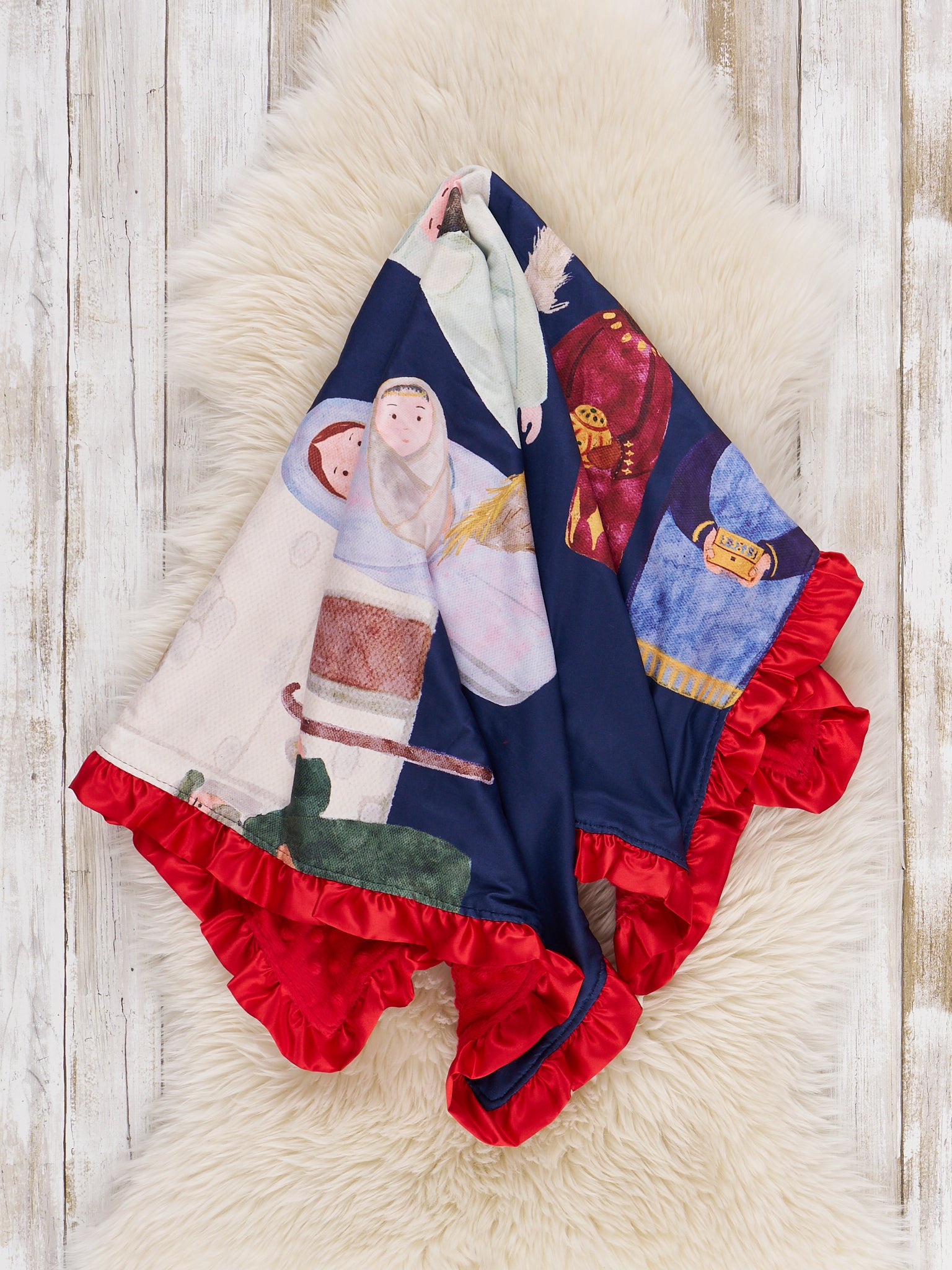 The Night of Nativity Minky Blanket brings the story of Christmas to life! The scene on the fabric is a wonderful gathering of all the important characters at Jesus's birth. The ruffled edge give a festive flare that is perfect for the holidays. Make any day special for your little girl with this lovely blanket!