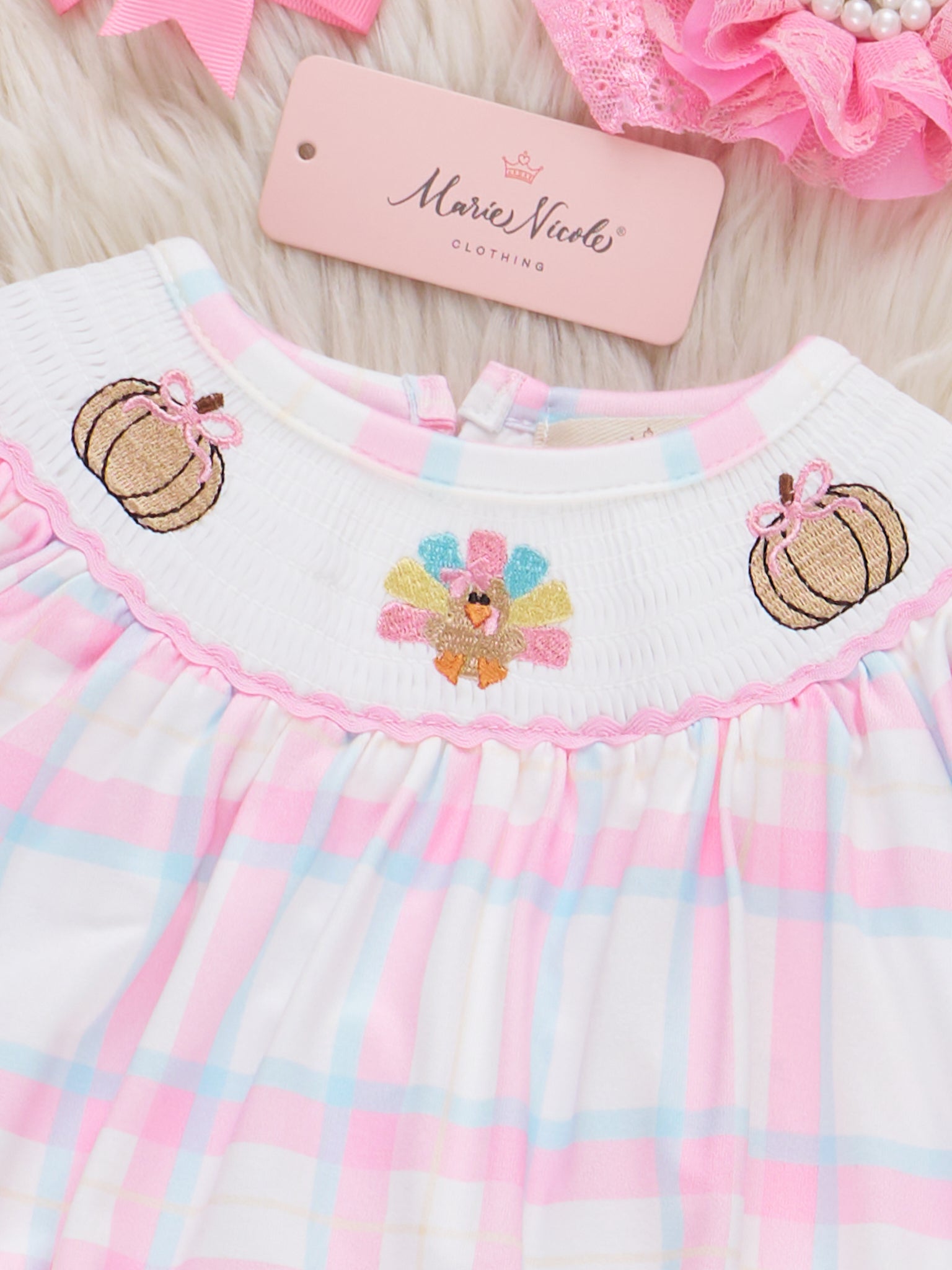 Plaid Smocked Embroidered Pumpkins & Turkey Bubble